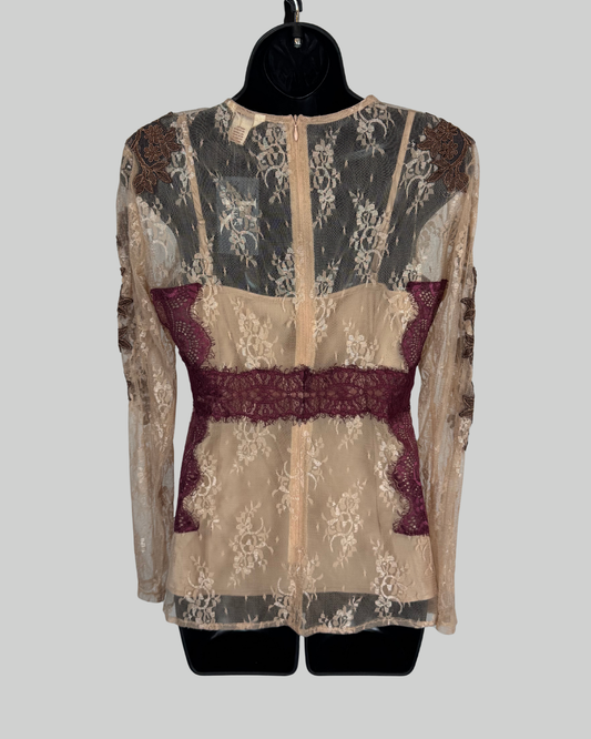 Sundance Nude Turquoise Burgundy Brown Lace Long Sleeve Blouse