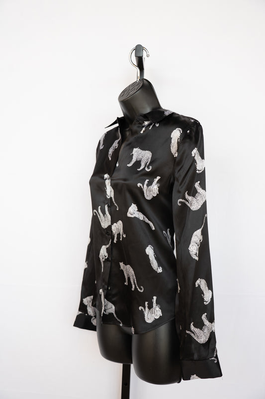 L'Agence Black Silk Long Sleeve Button Down Blouse w/ Leopards NWT