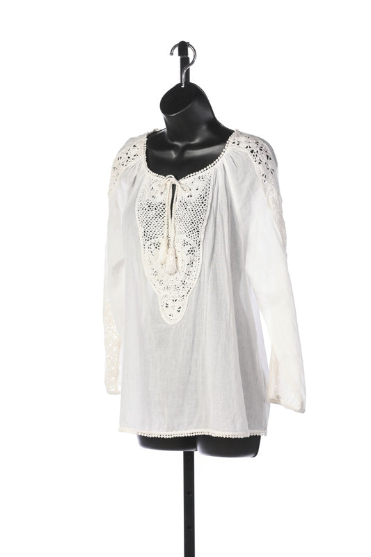 Joie White Tie-Neck w Tassels Long Sleeve Blouse w Crochet Details NWT