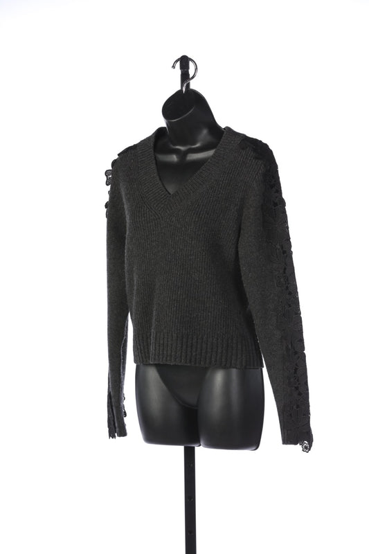 See By Chloe Dark Grey V-Neck Sweater with Black Floral Lace Detail on Sleeves