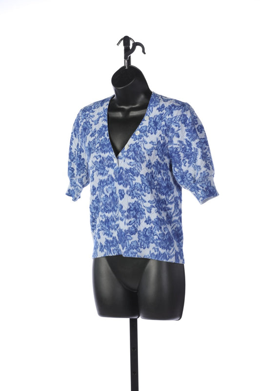 Derek Lam Light Blue w Dark Blue Floral Half-Sleeve Button Neck Sweater