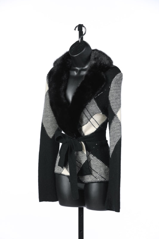Valentino Black & White Plaid Fur Collar Tie Waist Sweater Jacket w Sequin Details