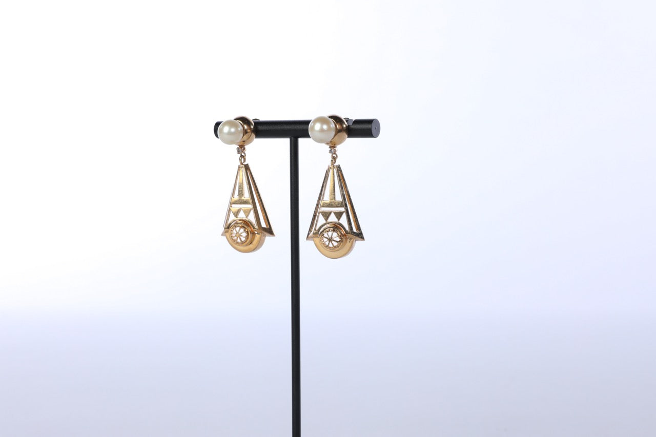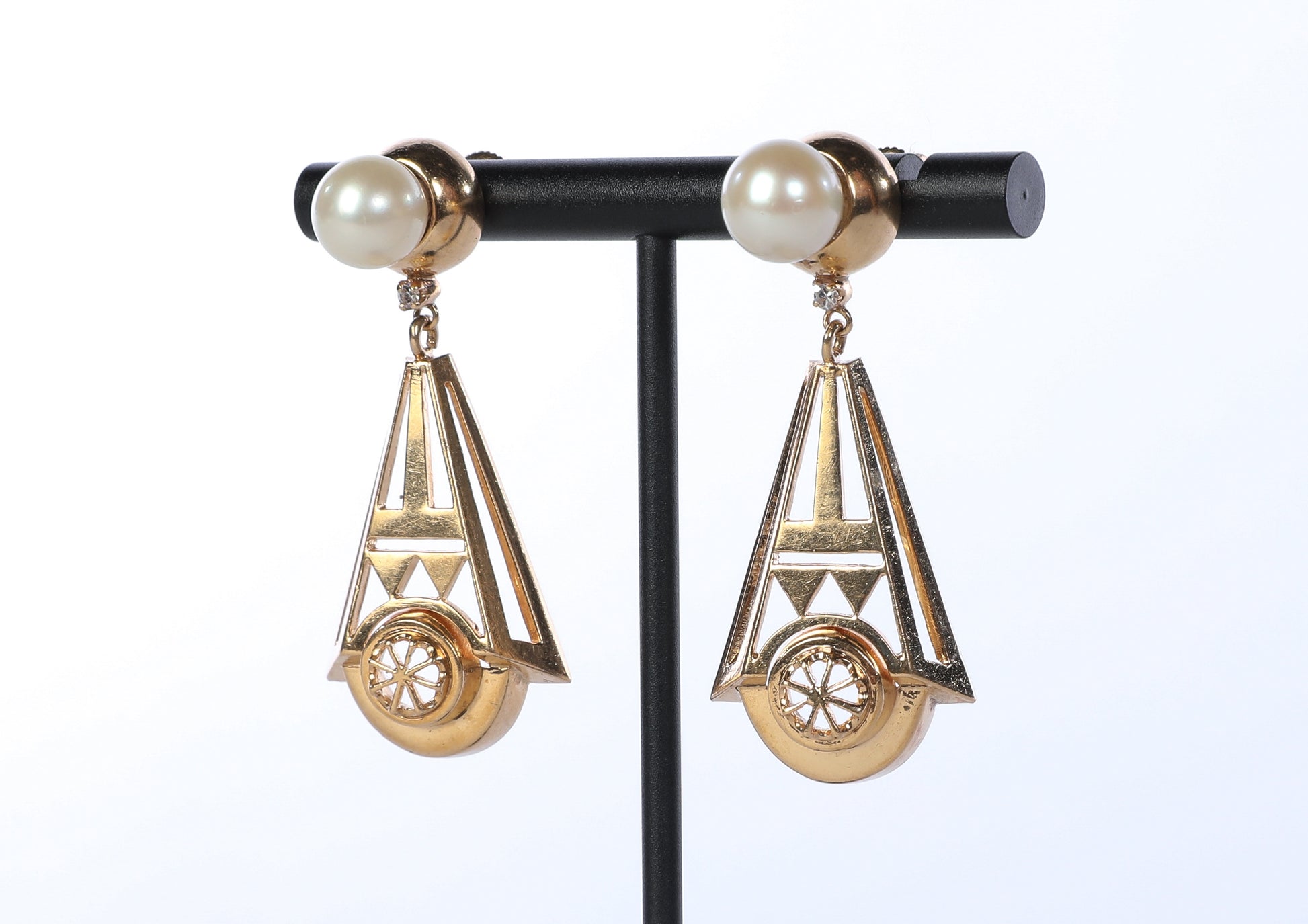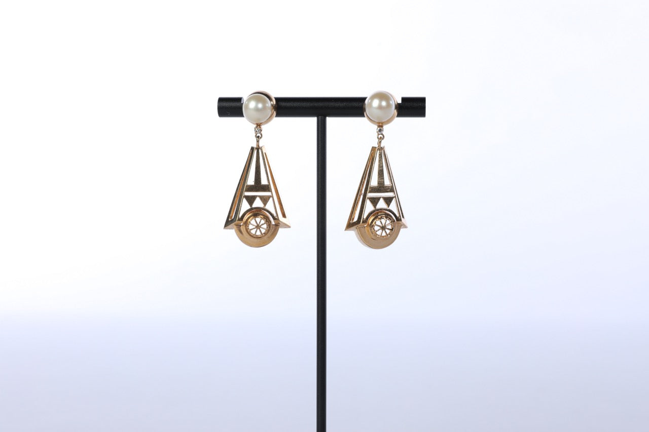 14k Yellow Gold Art Deco 20s Style Dangly Earrings with Pearls and Diamonds