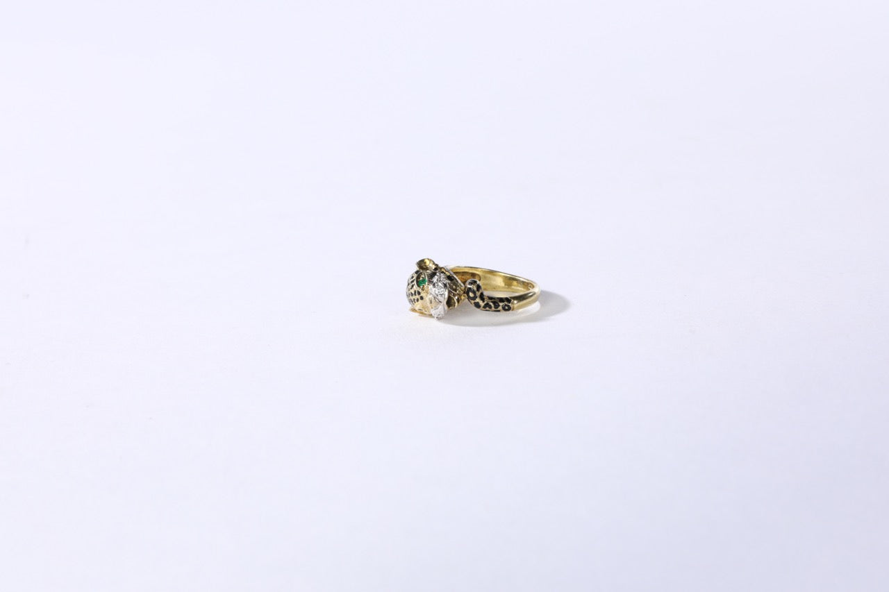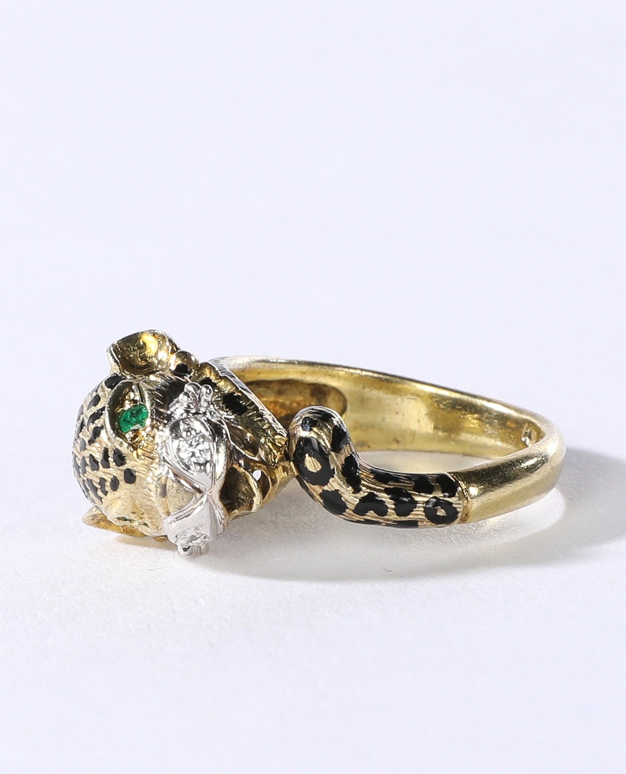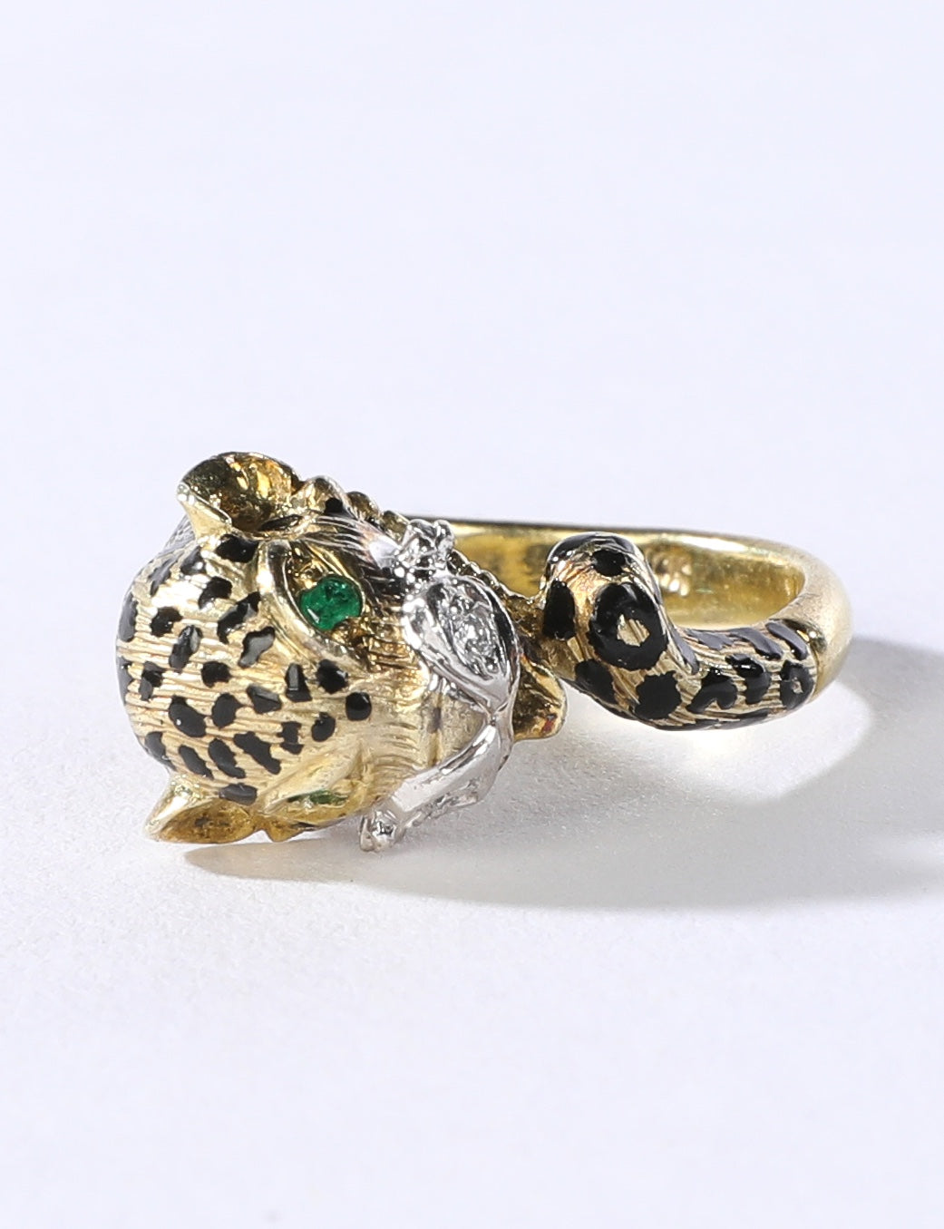 14K Yellow Gold Leopard Head Wrap Rings w Pave Diamond Accents & Emerald Eyes
