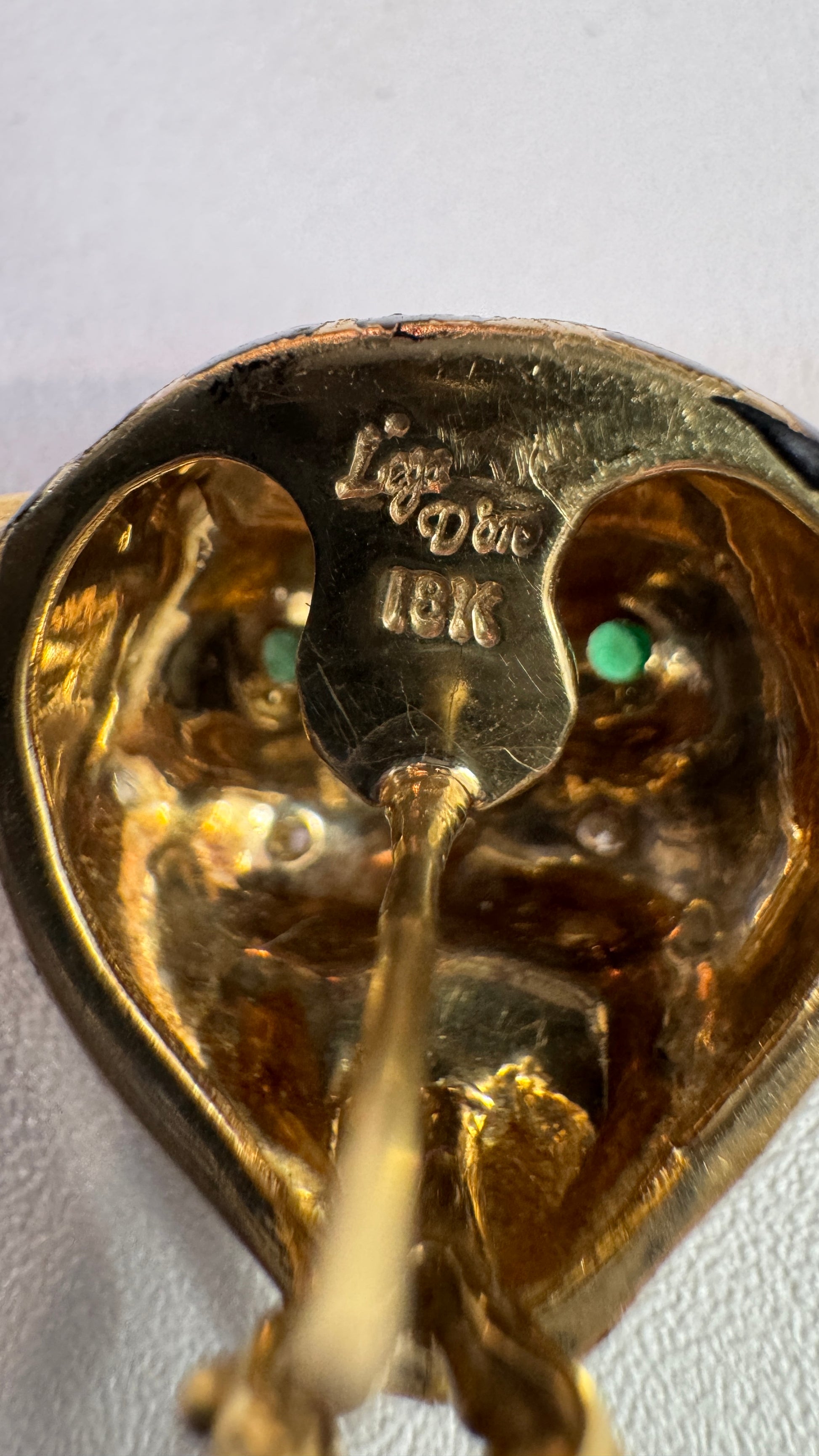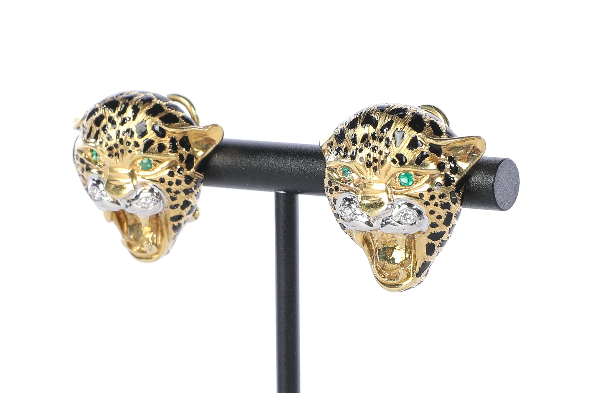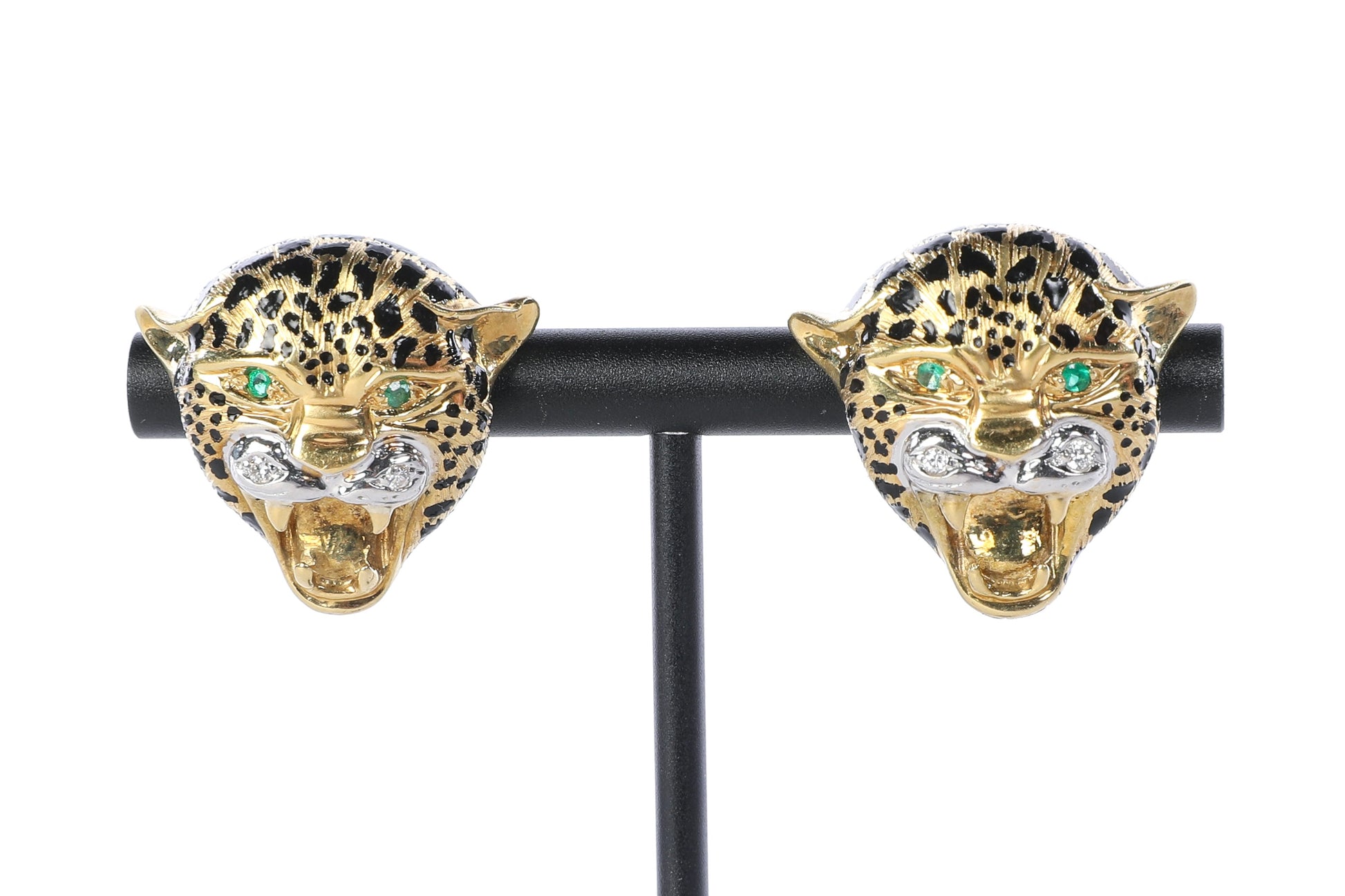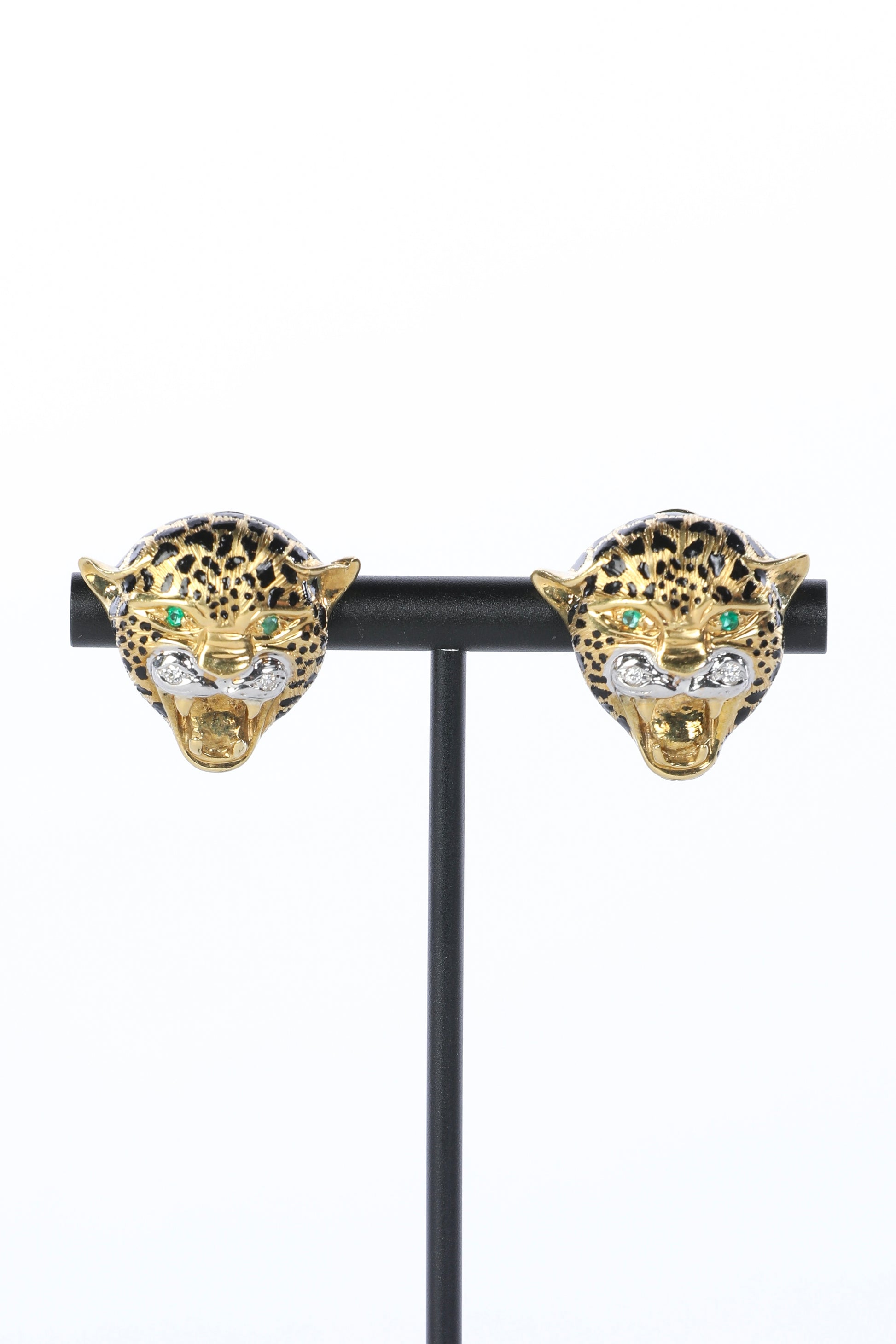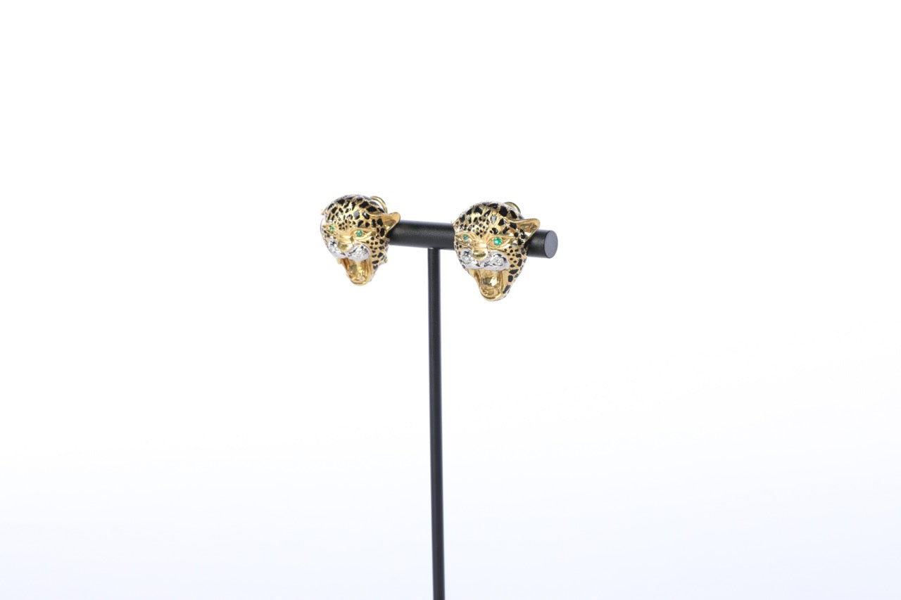 18K Yellow Gold Leopard Head Earrings with Pave Diamond Accents & Emerald Eyes