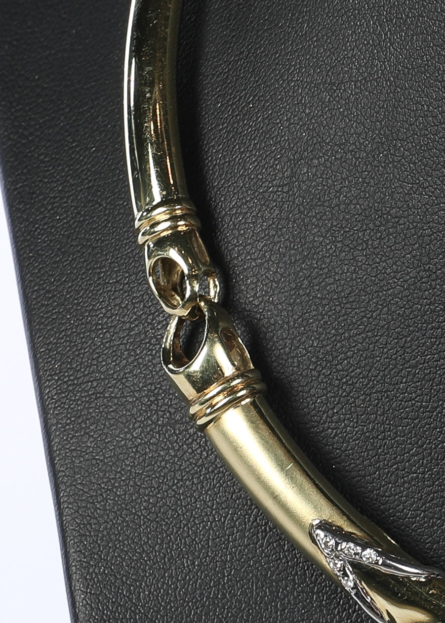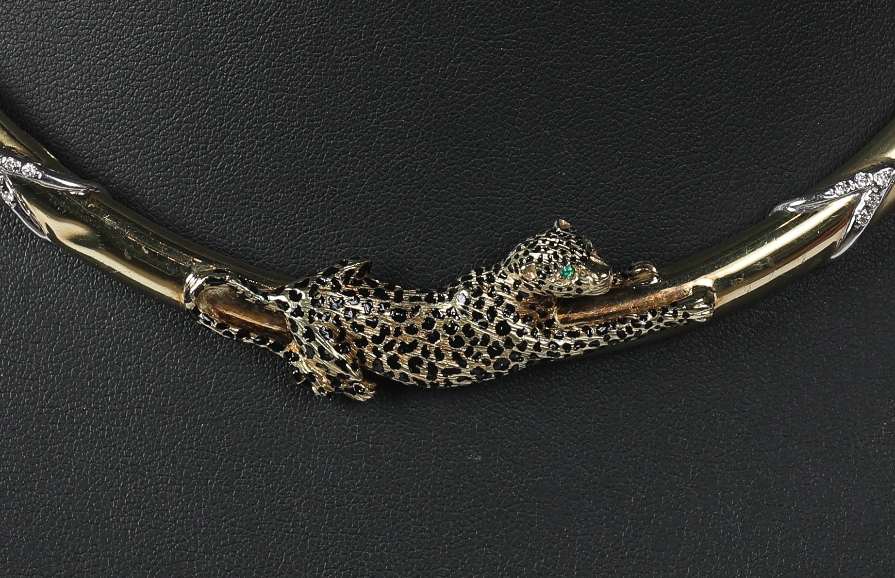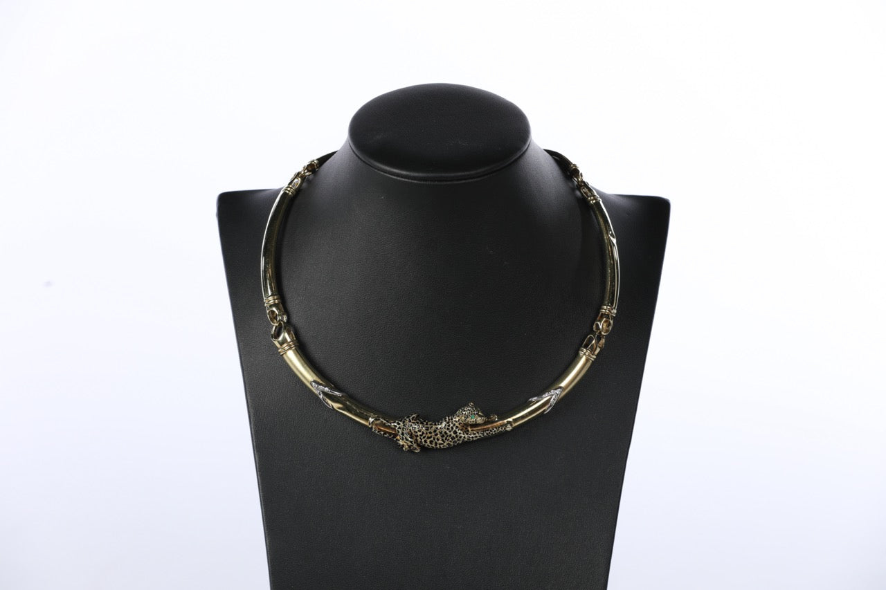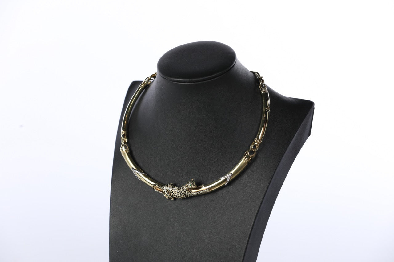 49g of 18K Yellow Gold - Leopard In A Tree Collar Necklace w Pave Diamond Accents & Emerald Eyes