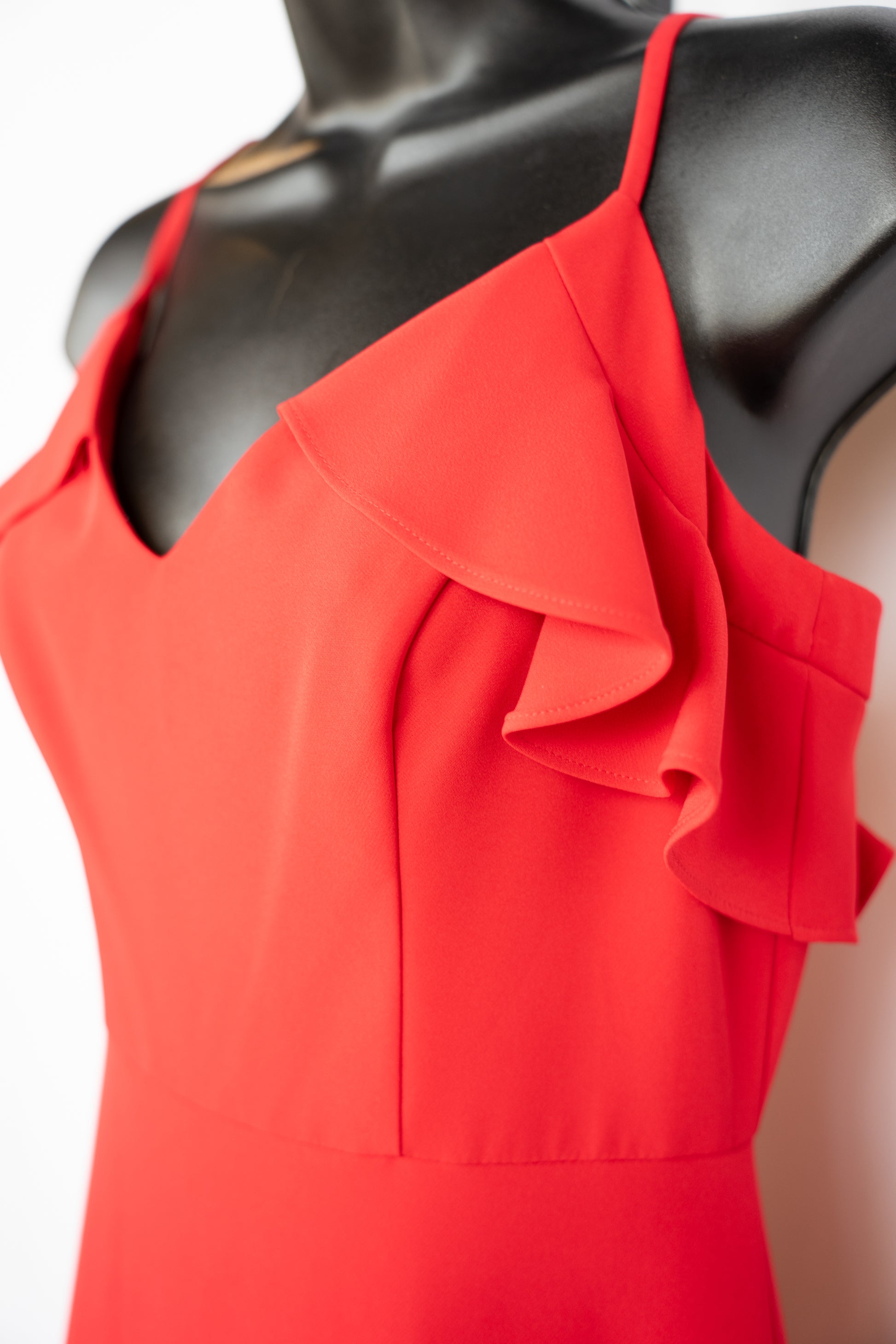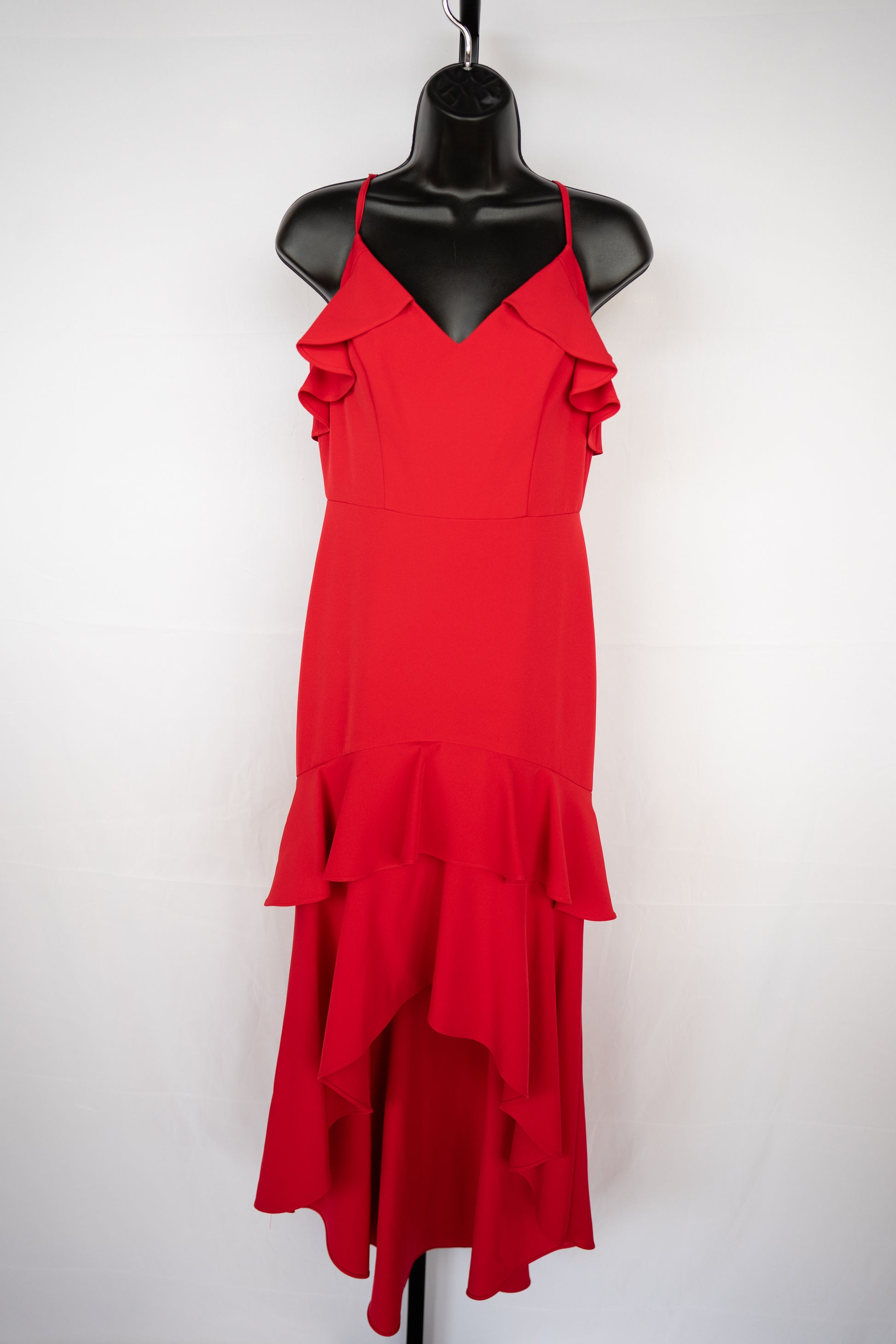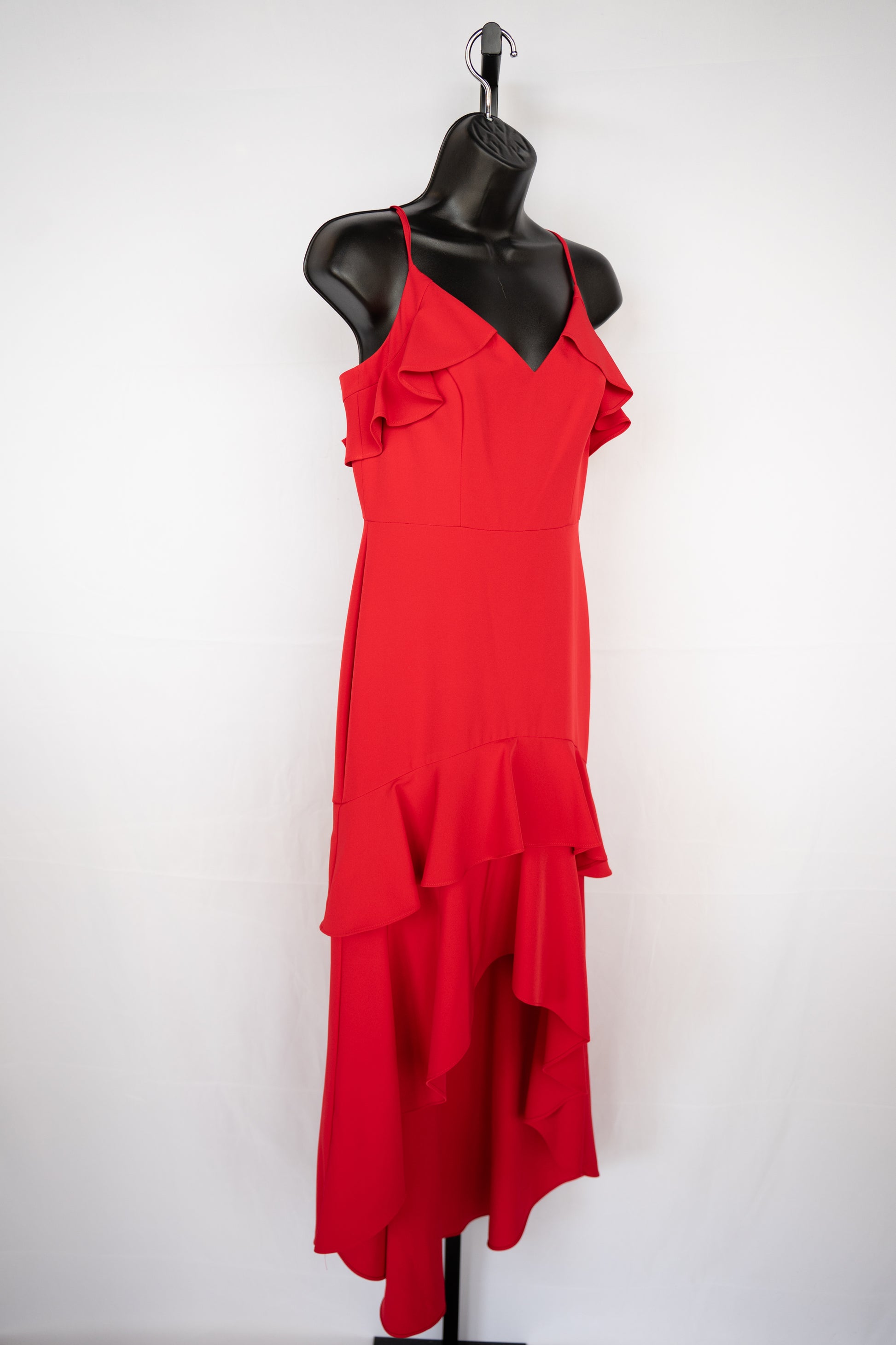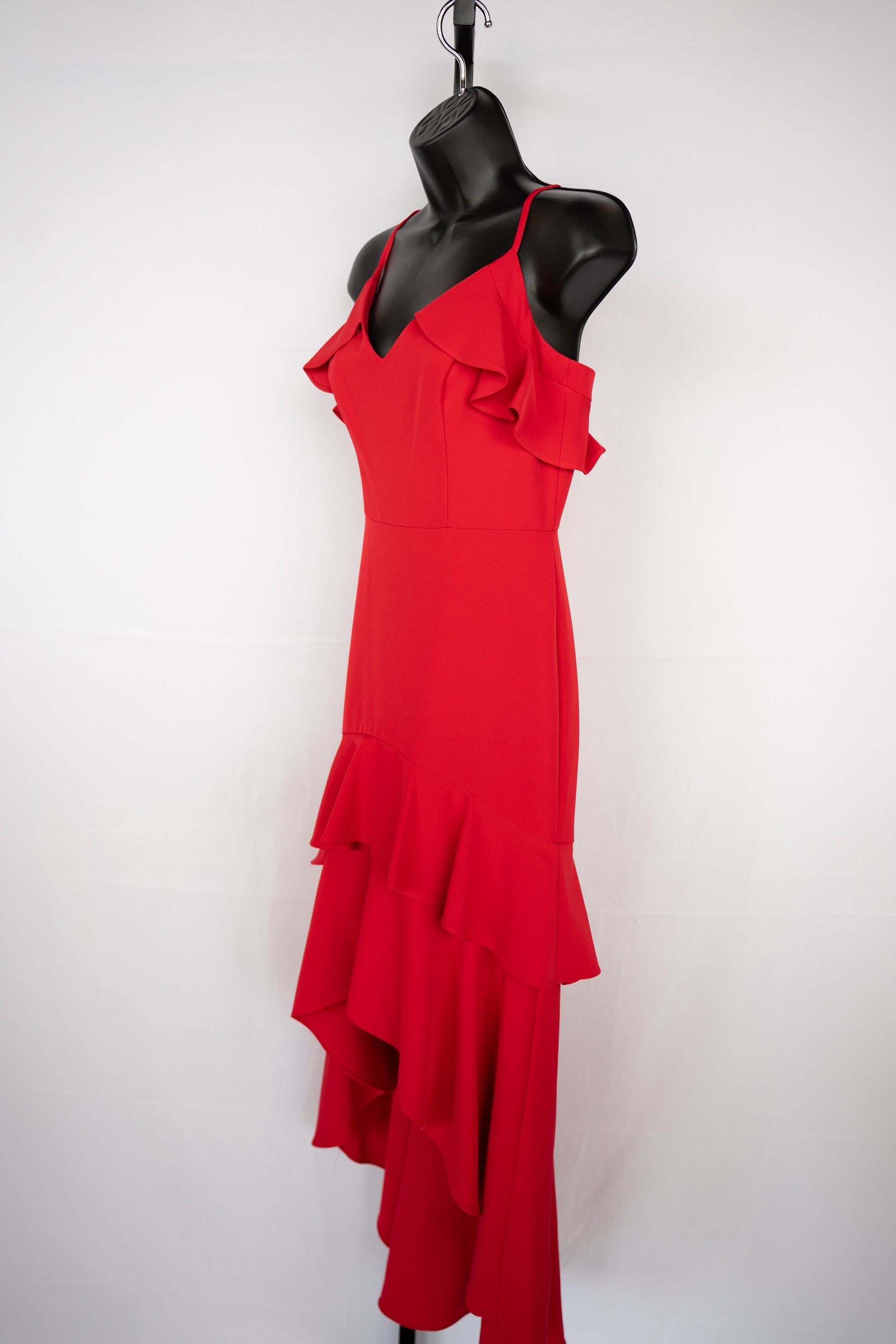 Aidan Mattox Red V-Neck Sleeveless High-Low Hem Full-Length Dress w Ruffle Detail