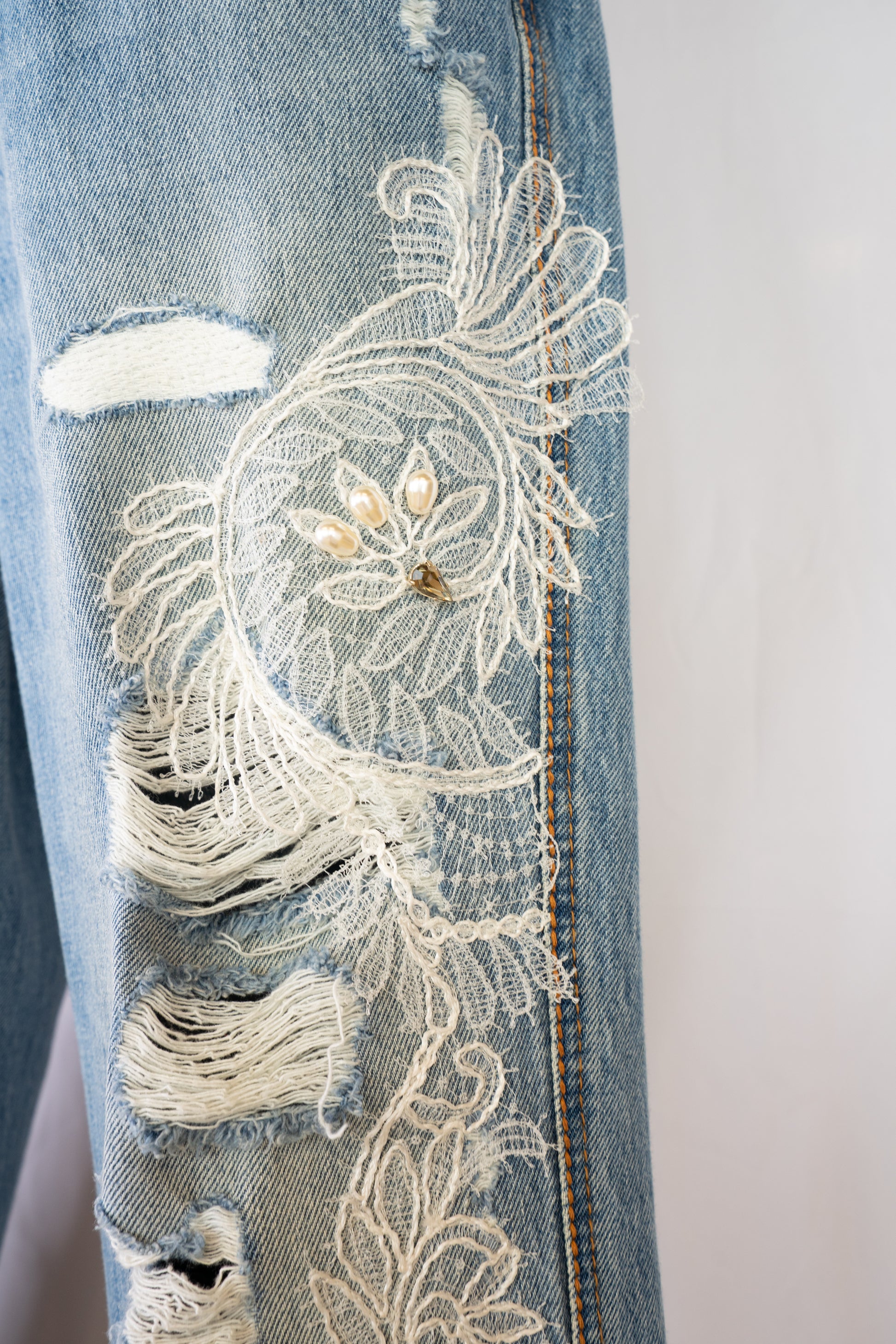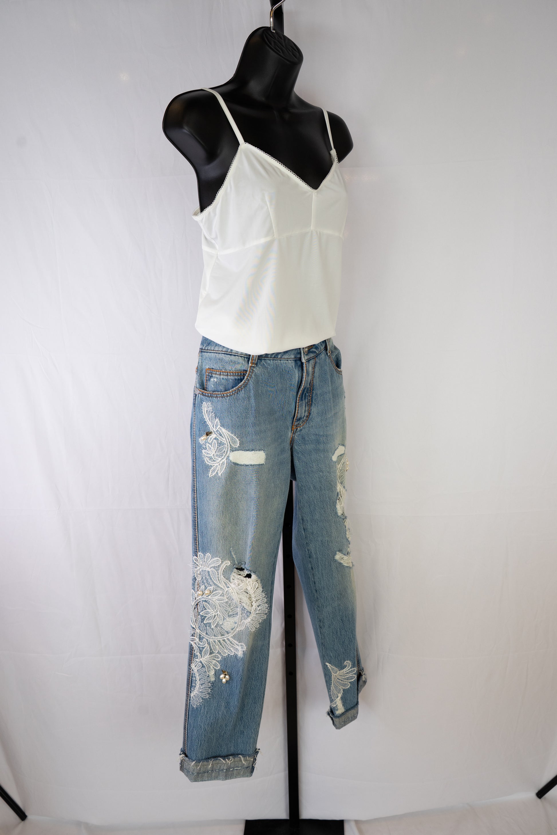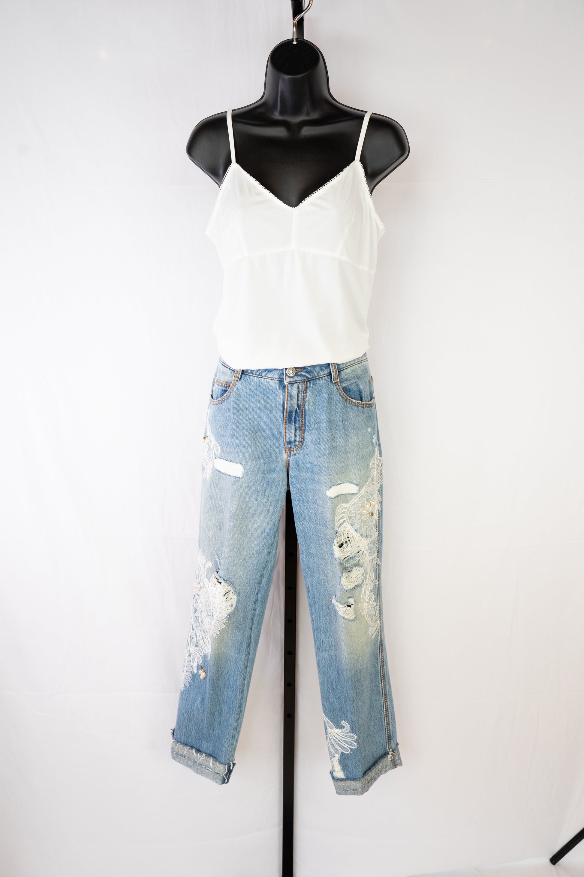 Ermanno Scervino Light Wash Straight Leg Jeans w/ Rhinestone & Lace Detail