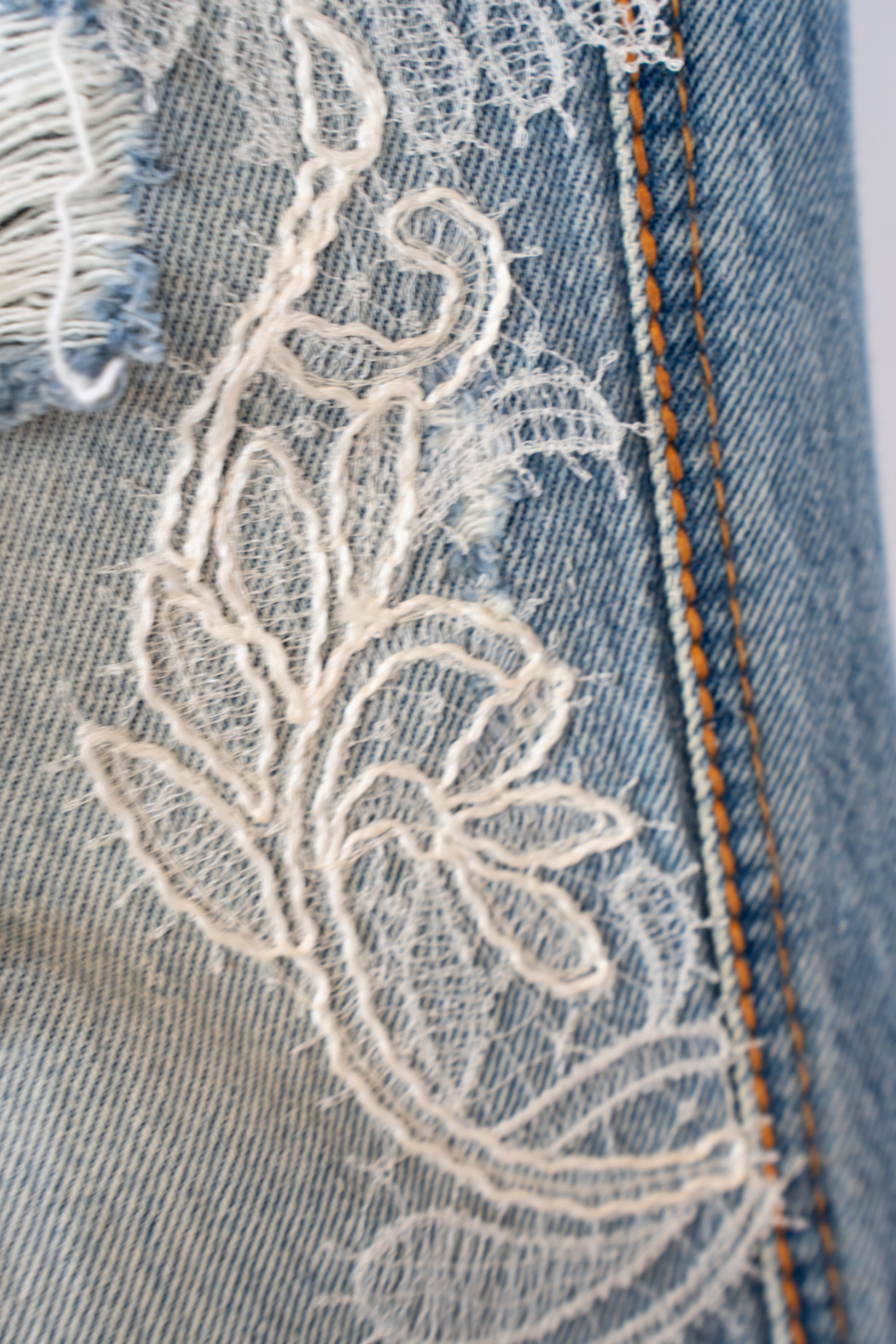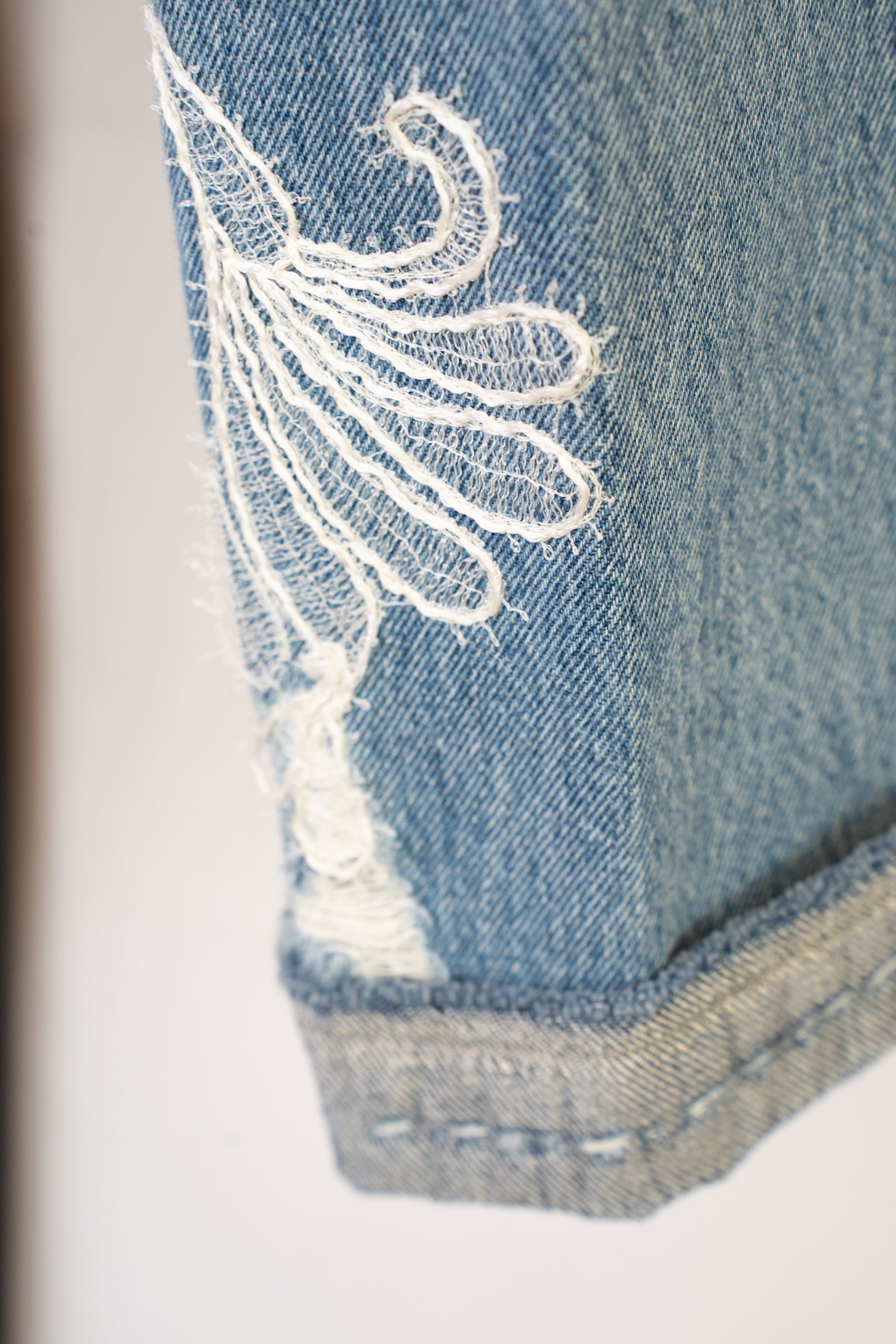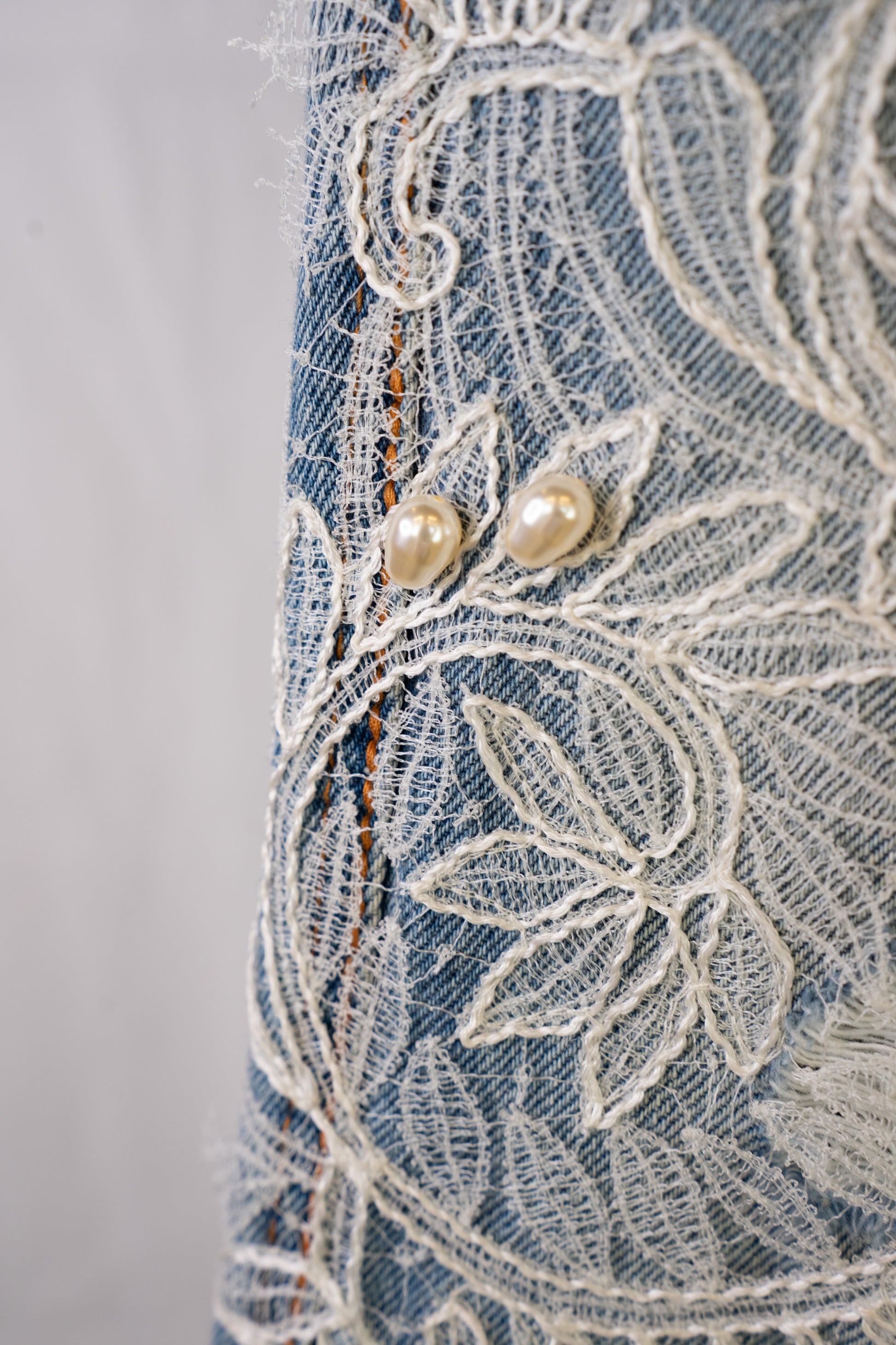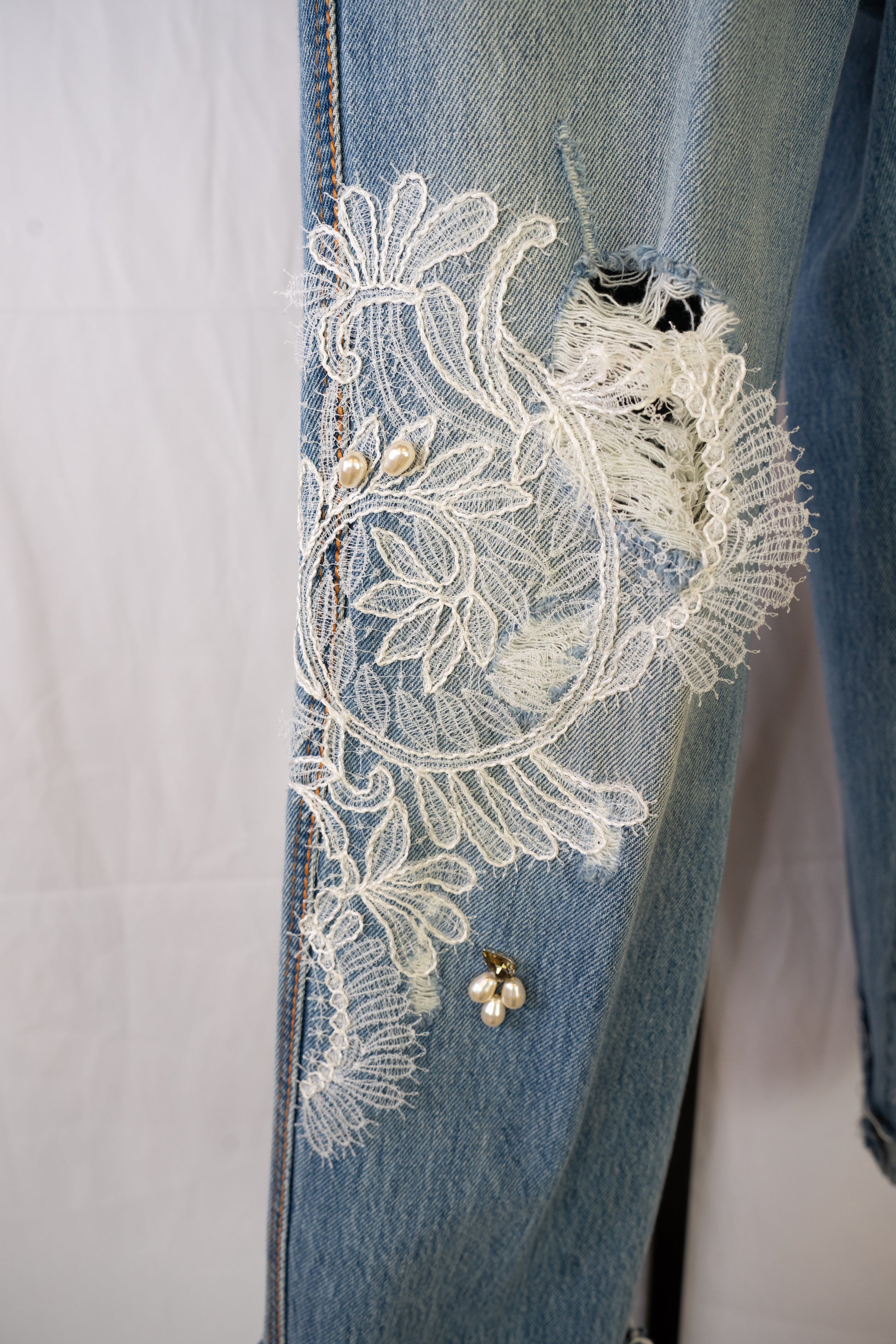 Ermanno Scervino Light Wash Straight Leg Jeans w/ Rhinestone & Lace Detail