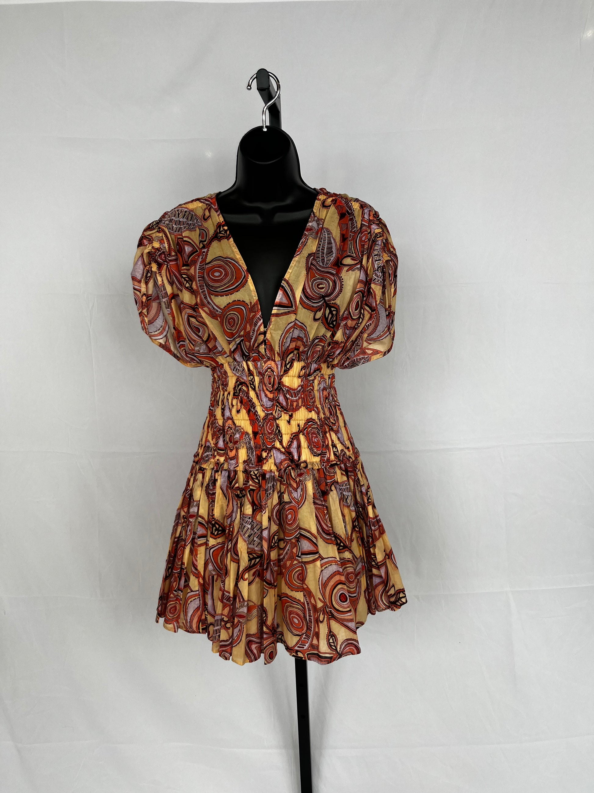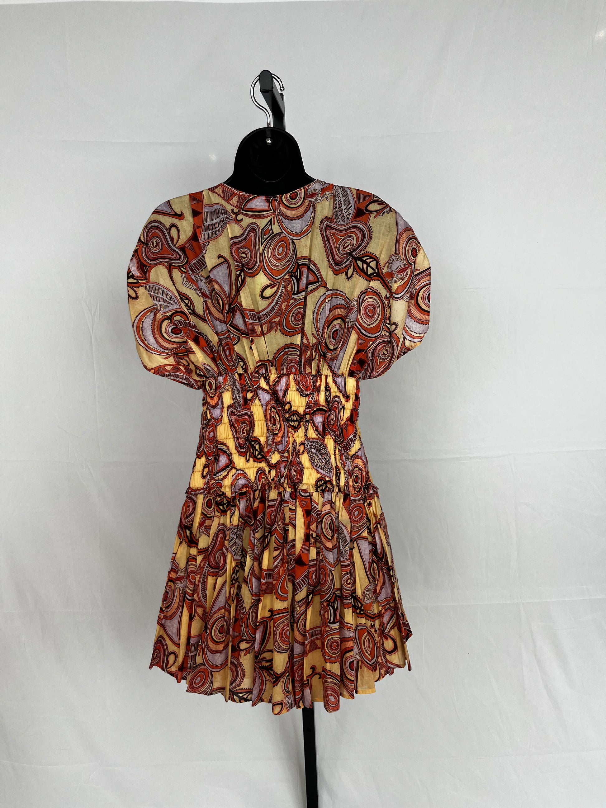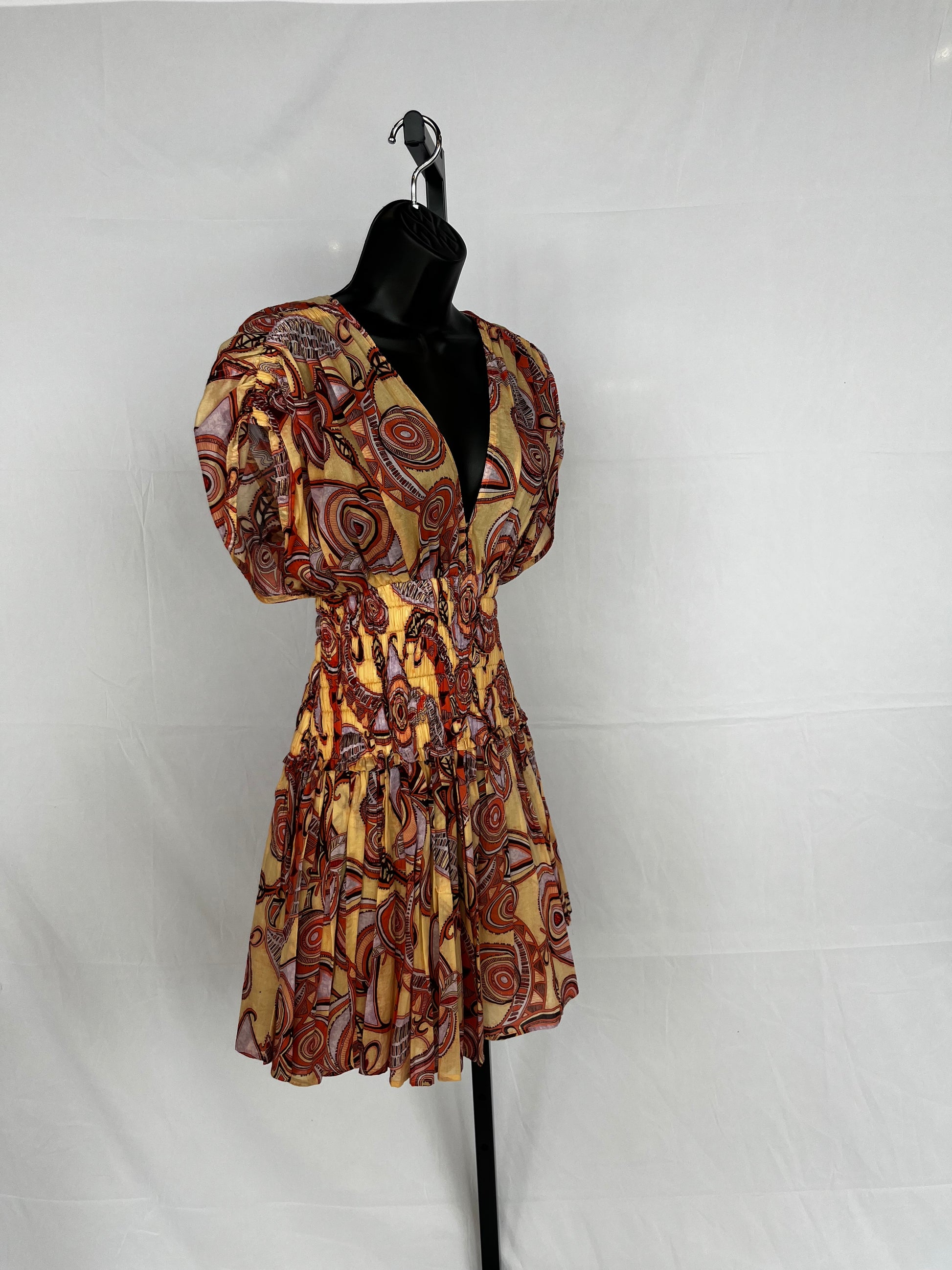 ALC Yellow & Orange Paisley Ruched Cap-Sleeve Smocked Mini Dress