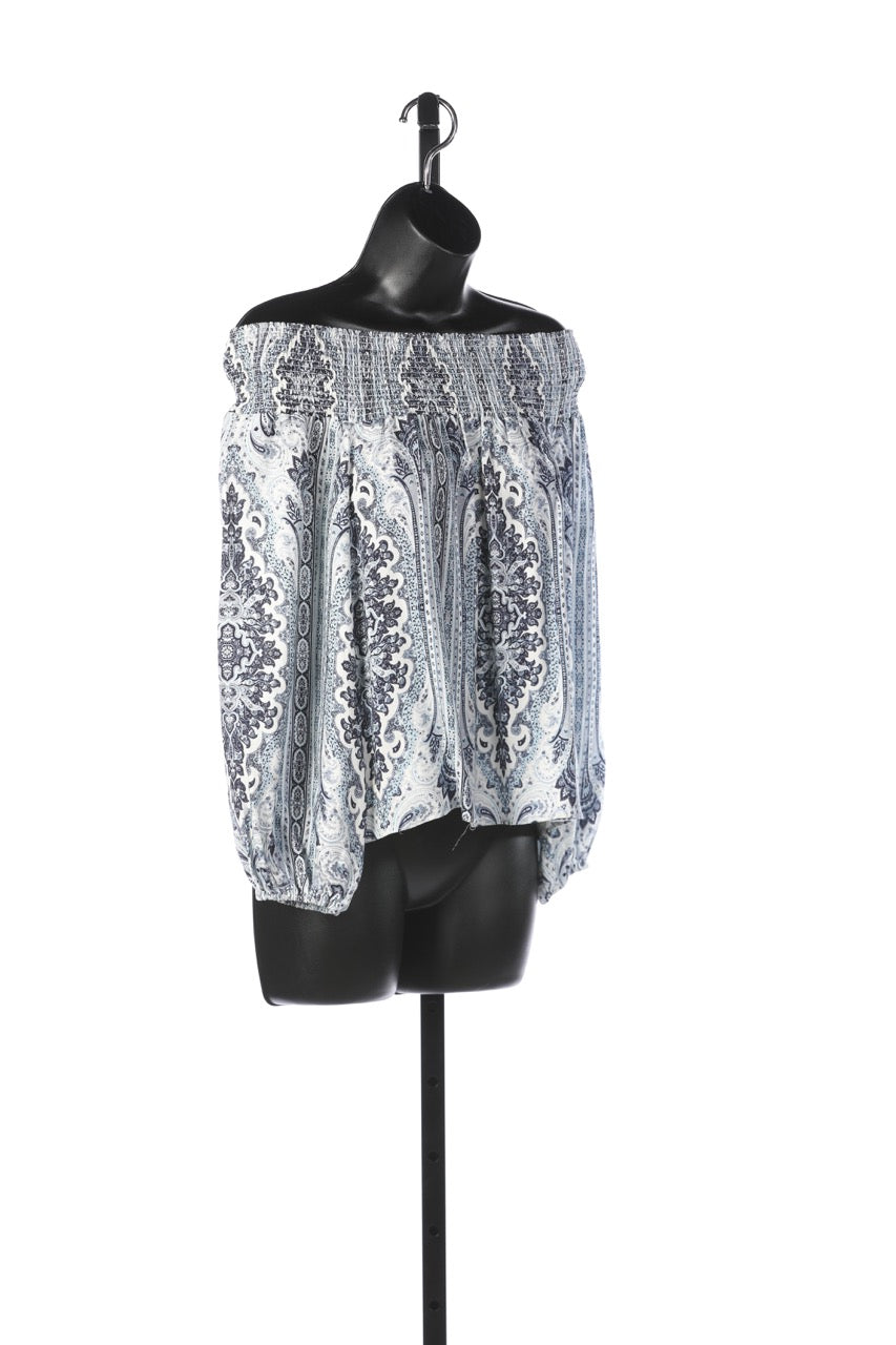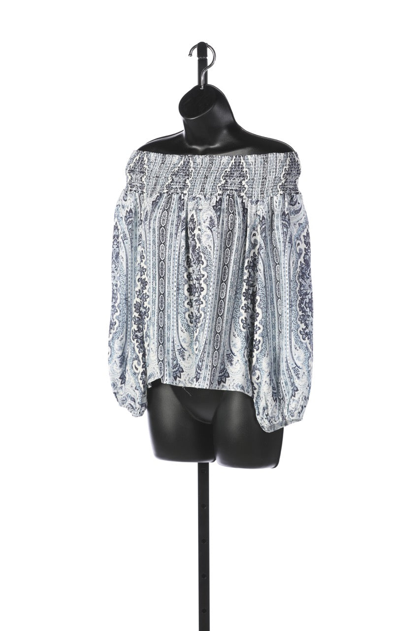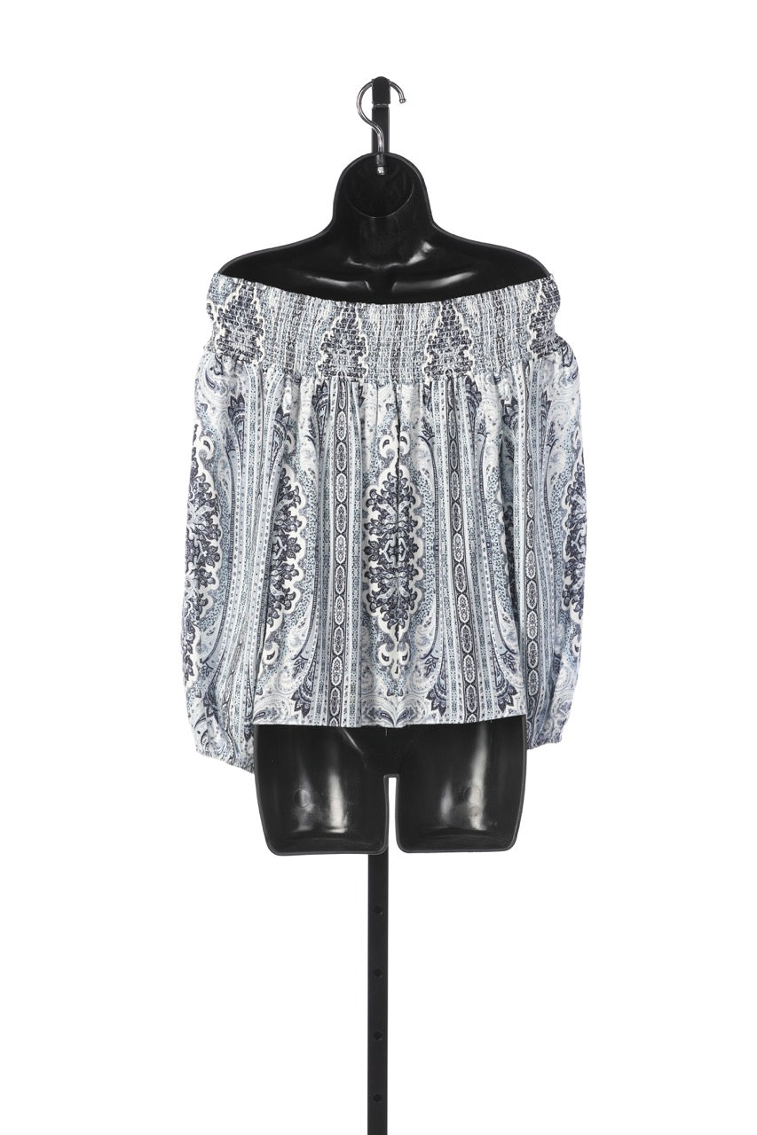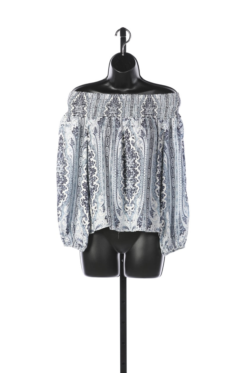 Alice + Olivia Blue & White Pattern Off the Shoulder Long Sleeve Top