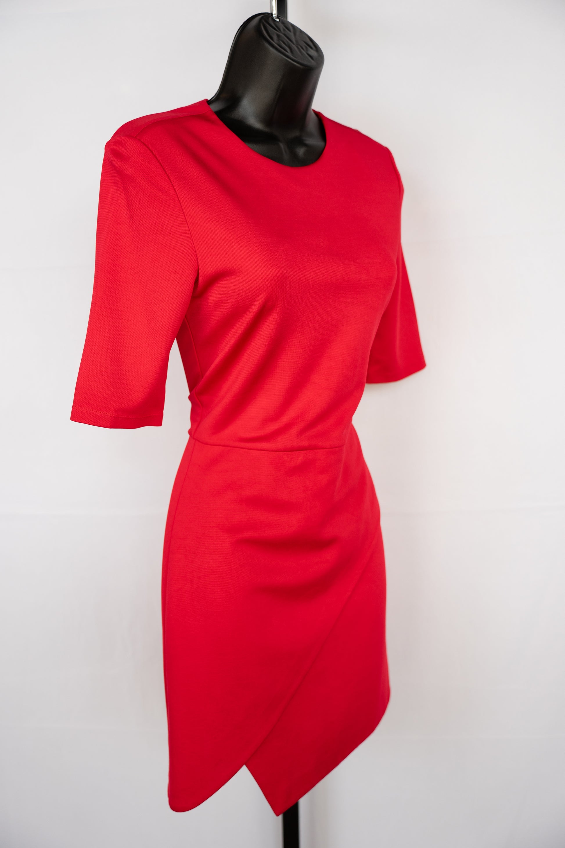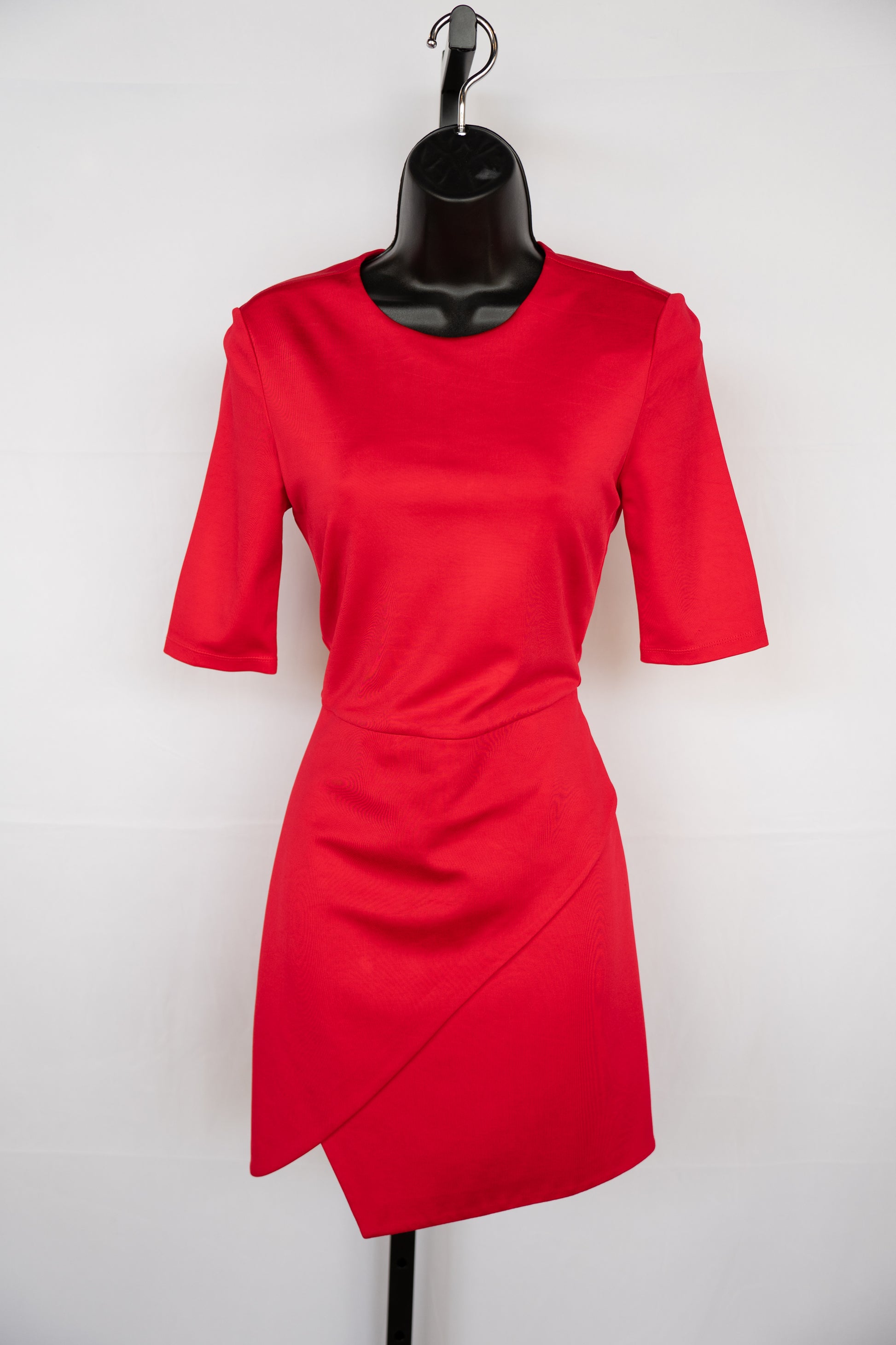 Alice + Olivia Red High Neck 3/4 Sleeve Mini Dress w Asymmetrical Hem