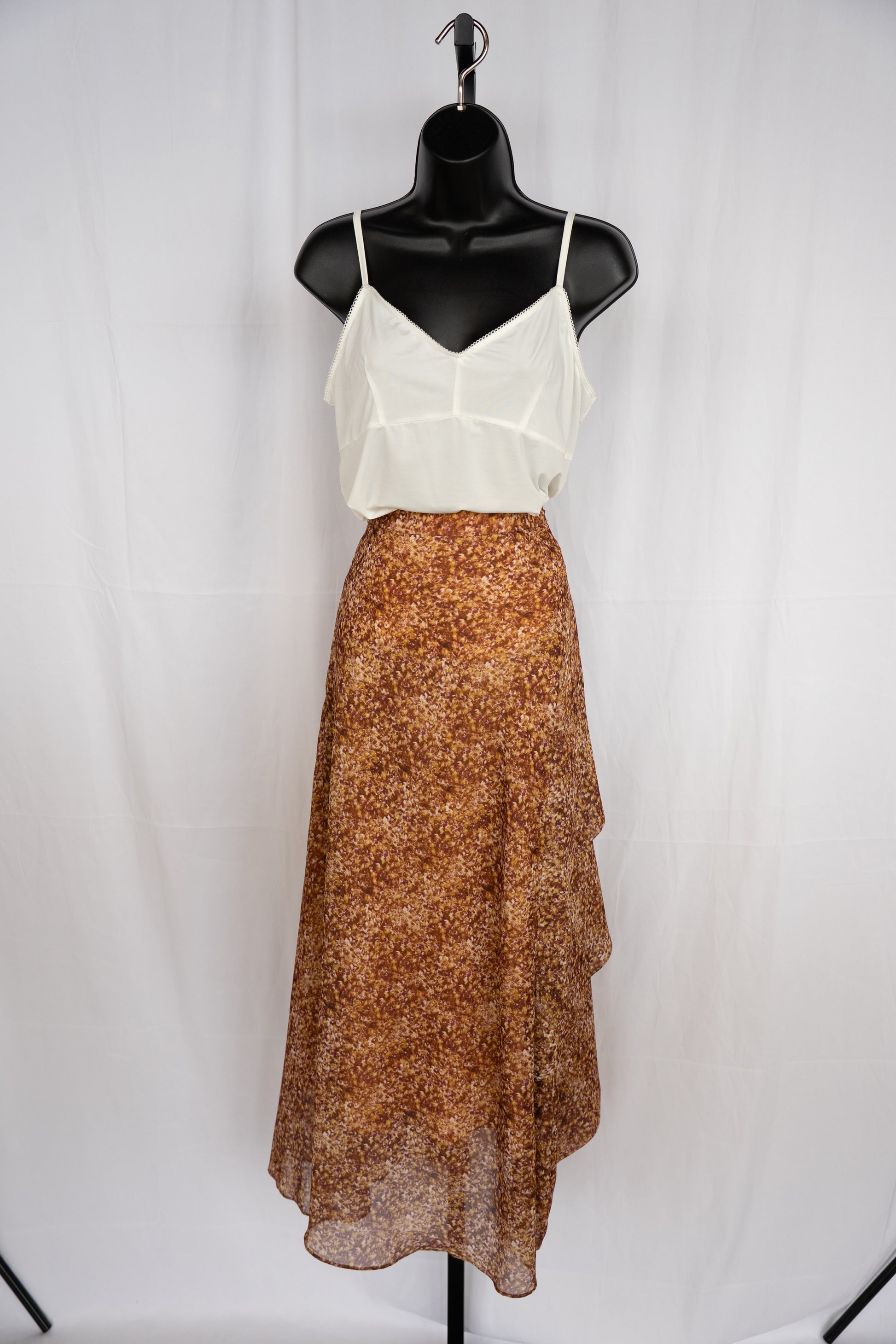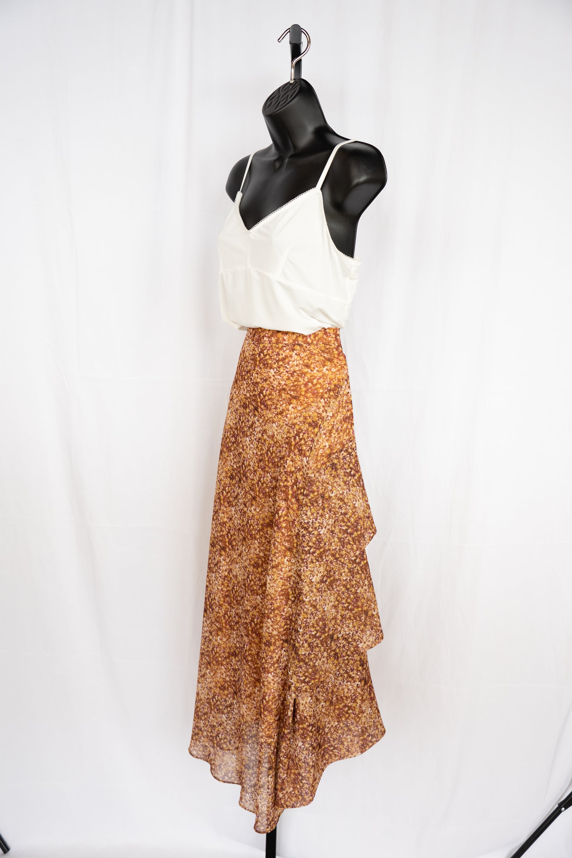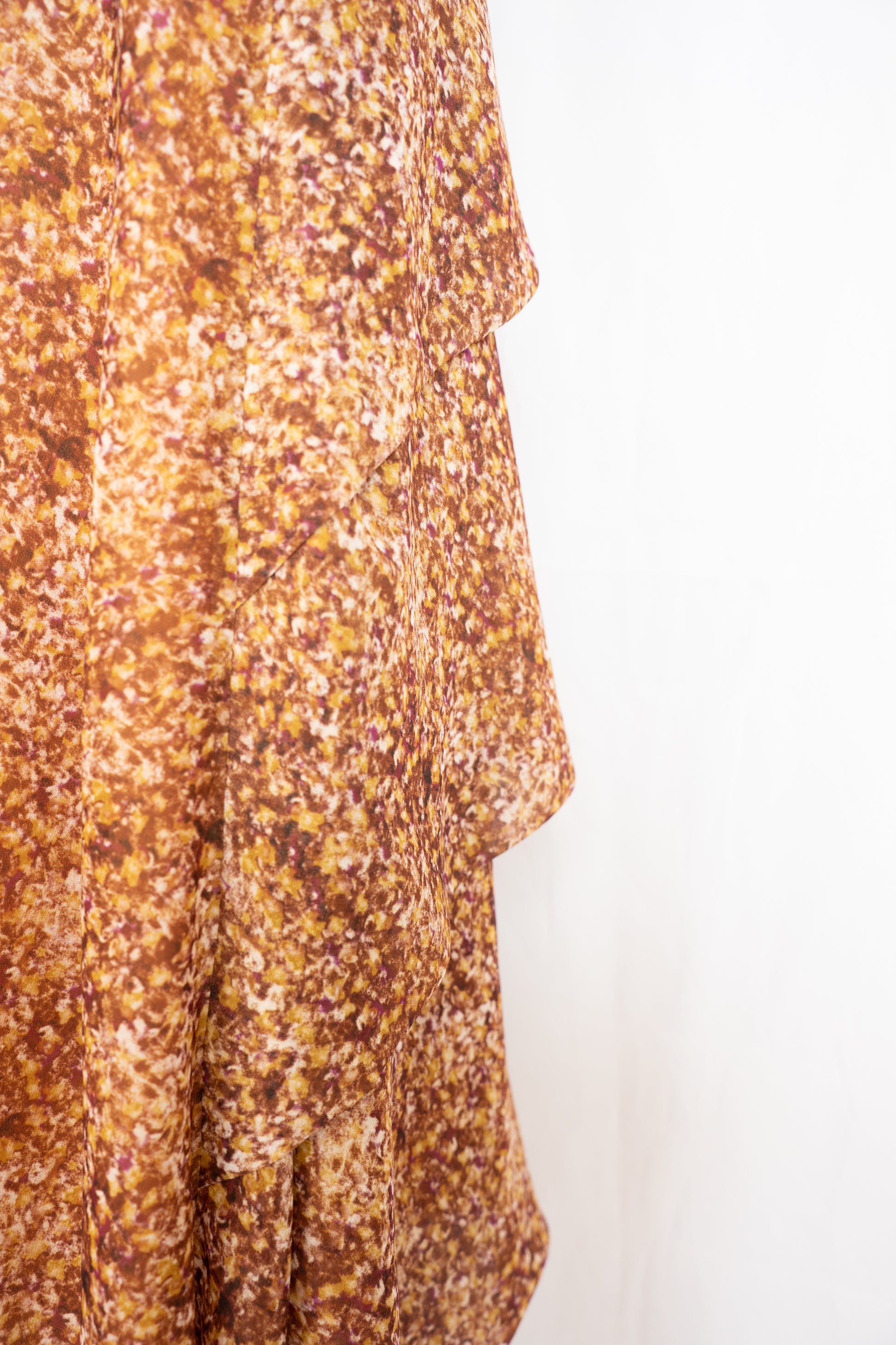 All Saints Brown & Yellow Print Ruffle Hem Midi Skirt