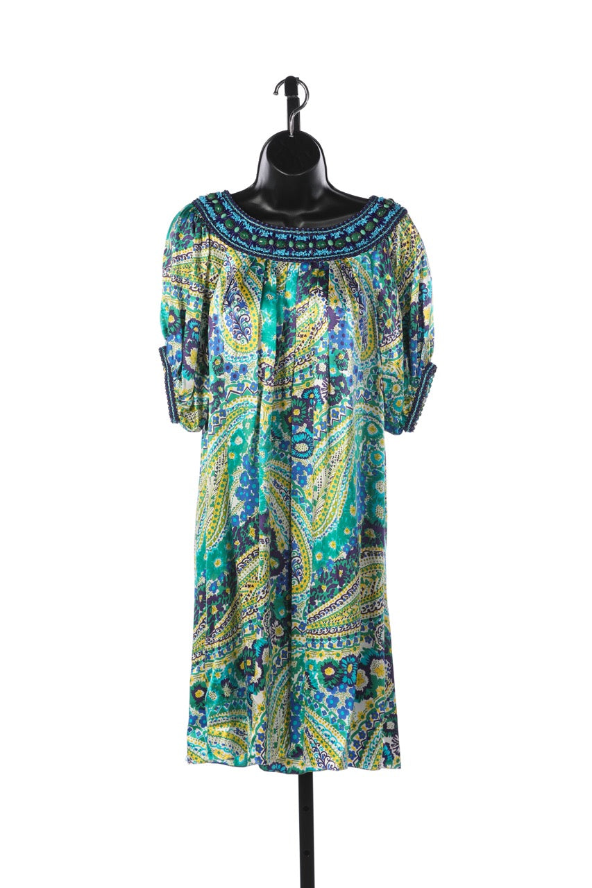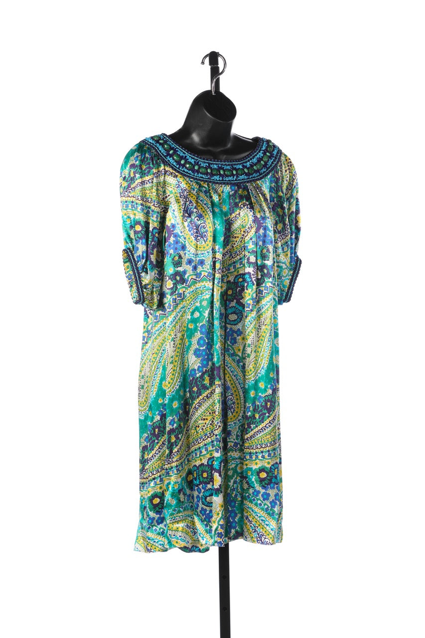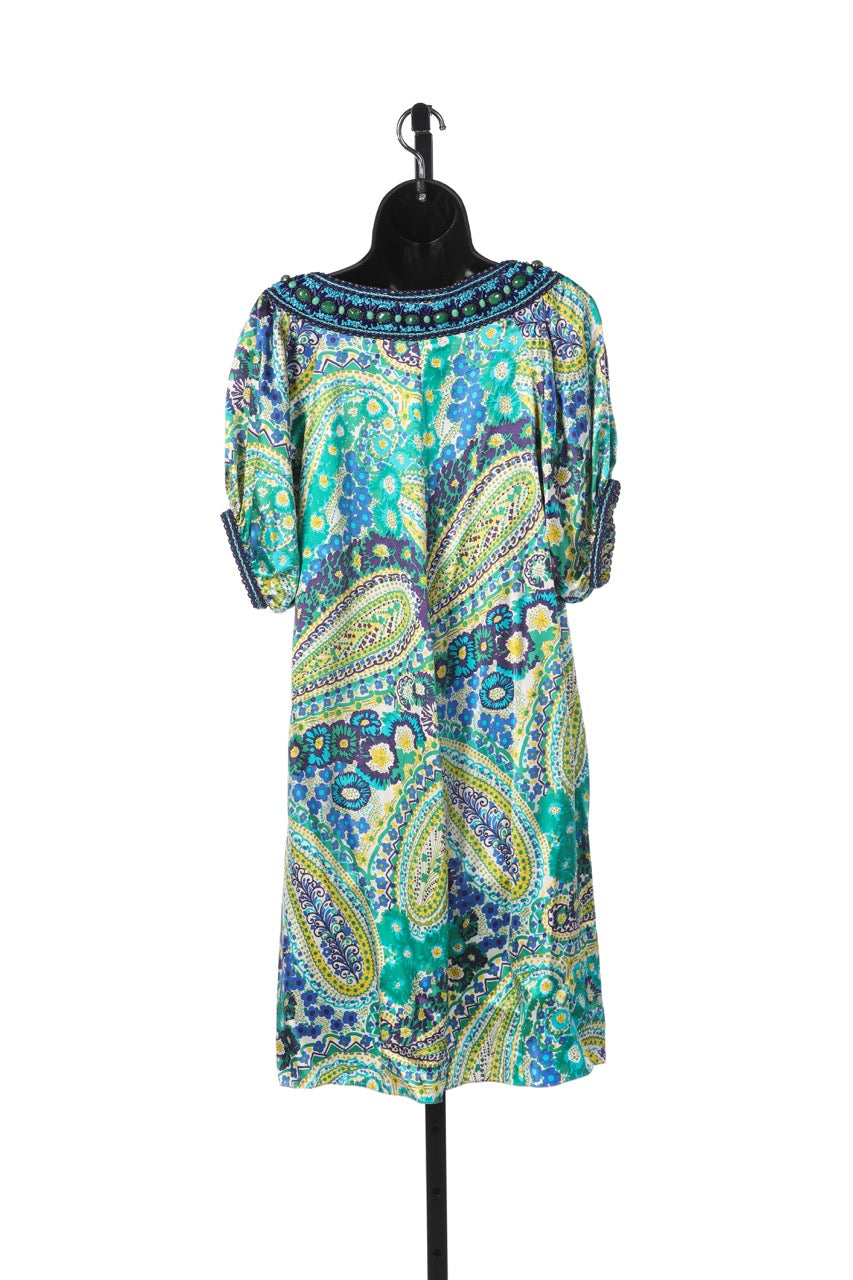 Andrew GN Green Yellow & Blue Silk Paisley Print Short Sleeve Knee-Length Dress