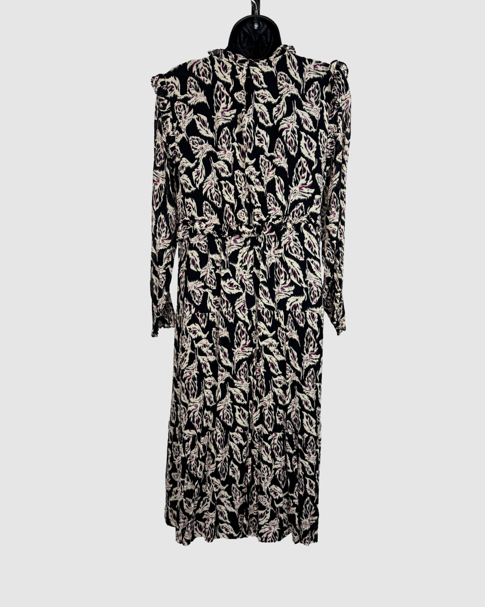 Ba&sh Black White Purple Print High Neck Long Sleeve Midi Dress w Ruffles