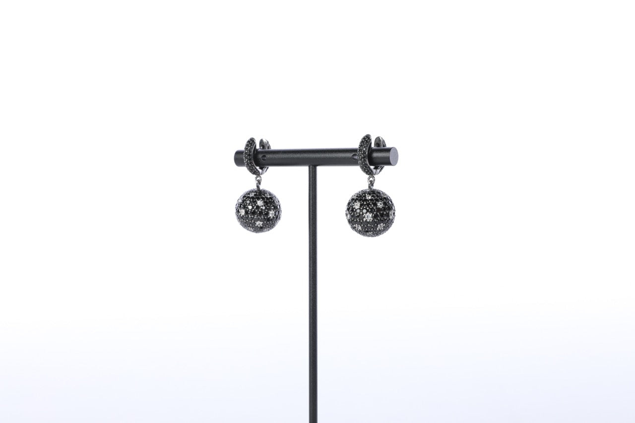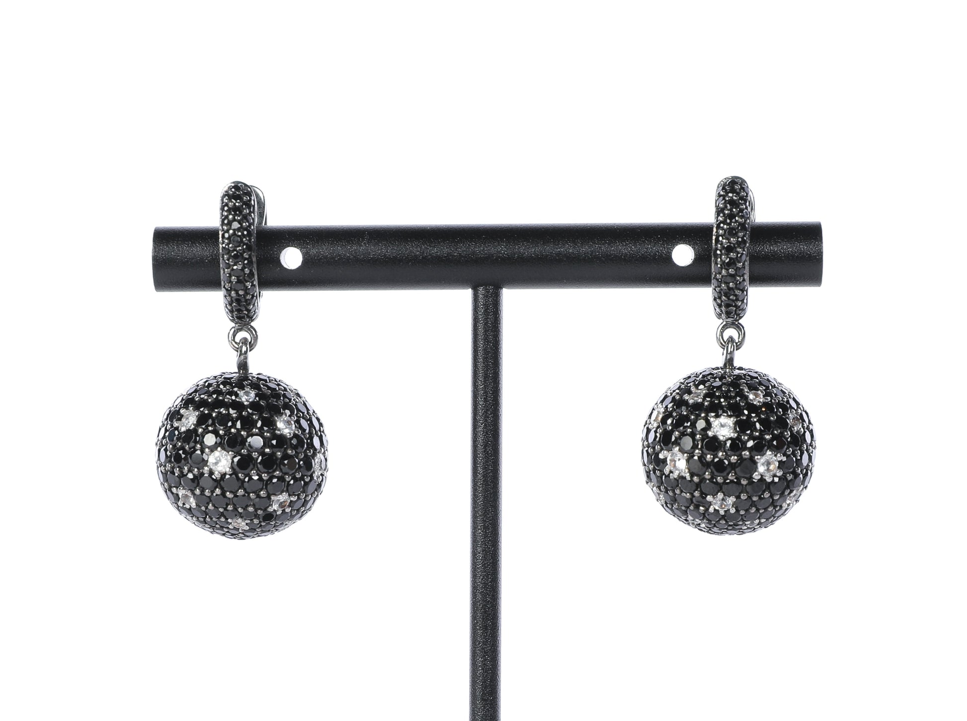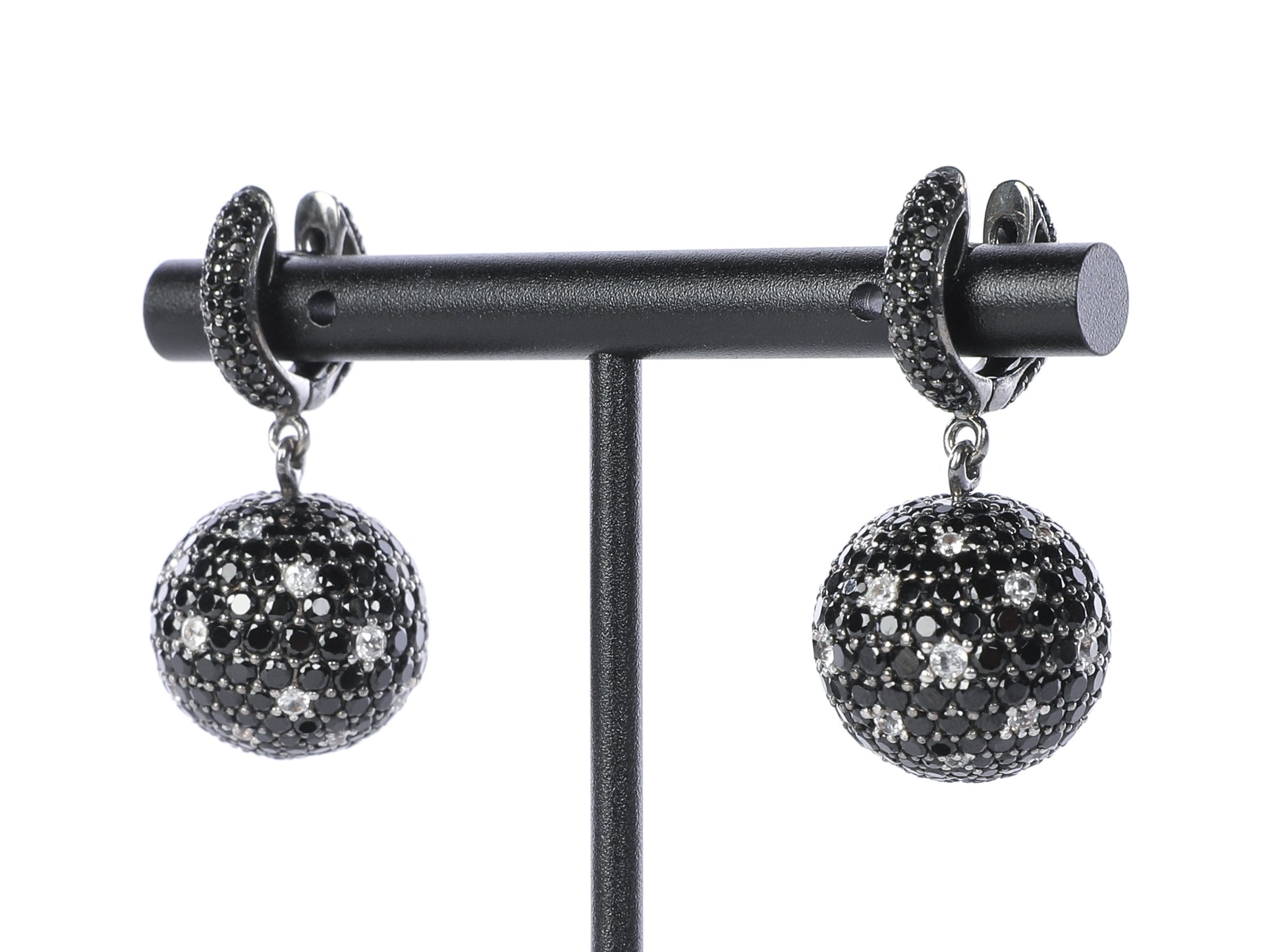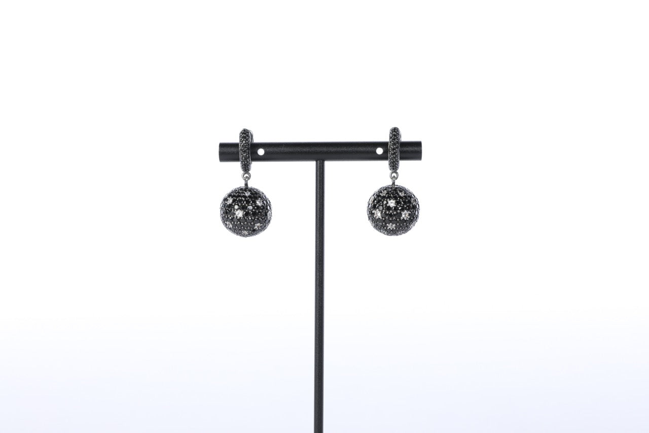 Sterling Silver Black and White Pave Diamond Ball Dangly Earrings