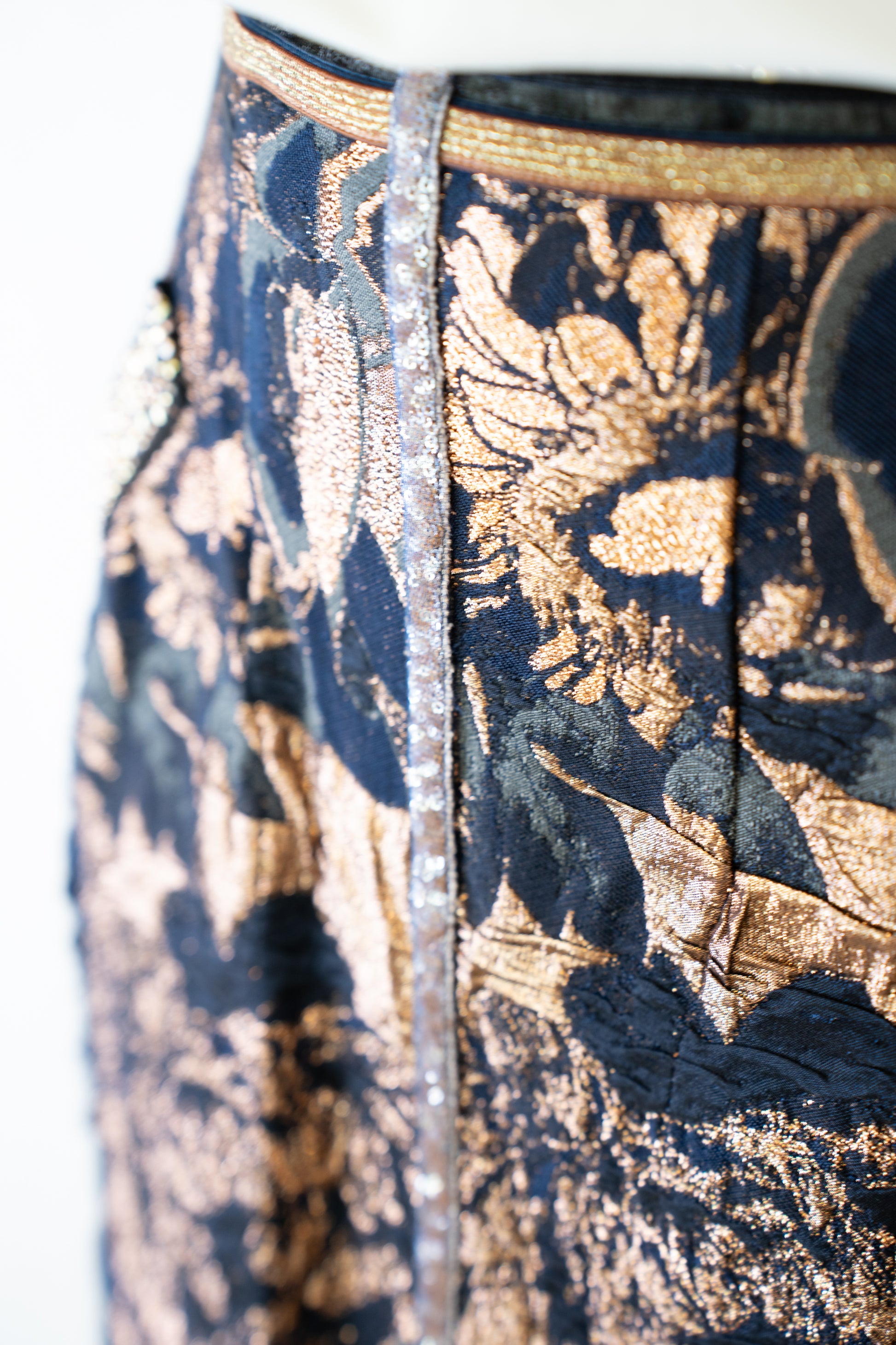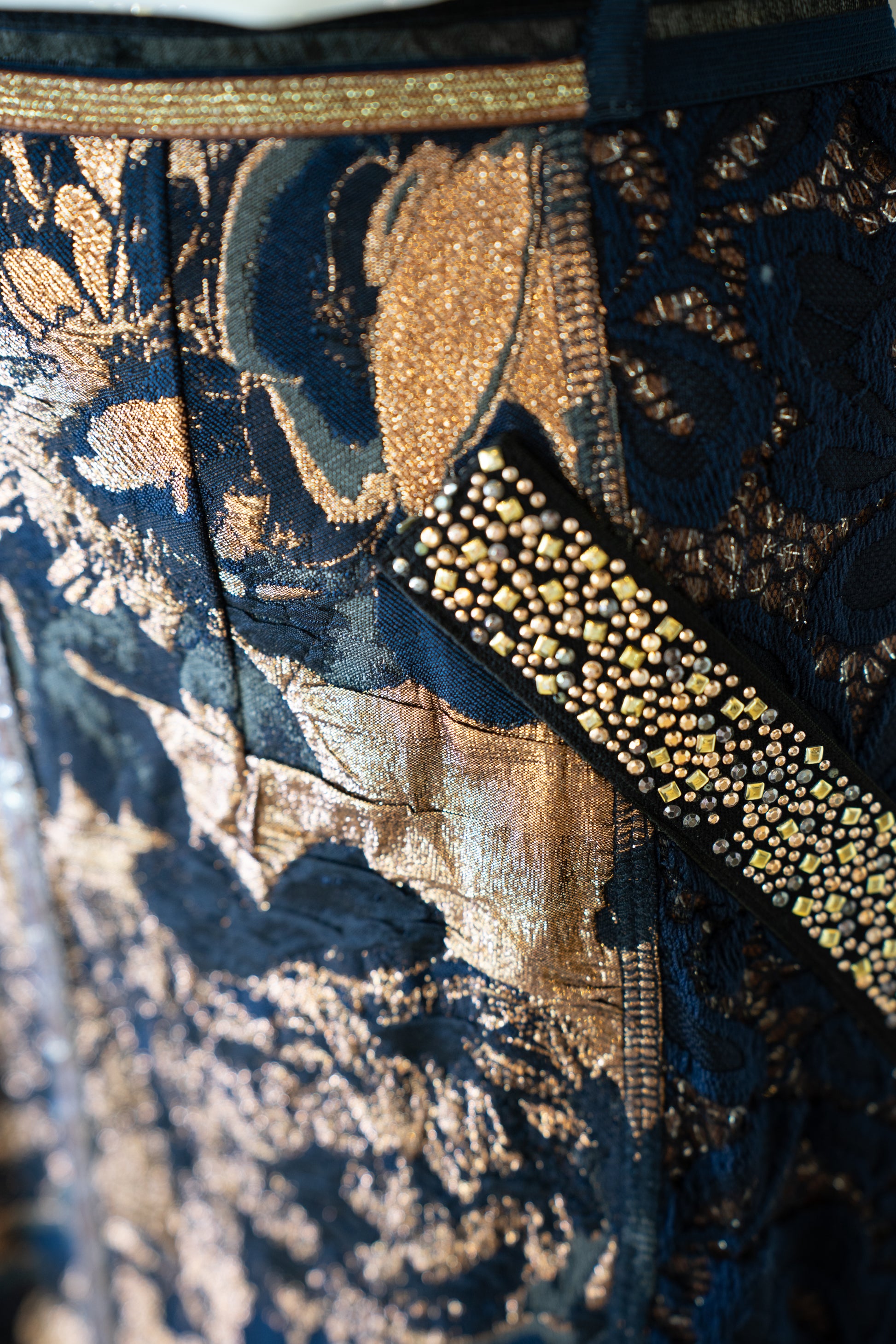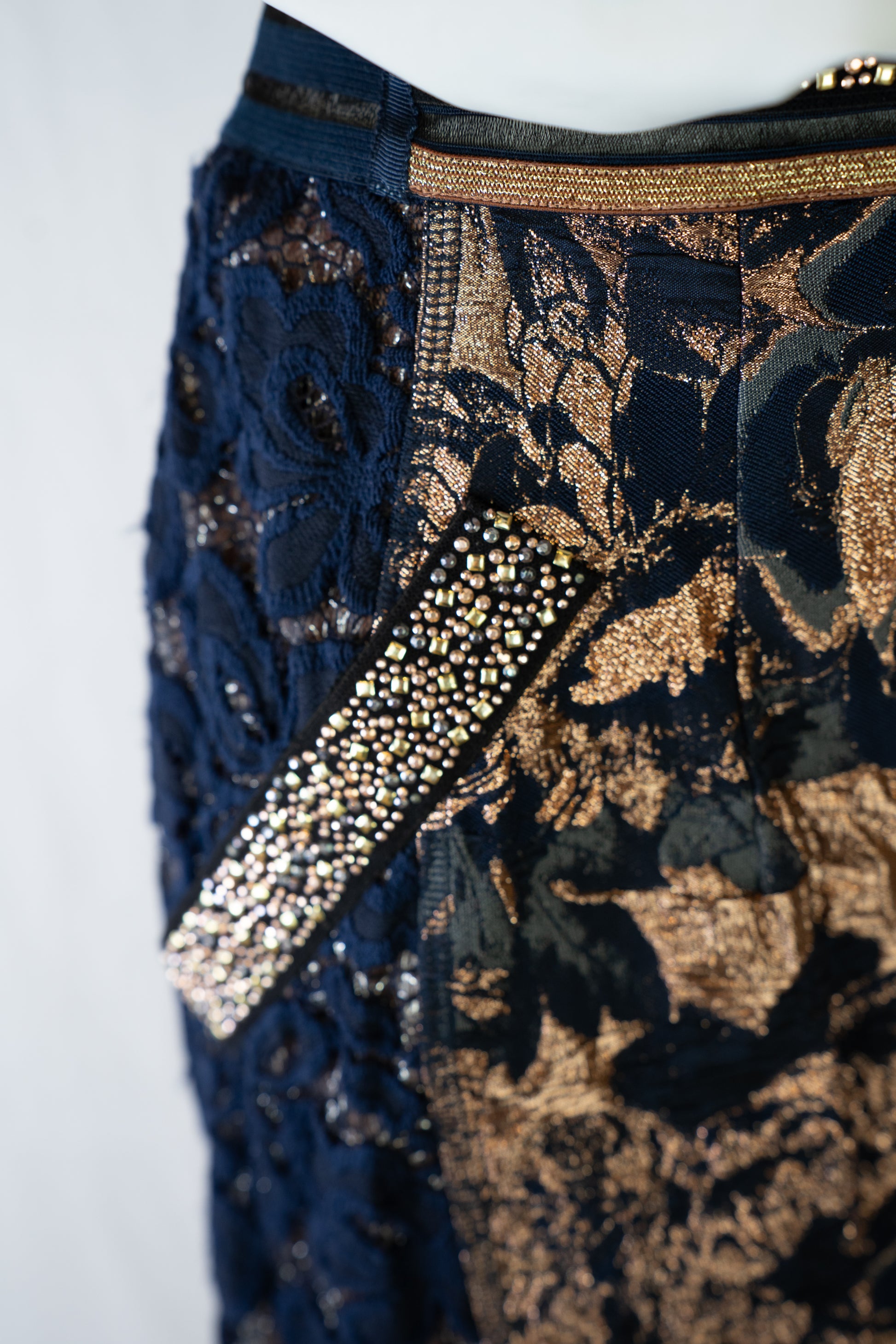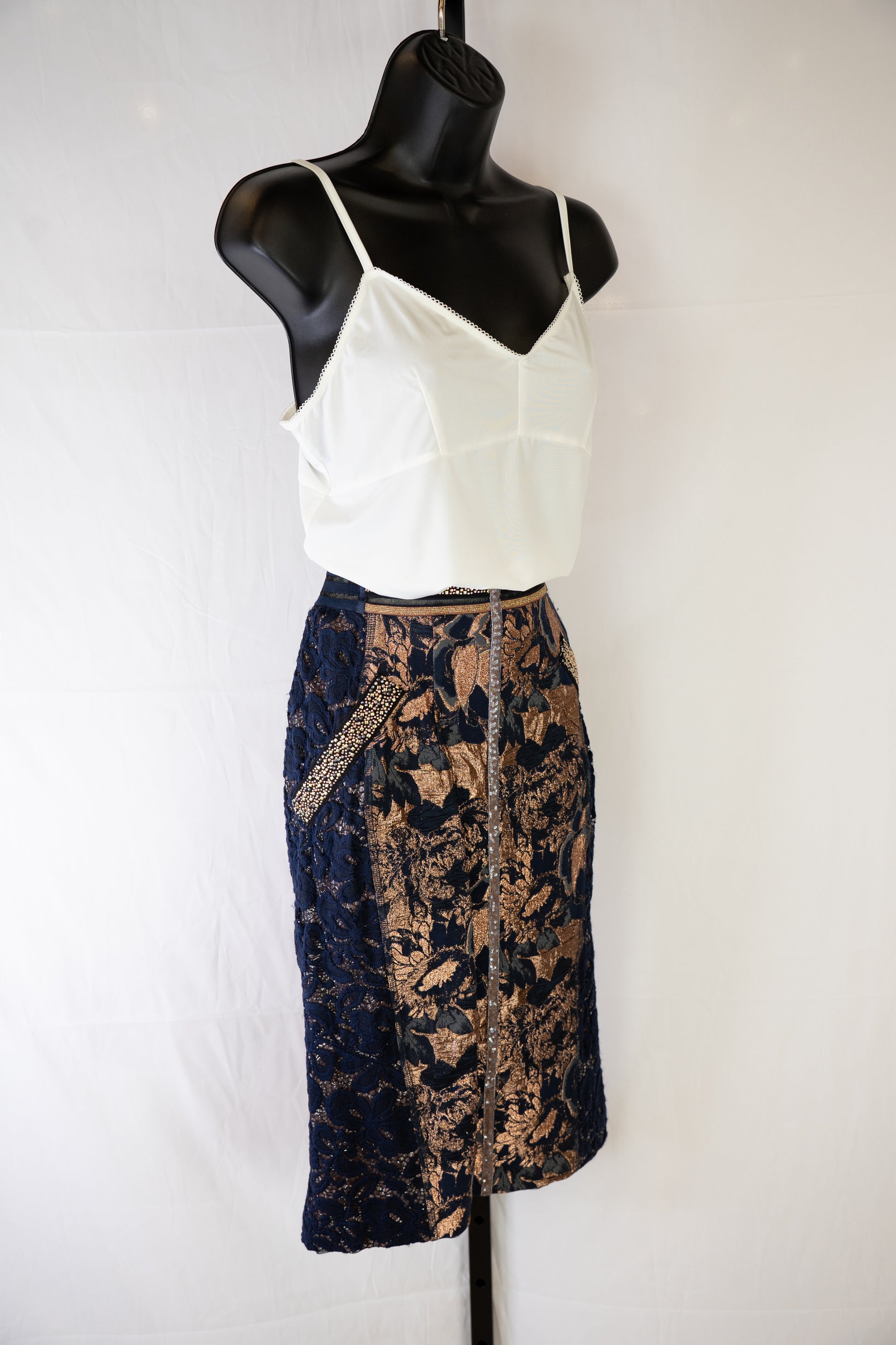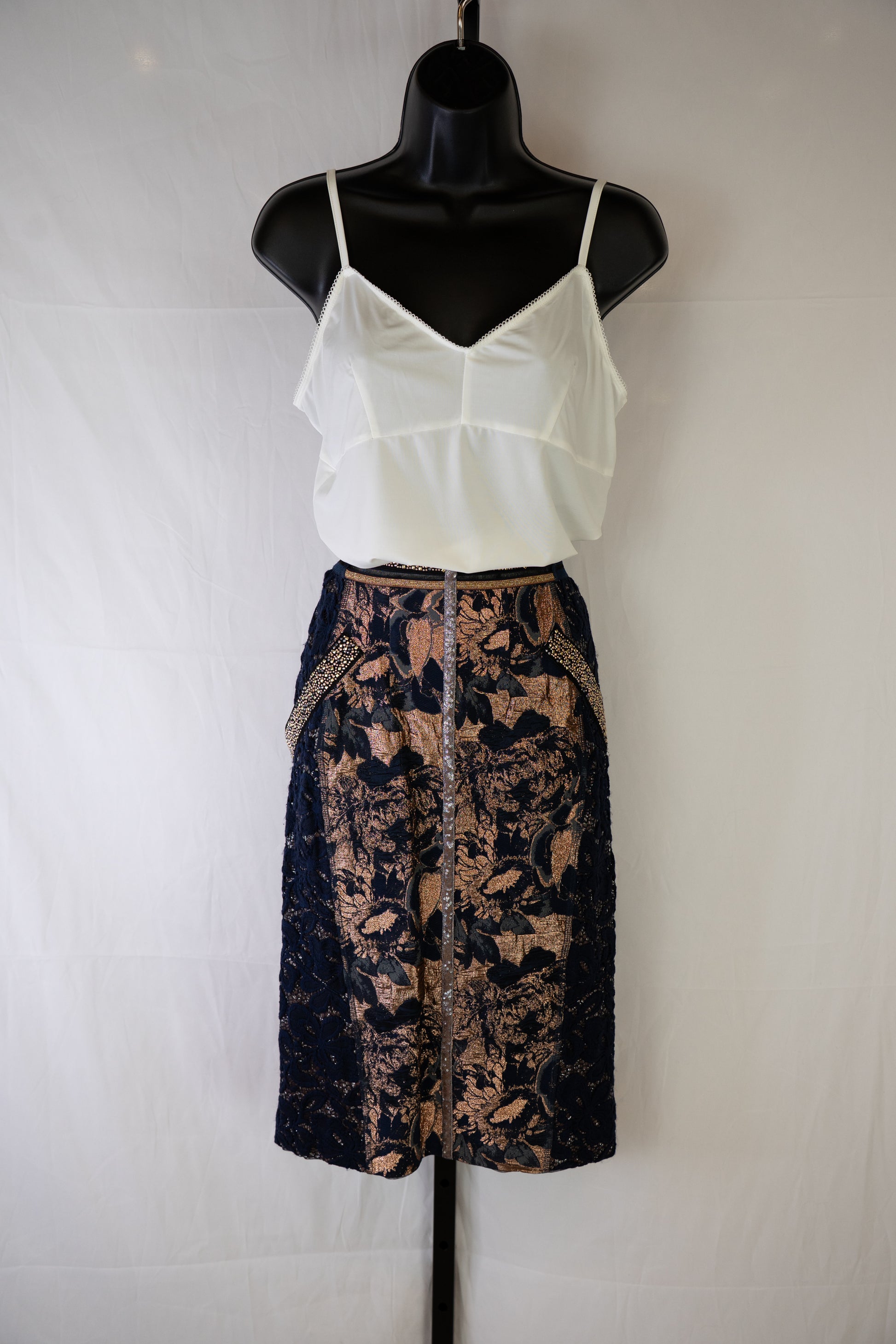 Byron Lars Navy & Gold Beaded, Lace & Floral Midi Skirt w Back Zip