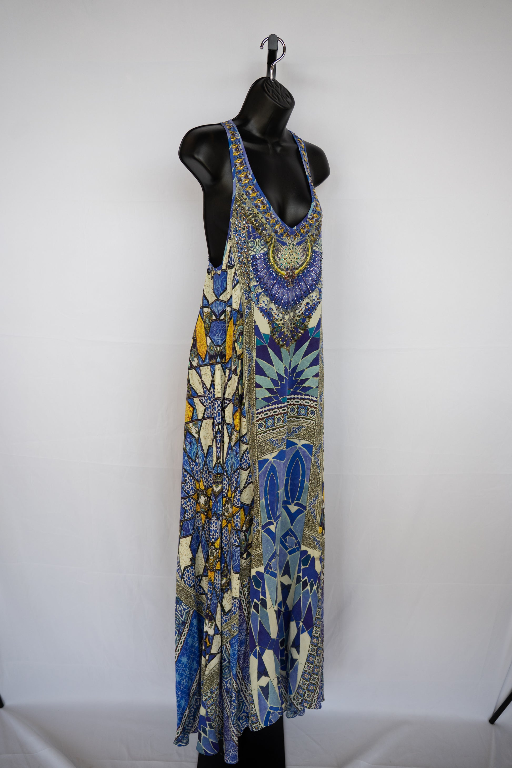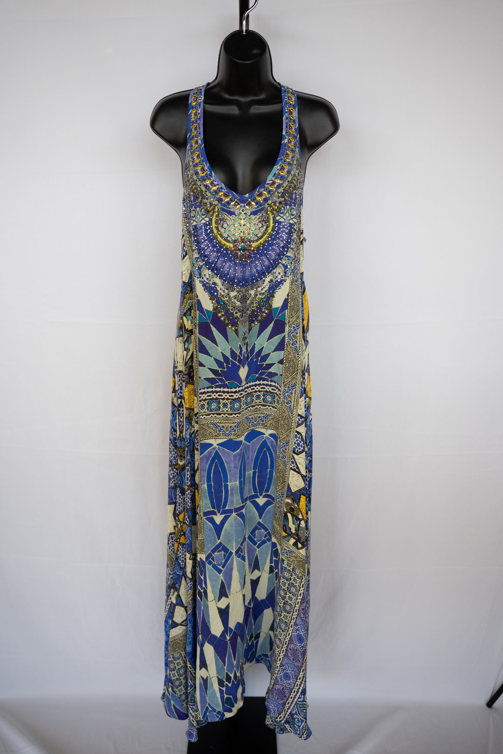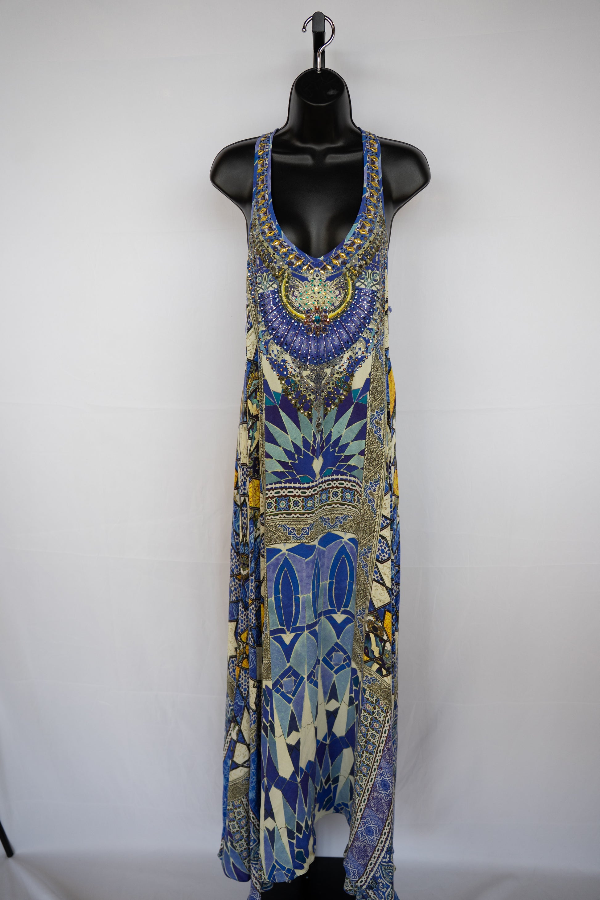 Camilla Blue & Yellow Pattern Sleeveless Maxi Dress w/ Rhinestone Neckline