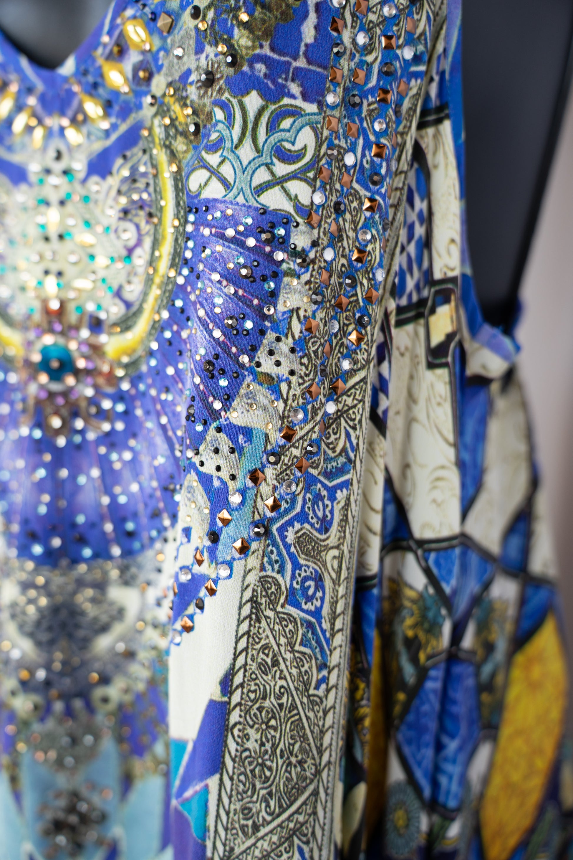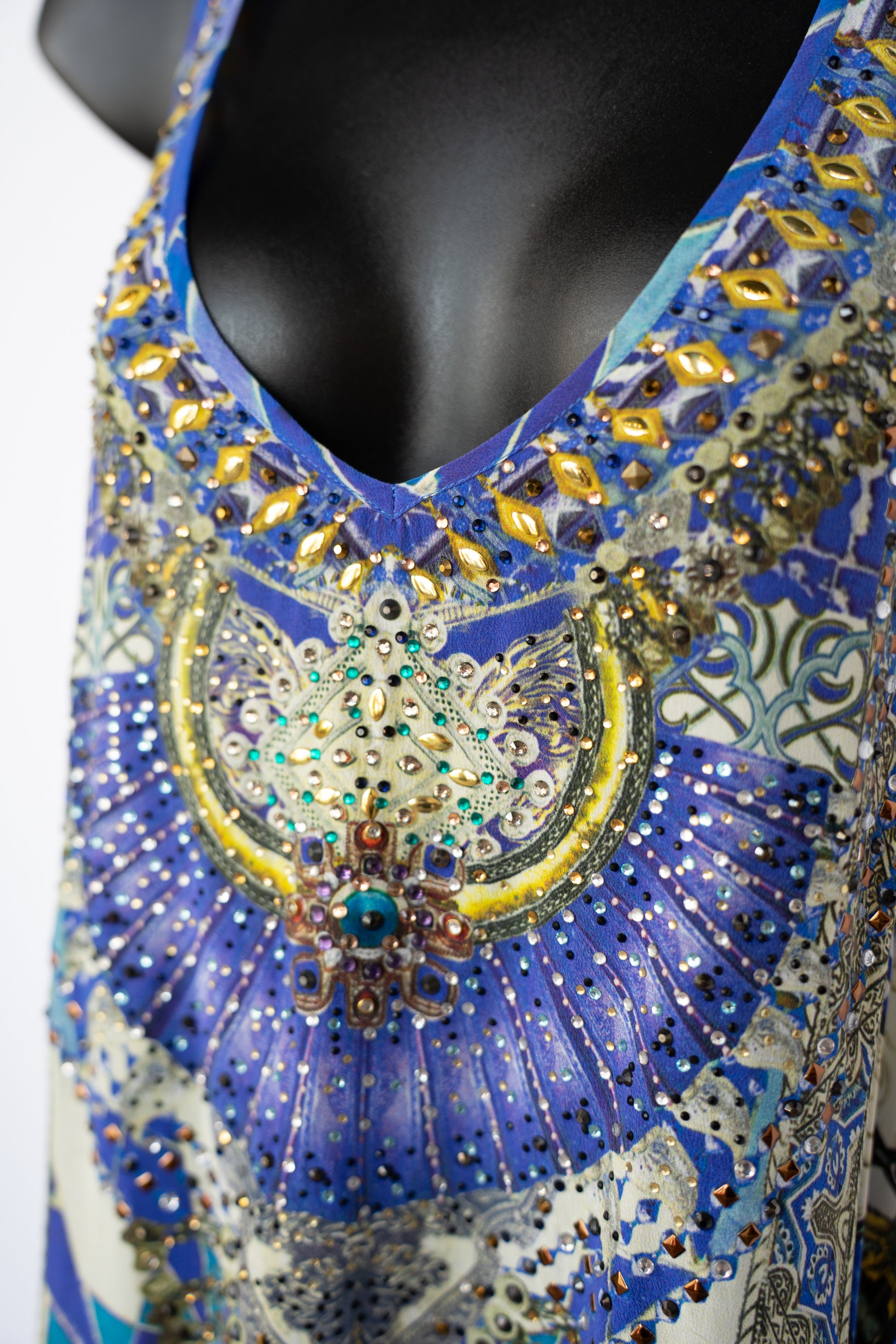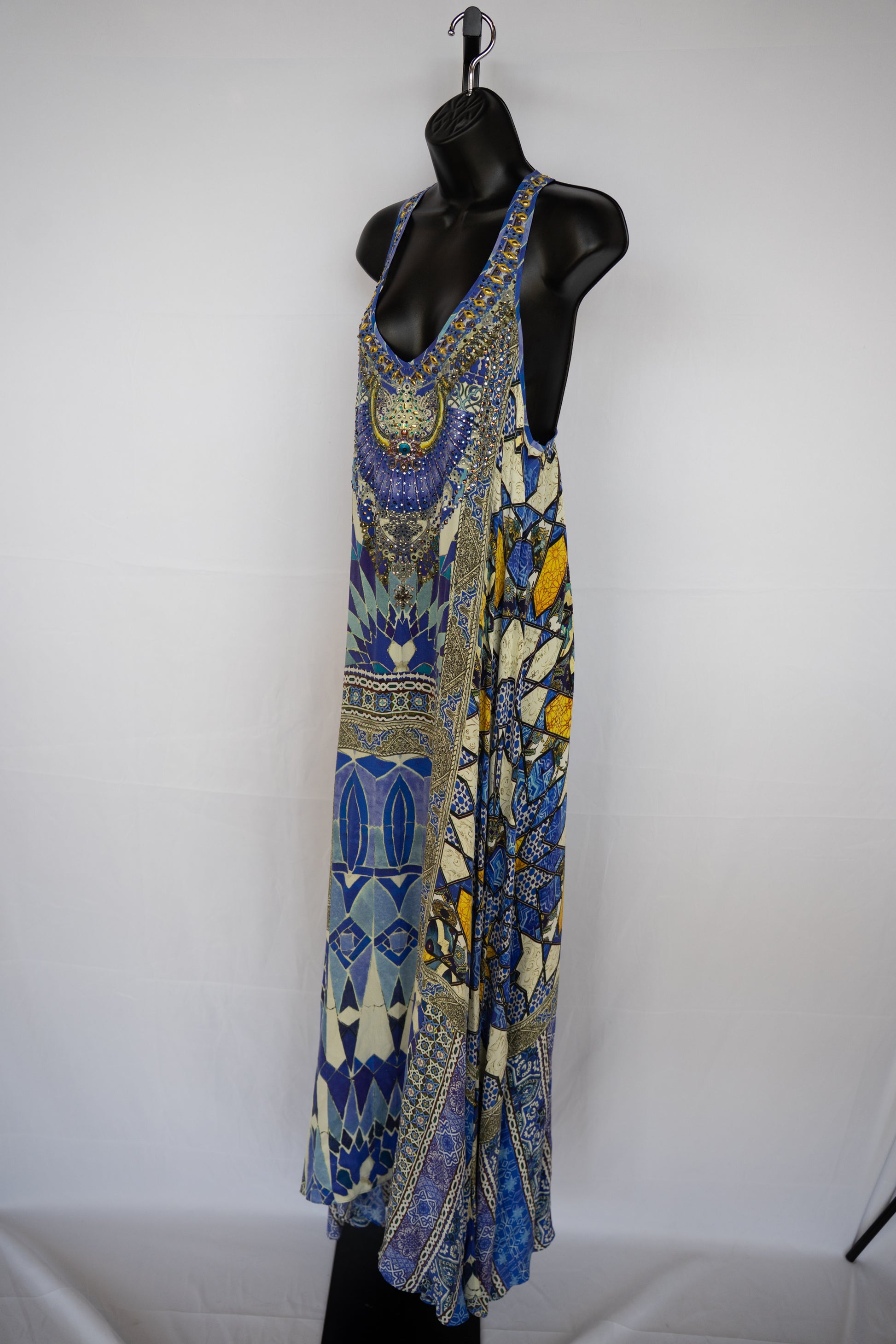 Camilla Blue & Yellow Pattern Sleeveless Maxi Dress w/ Rhinestone Neckline