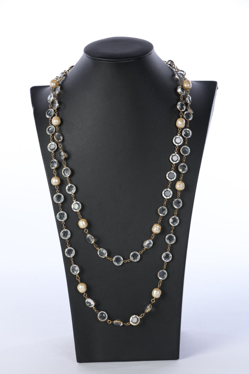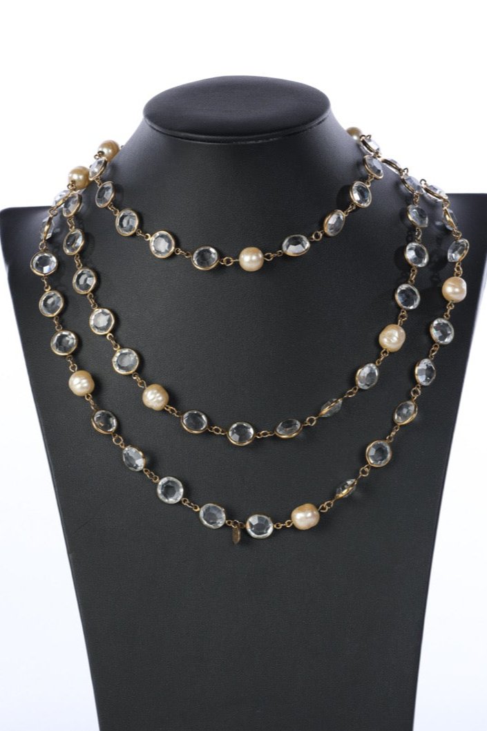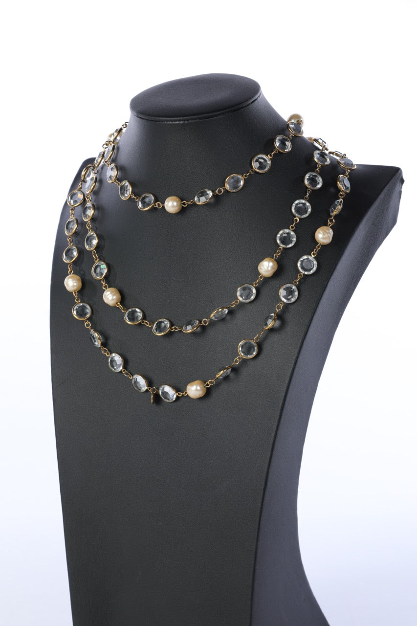 Vintage Chanel 1981 Gold Tone Faux Pearl & Strass Sautoir Single Stand Station Necklace