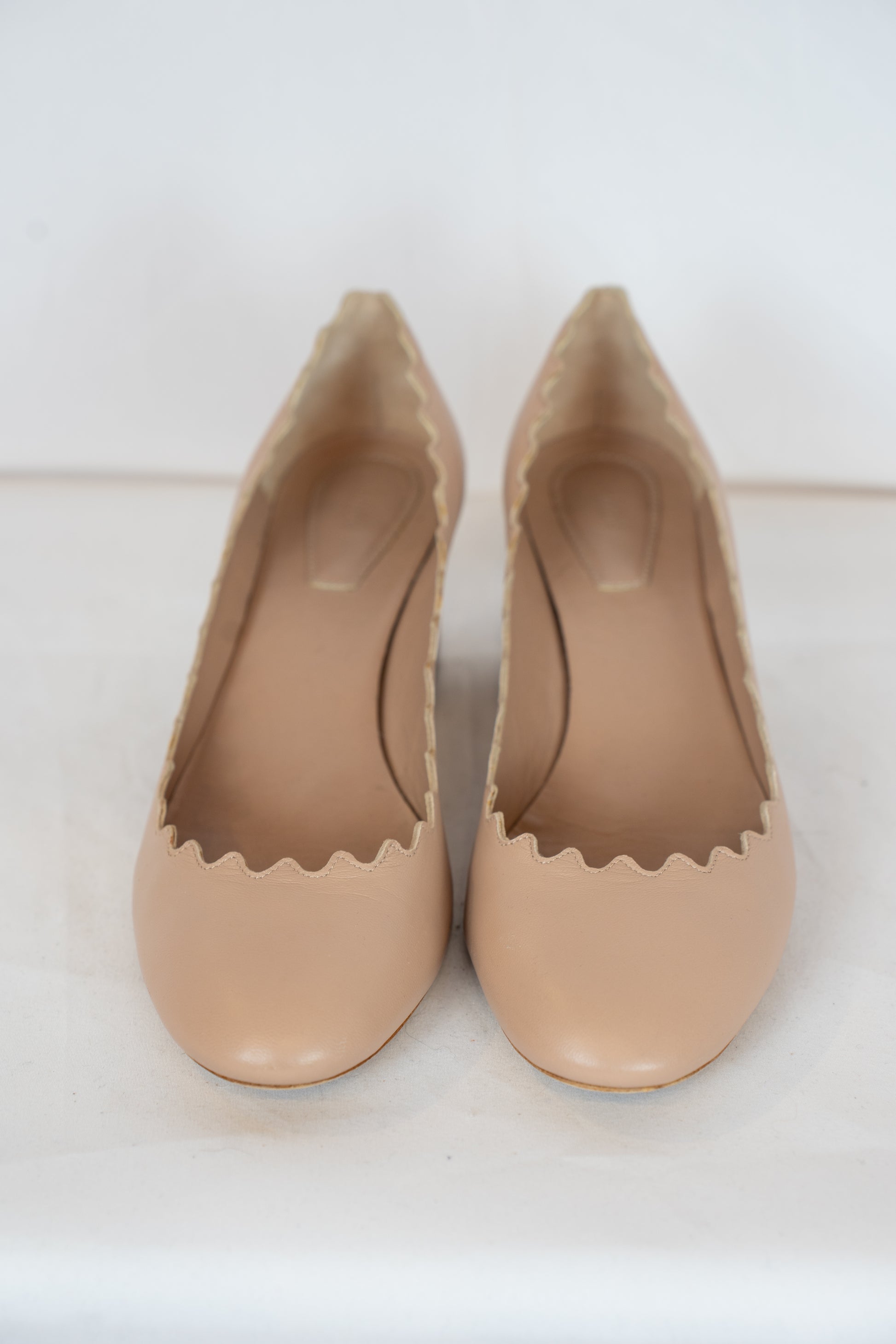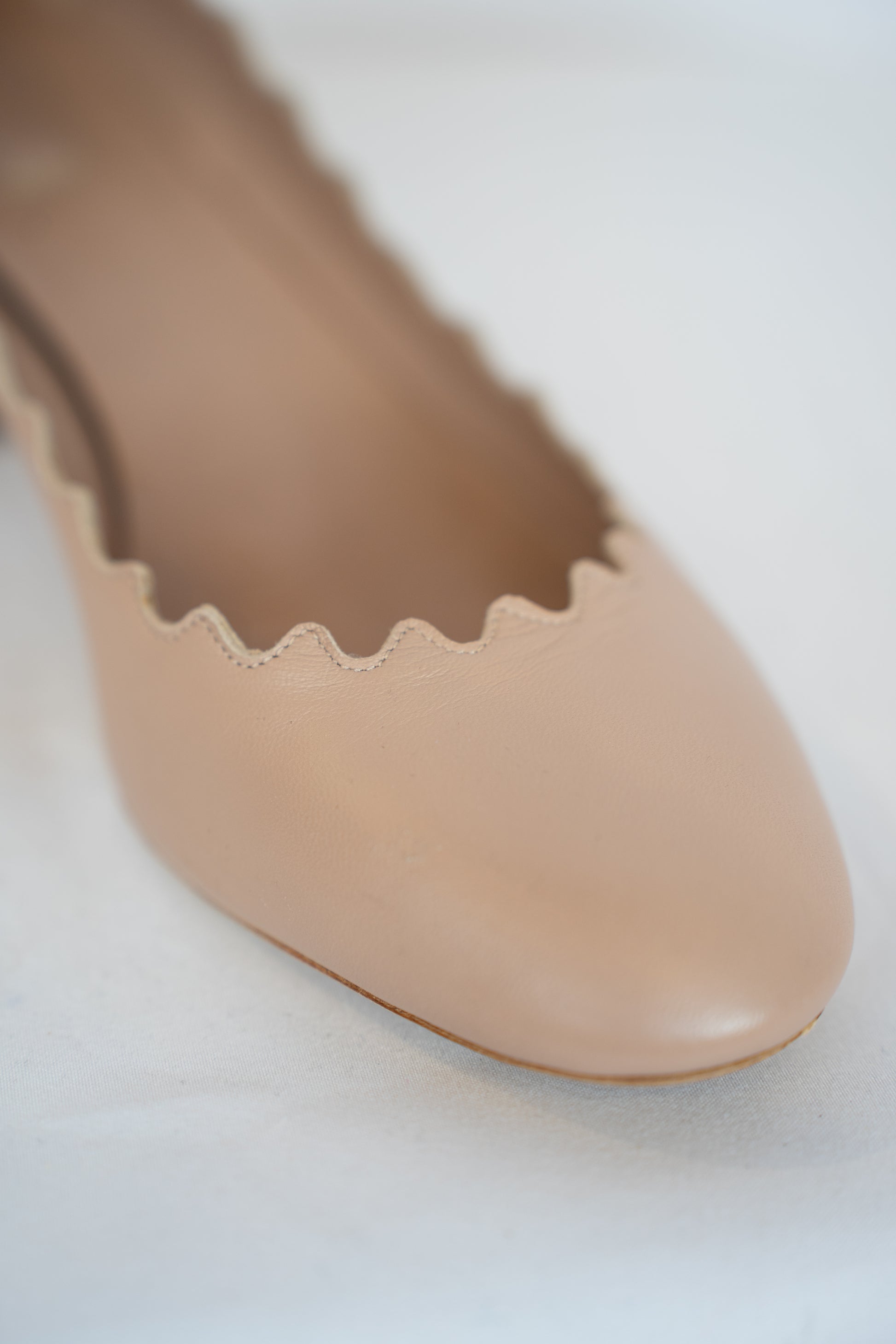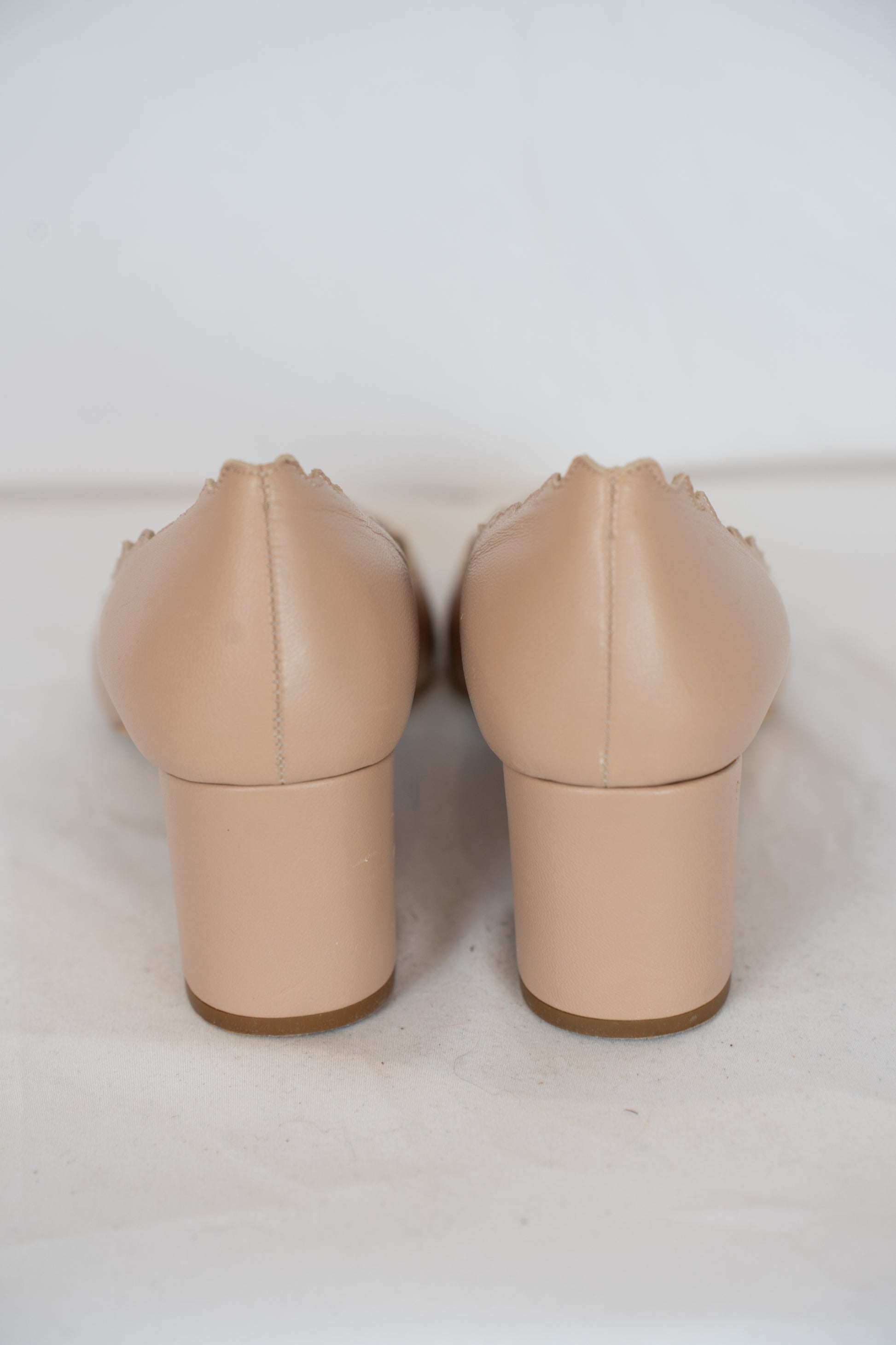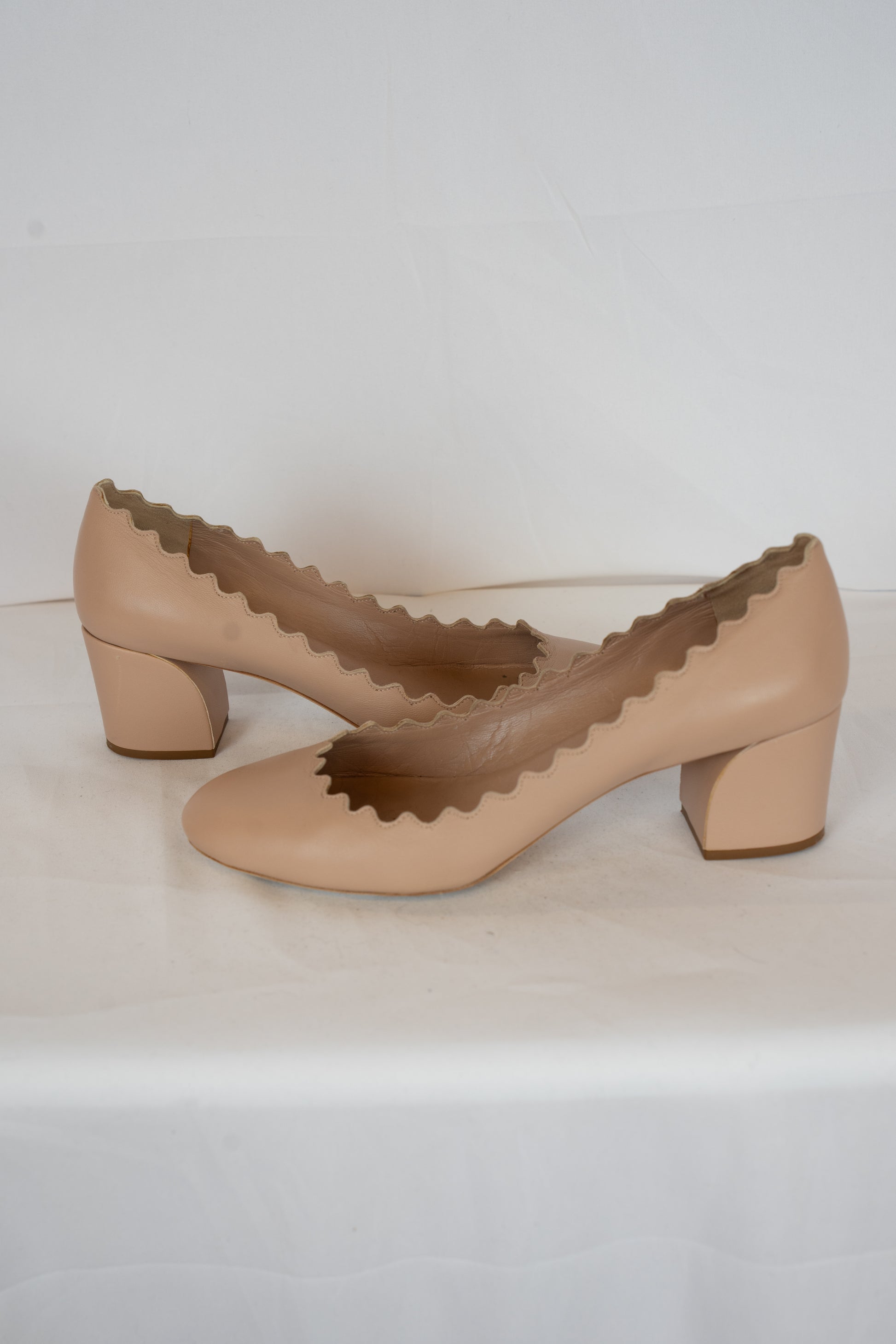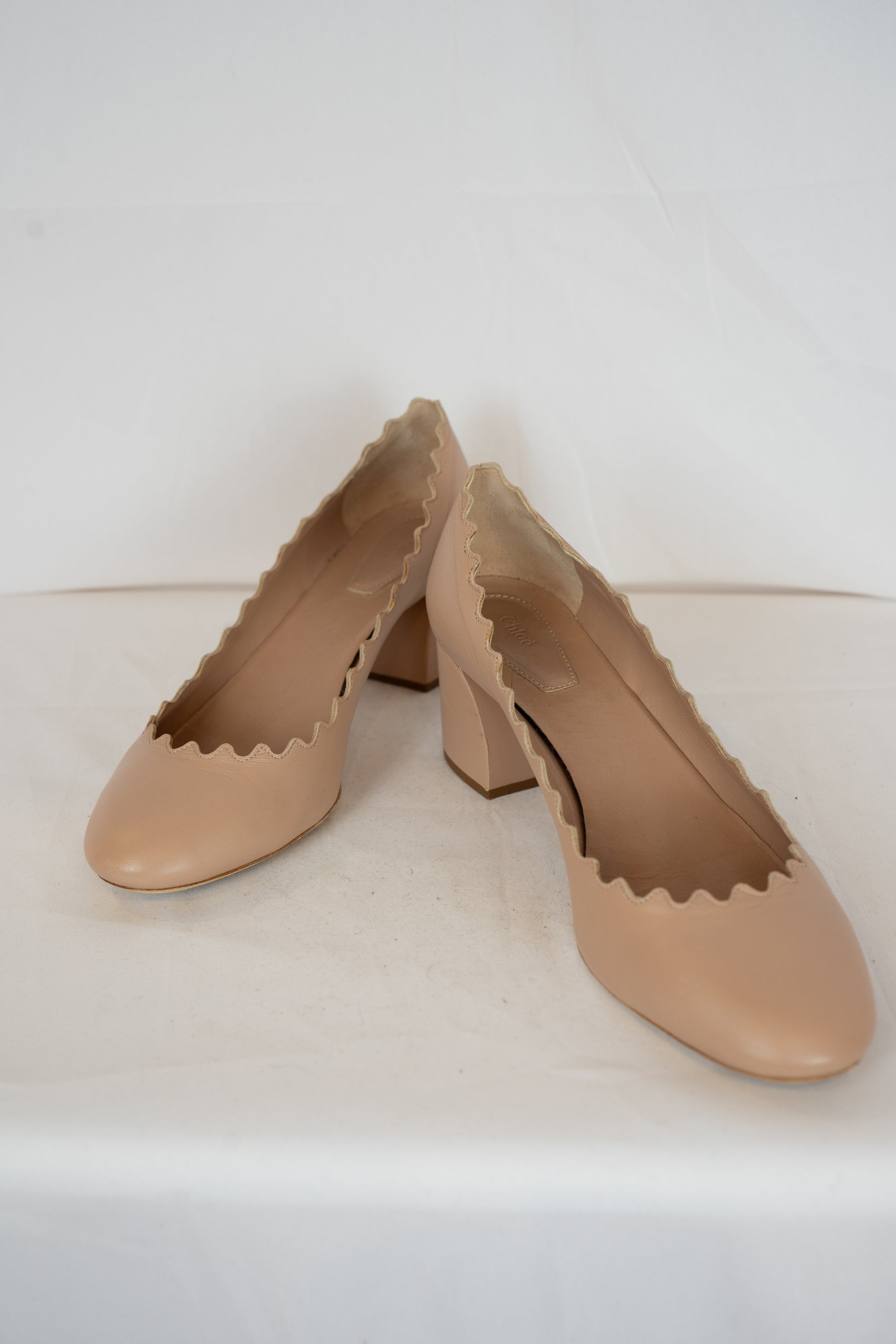 Chloe Leather Scalloped Chunk Heel Round Toe Pumps