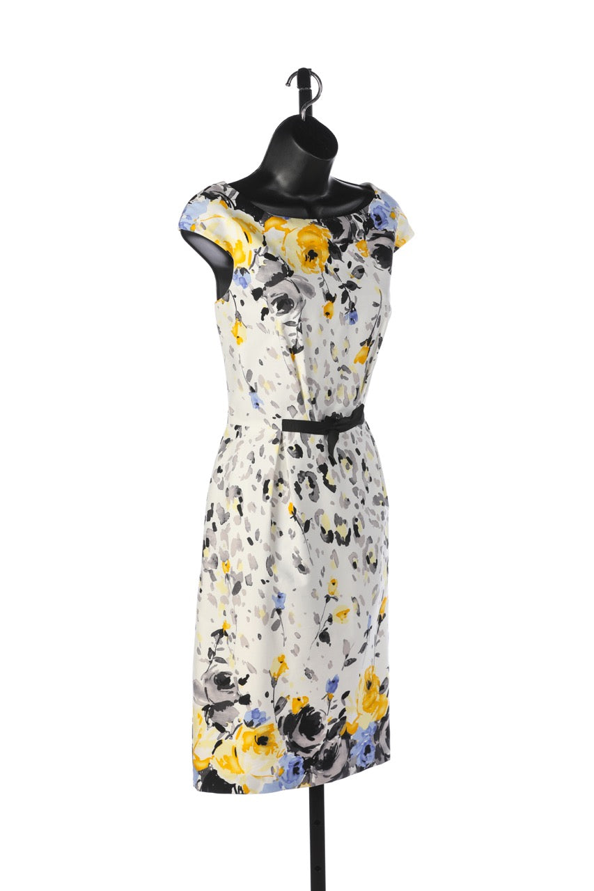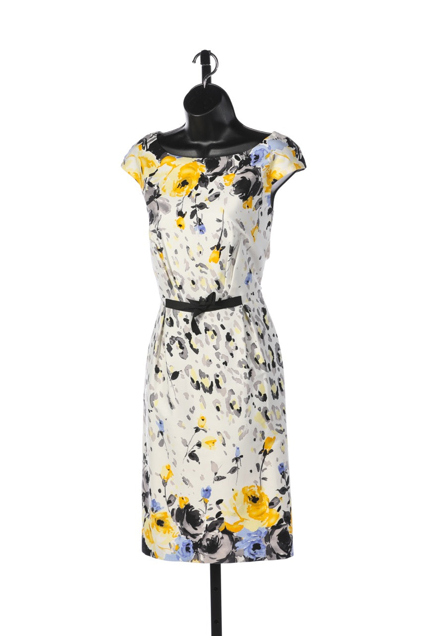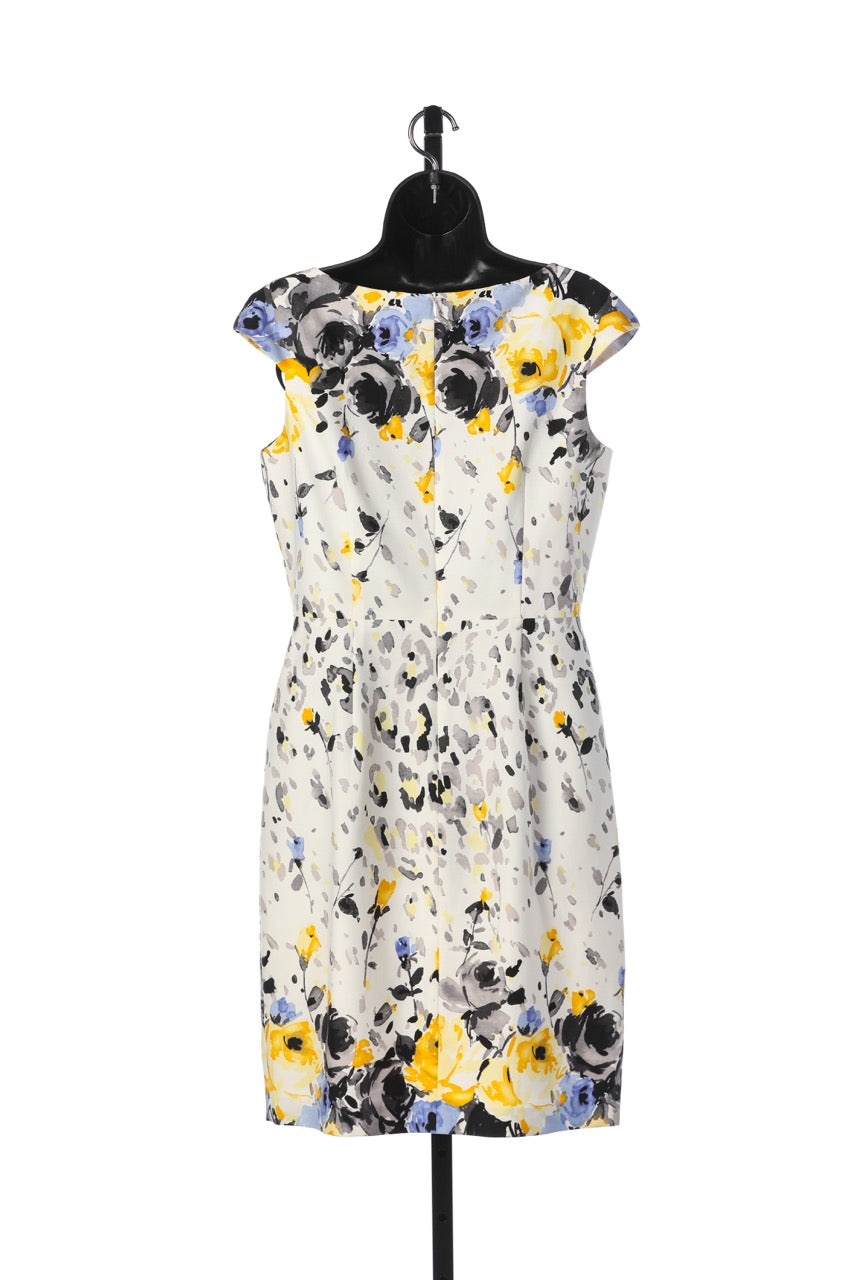 David Meister White Knee-Length Cap-Sleeve Dress w/ Yellow Grey & Blue Floral Print NWT