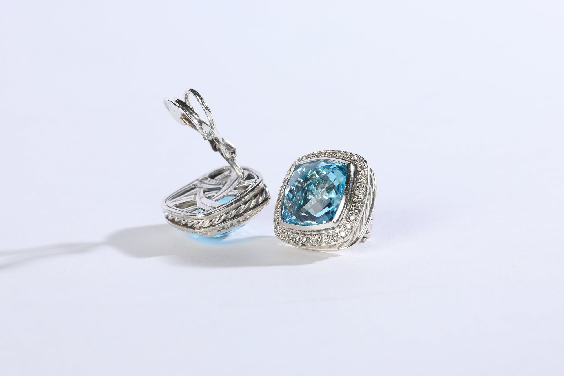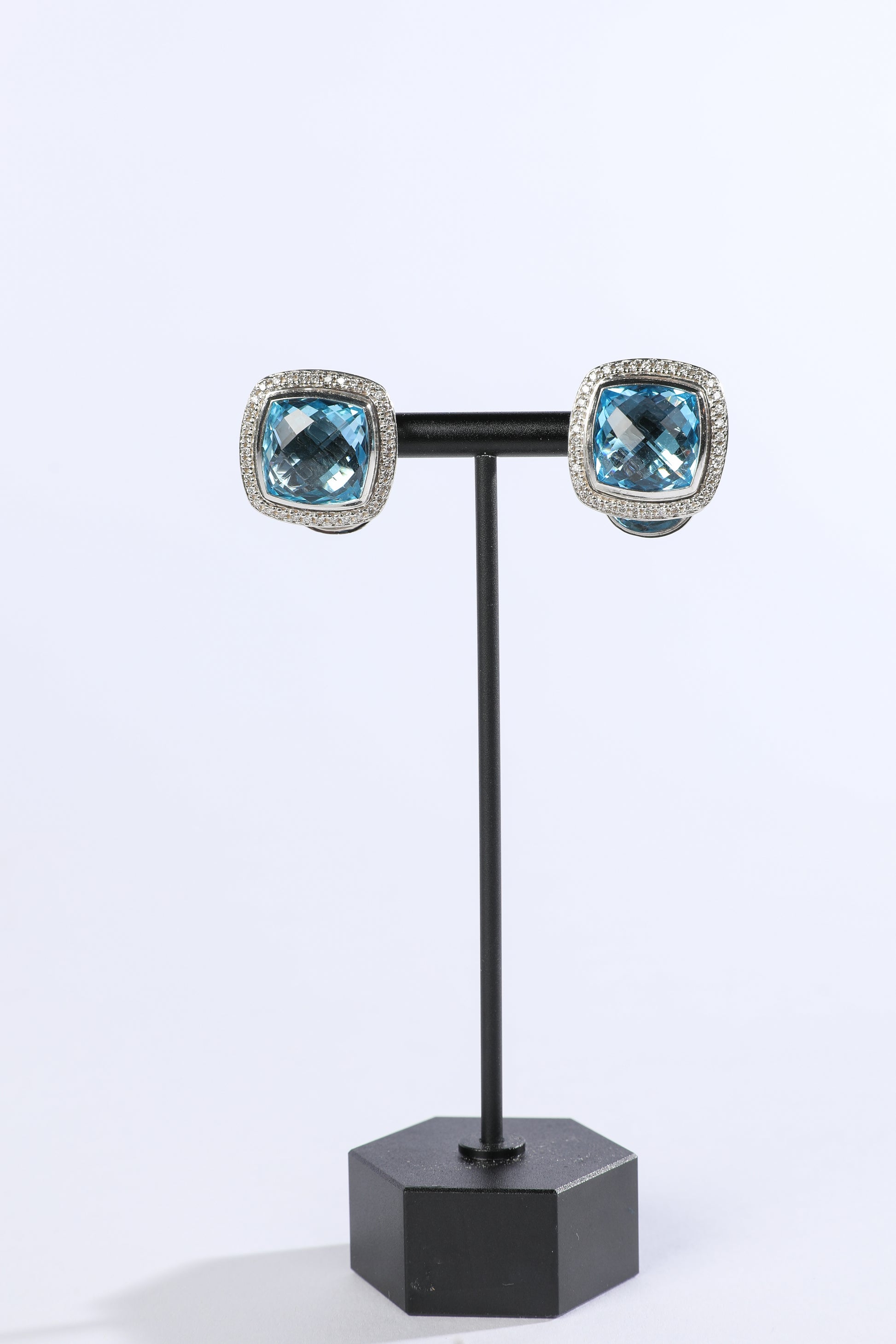 David Yurman "Albion" Clip On Earrings Sterling Silver with Blue Topaz and Diamond, 11mm
