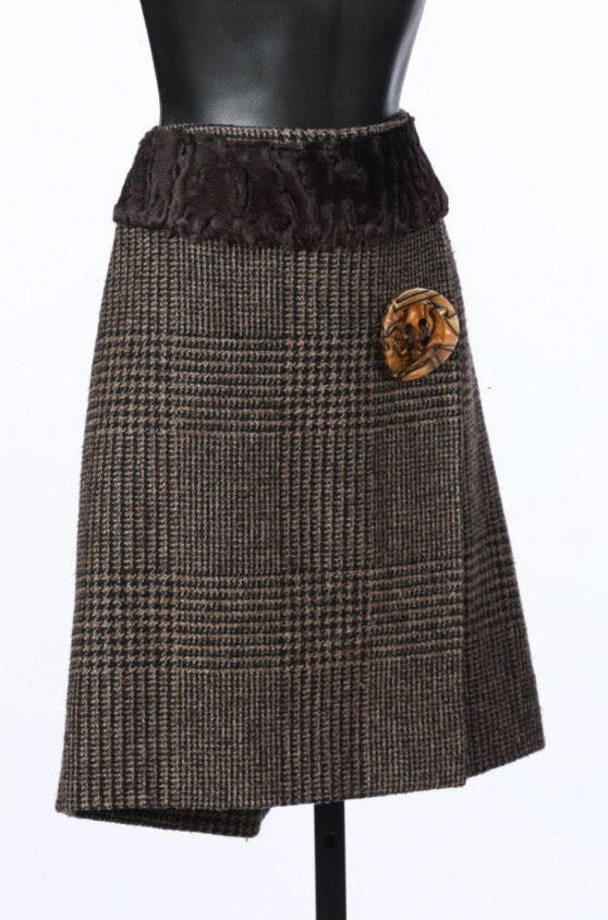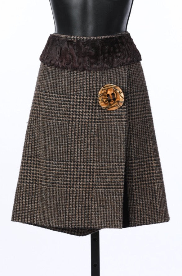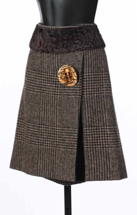 Dolce & Gabbana Brown Houndstooth Print Knee-Length Skirt w Giant Button Detail