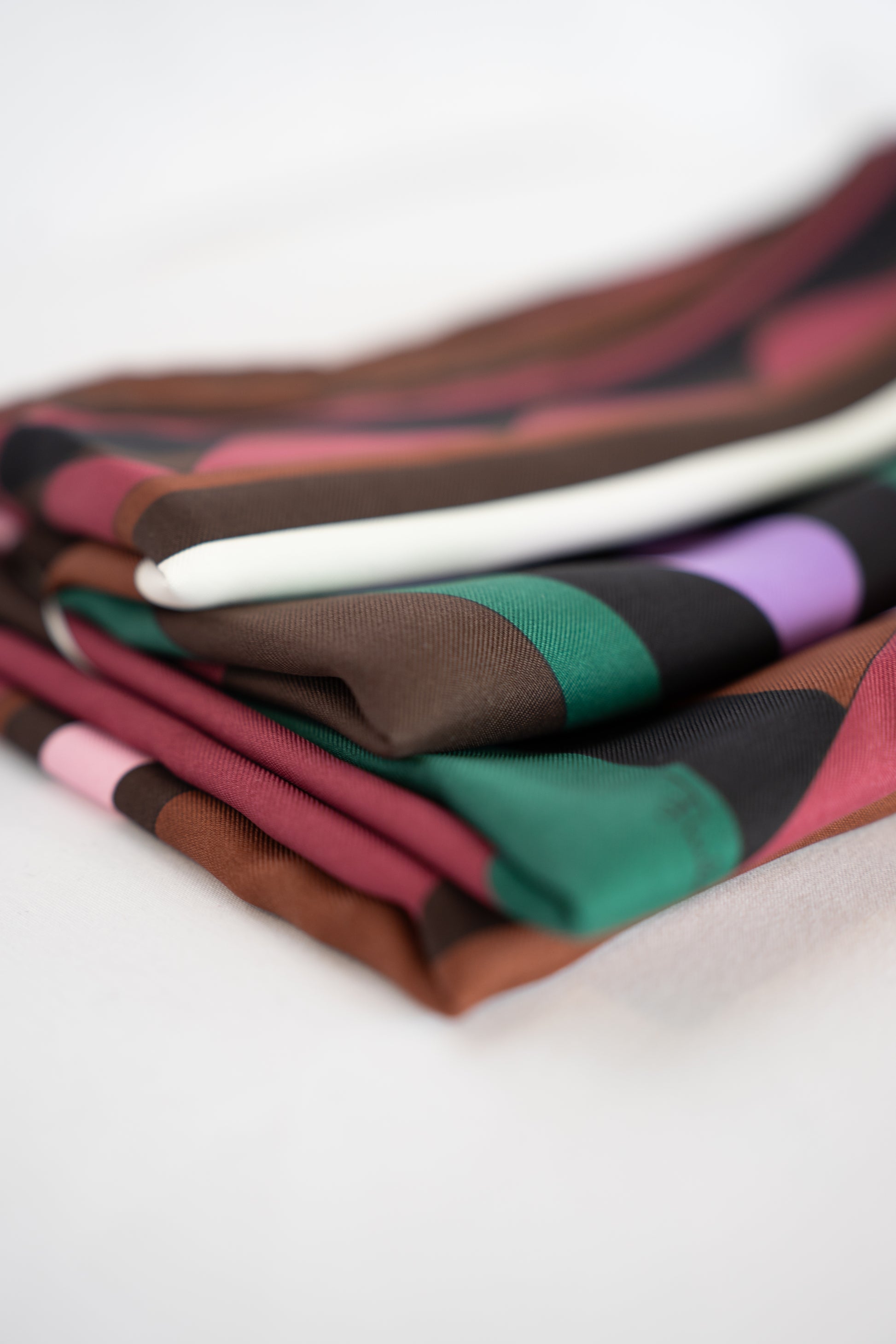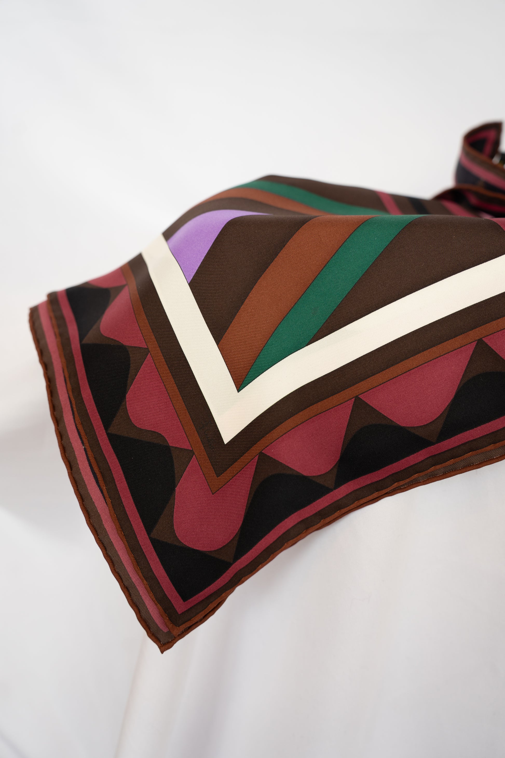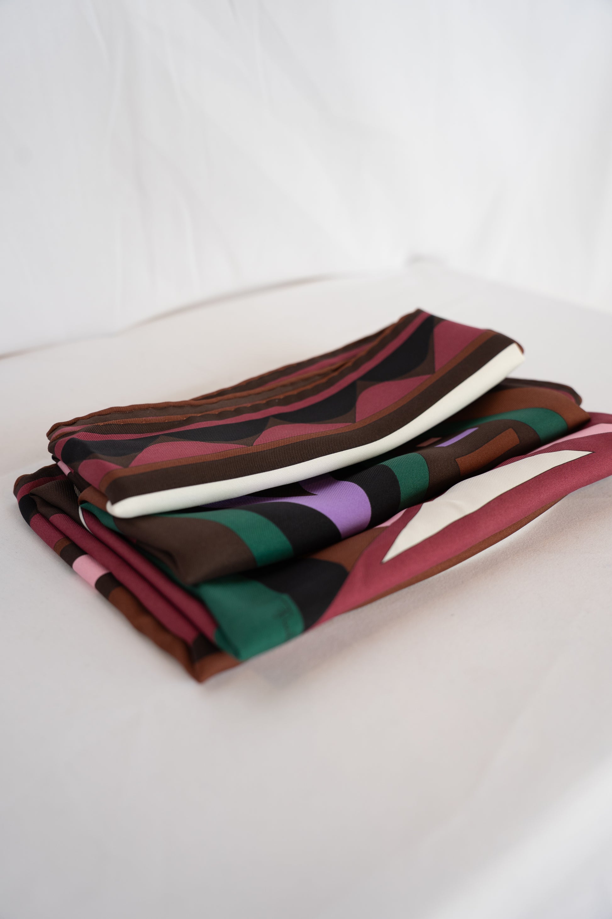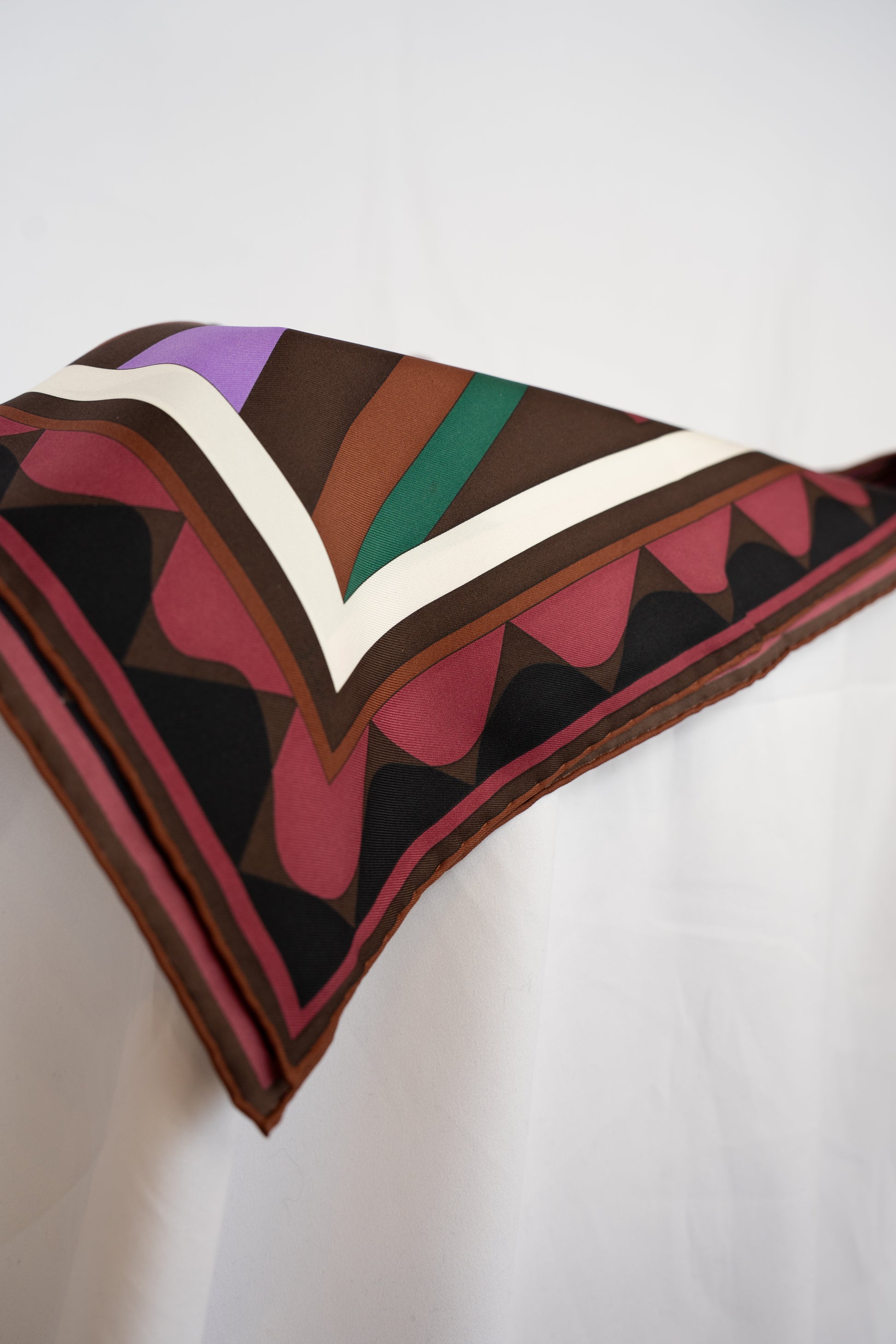 COMES WITH BOX - Emilio Pucci Silk Pink, Purple, Maroon, Green & Brown Art Deco Print Scarf
