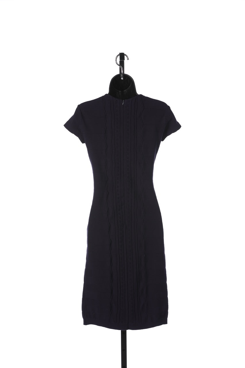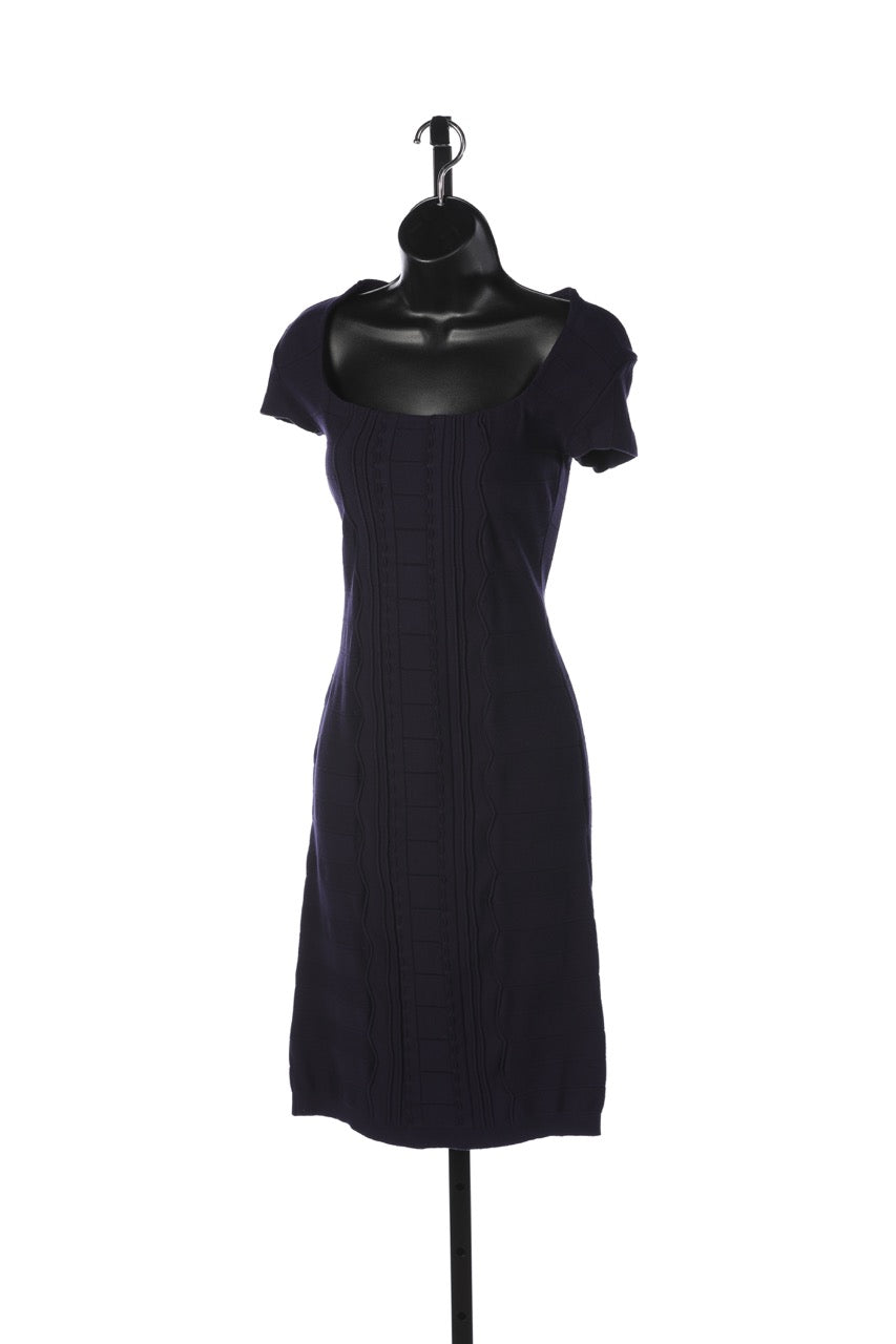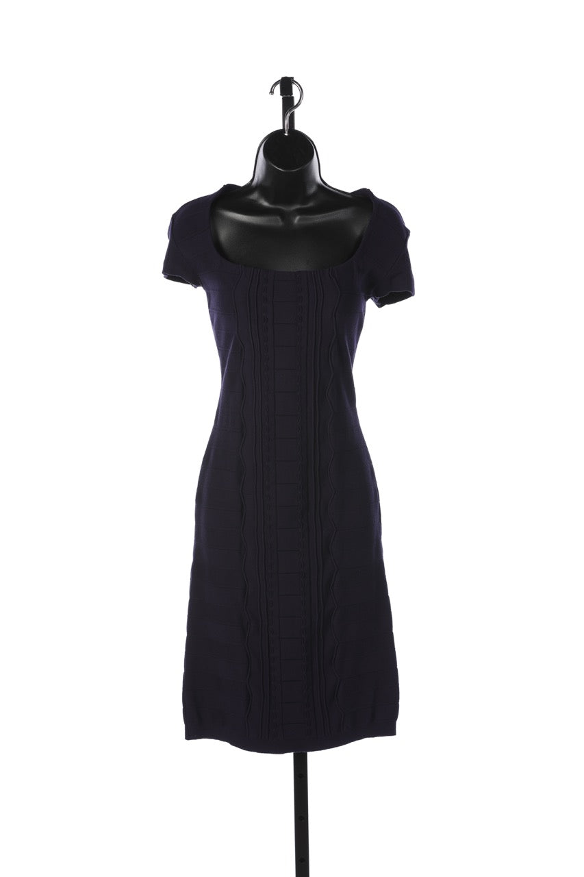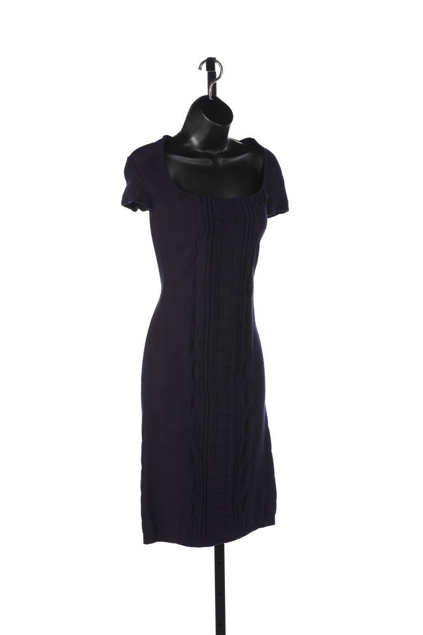 Escada Navy Cap Sleeve Square-Neck Bandage Knee-Length Dress w Embroidered Line Detail