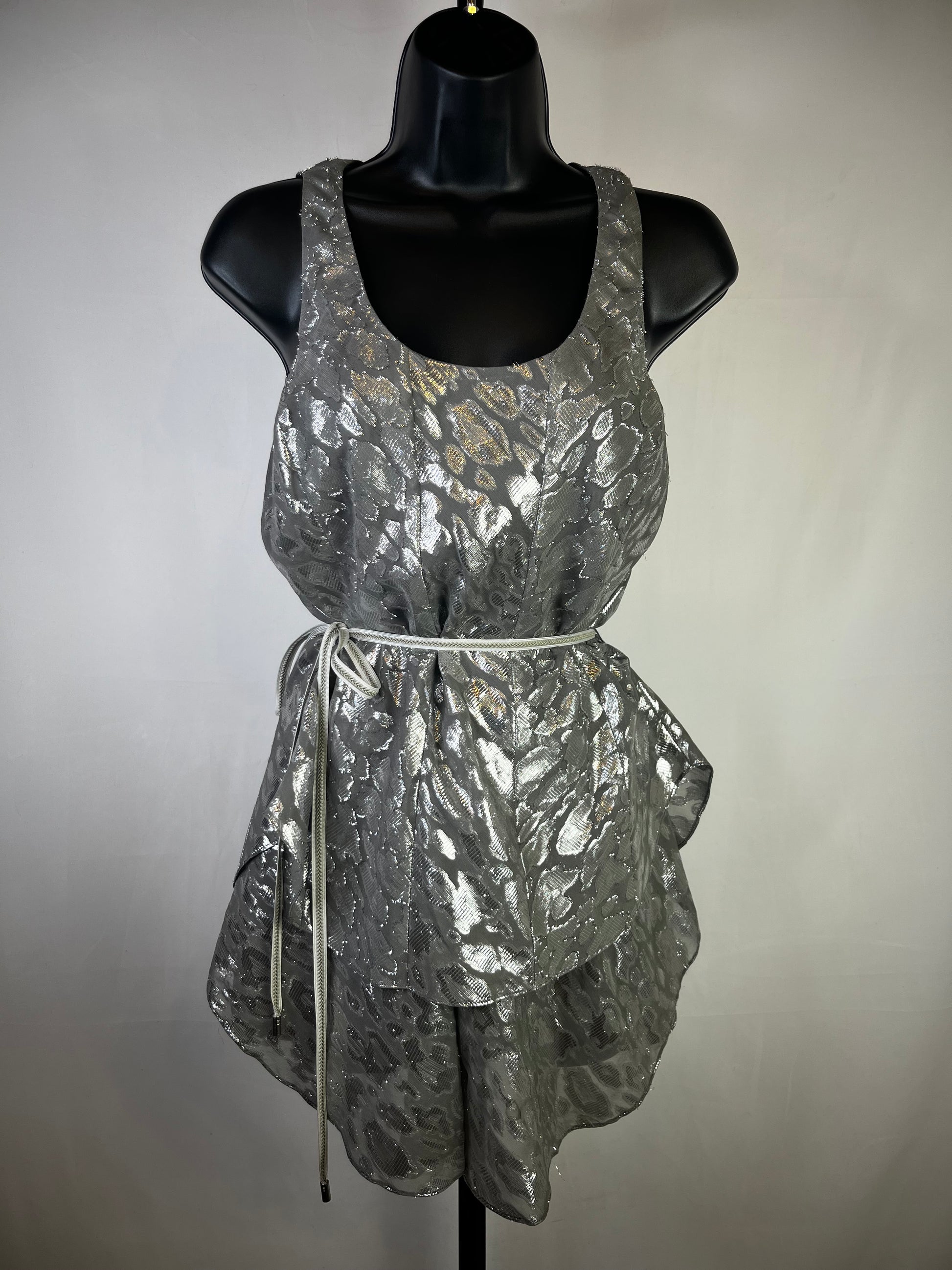 Etcetera Silk Grey & Silver Sleeveless Blouse w/ Waist Tie