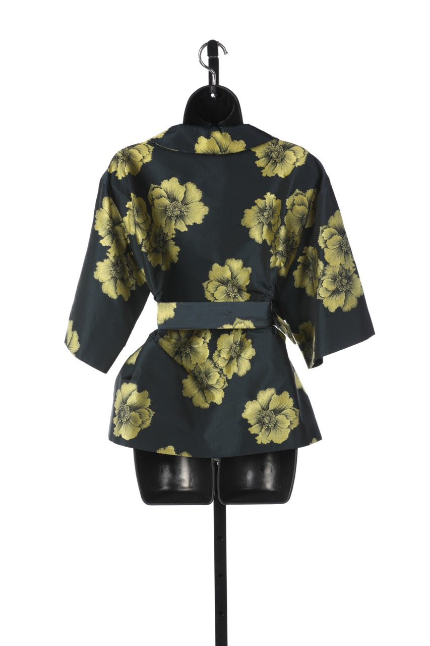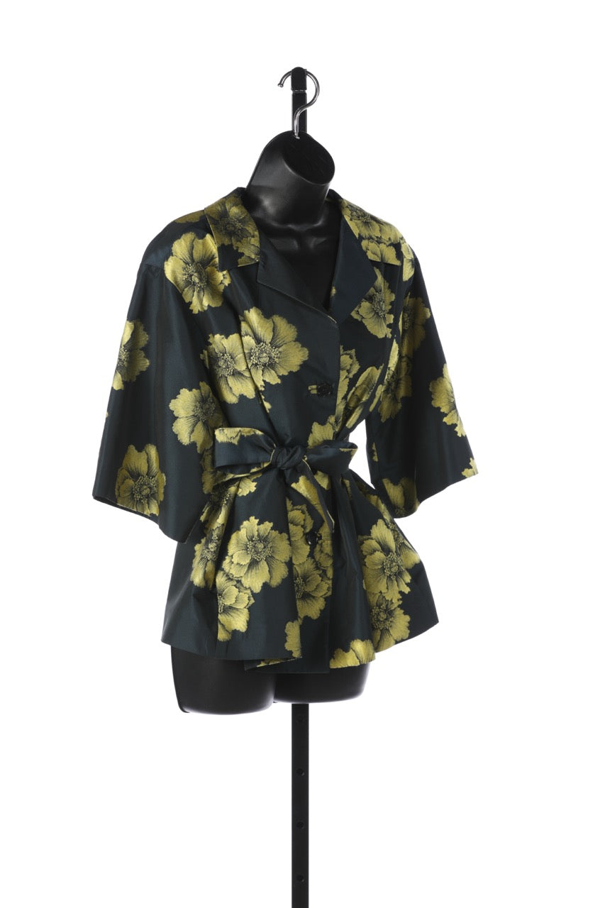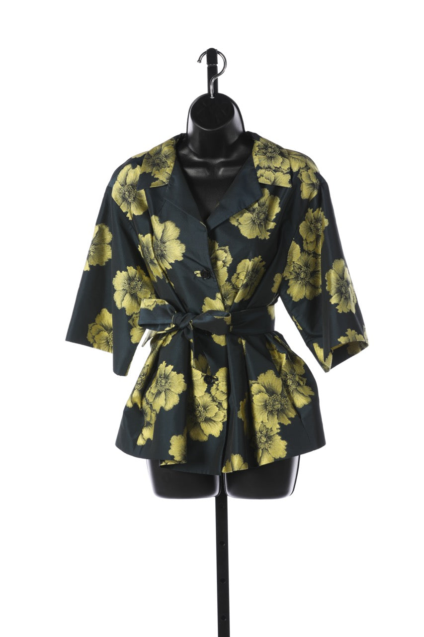 Etro Navy Lime Green Satin Floral Print Structured Belted Blouse