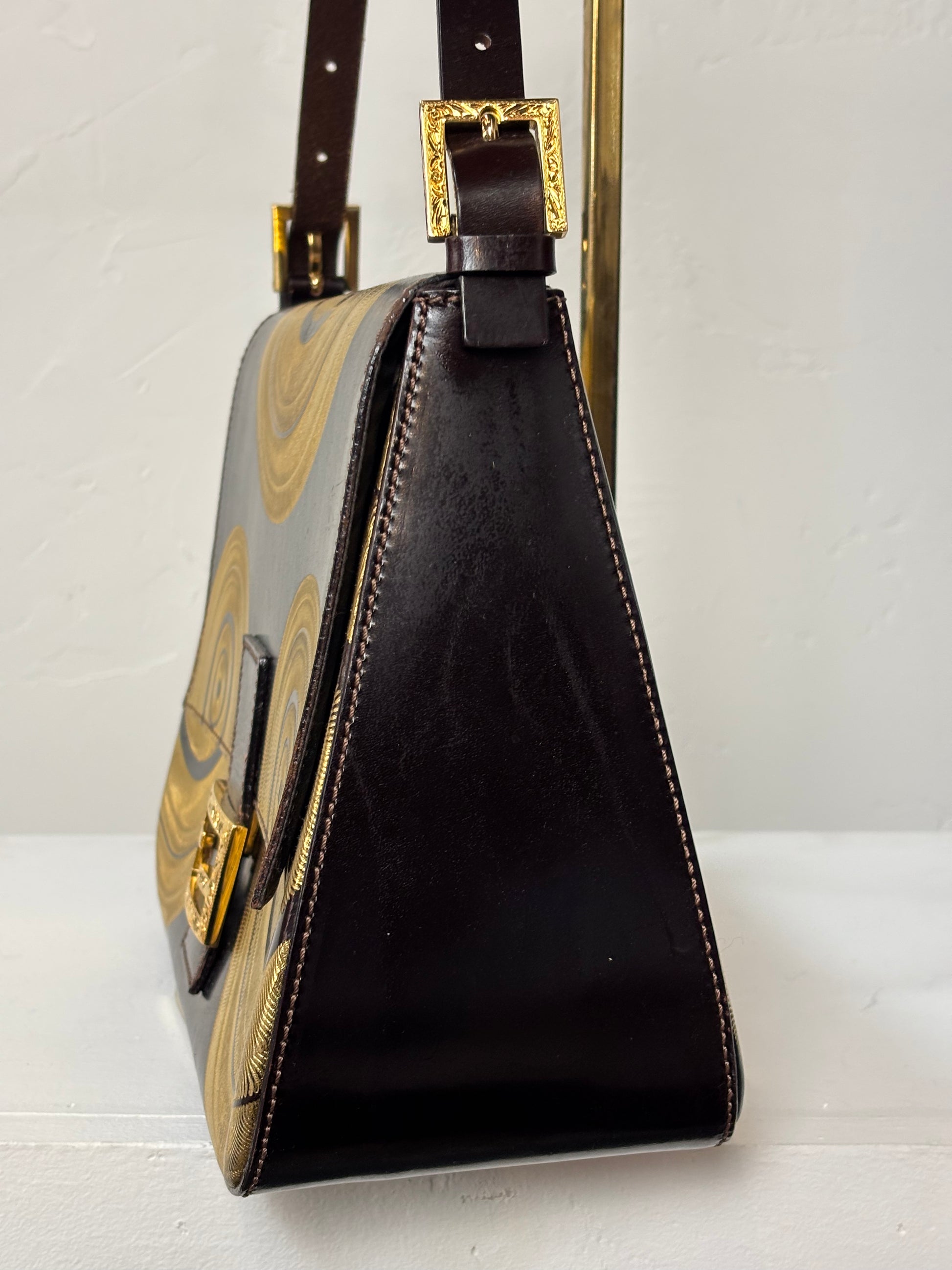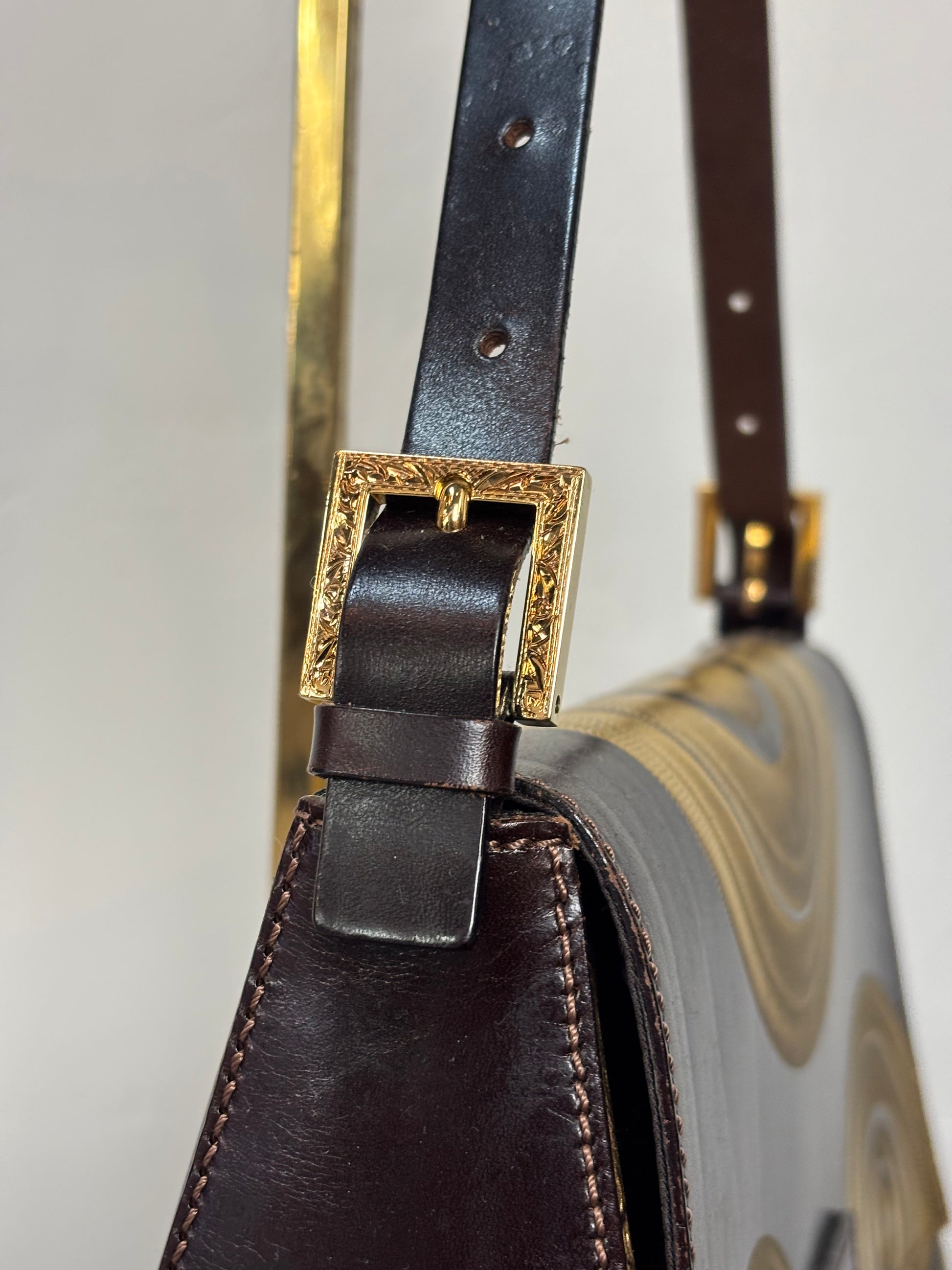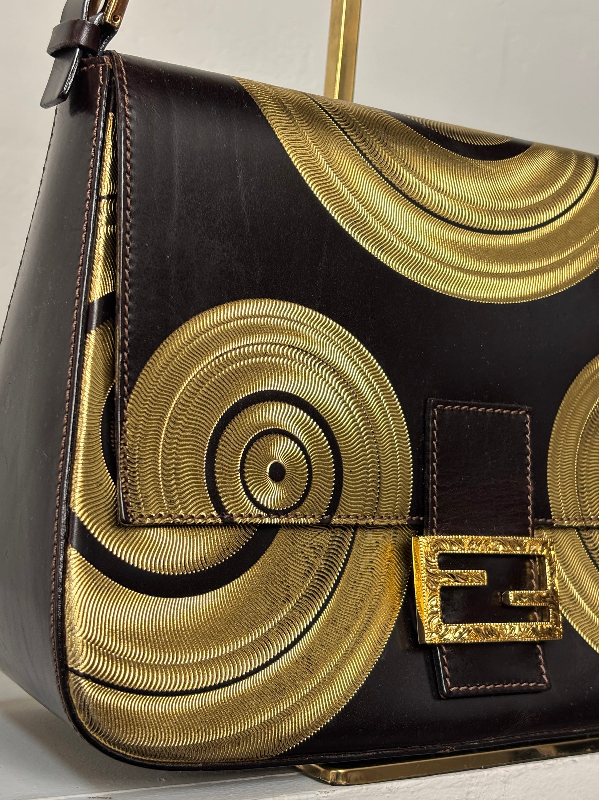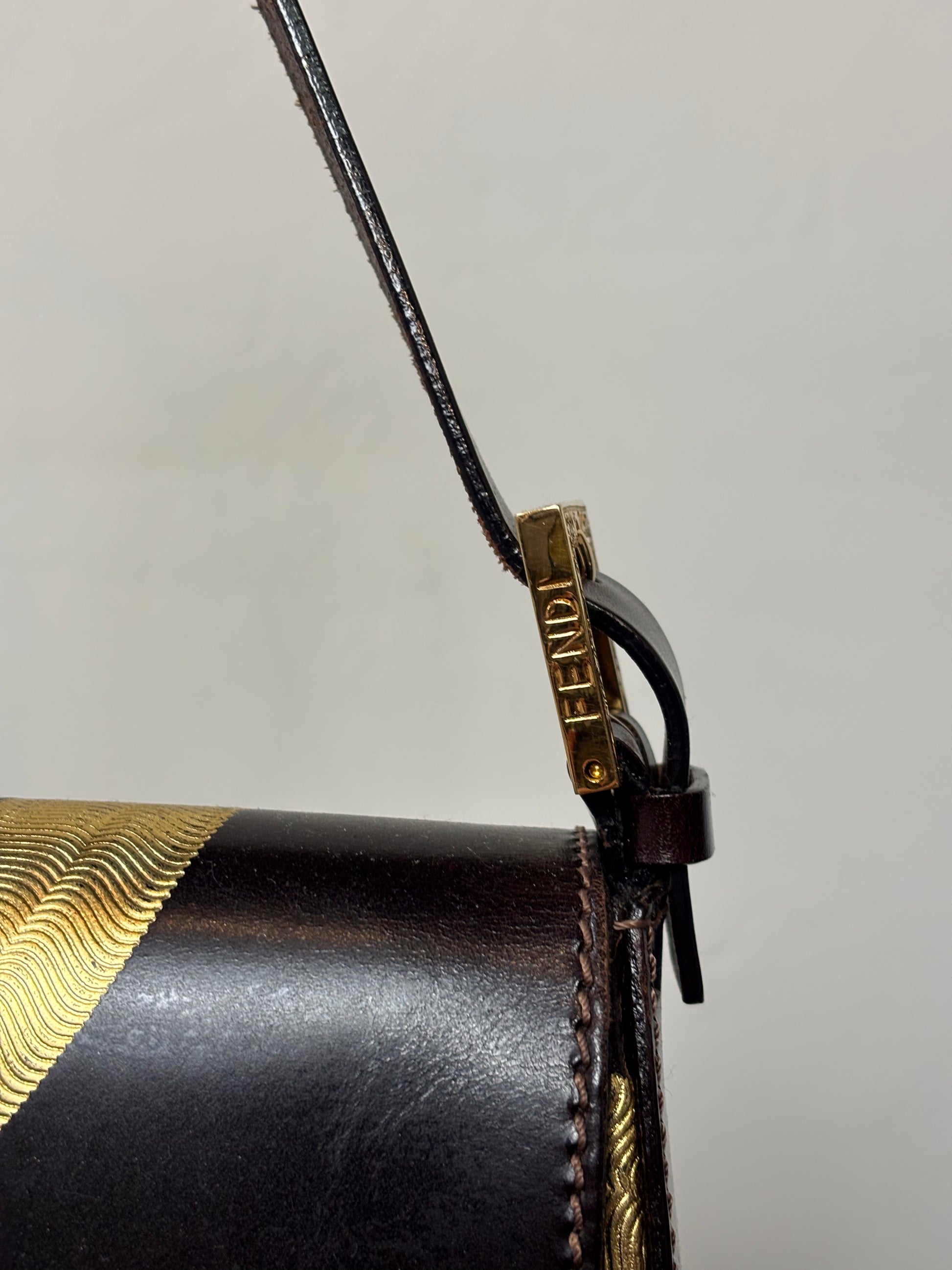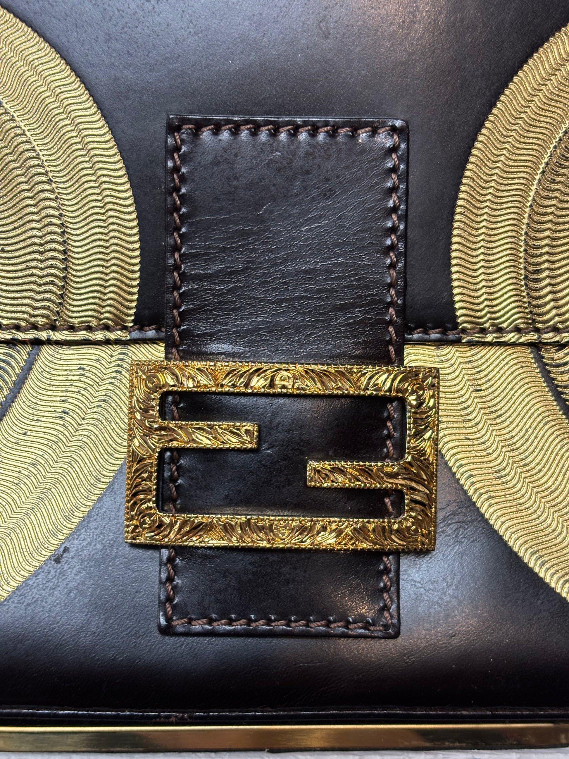 Fendi Brown Leather w/ Gold Metallic Swirls Flap Bag