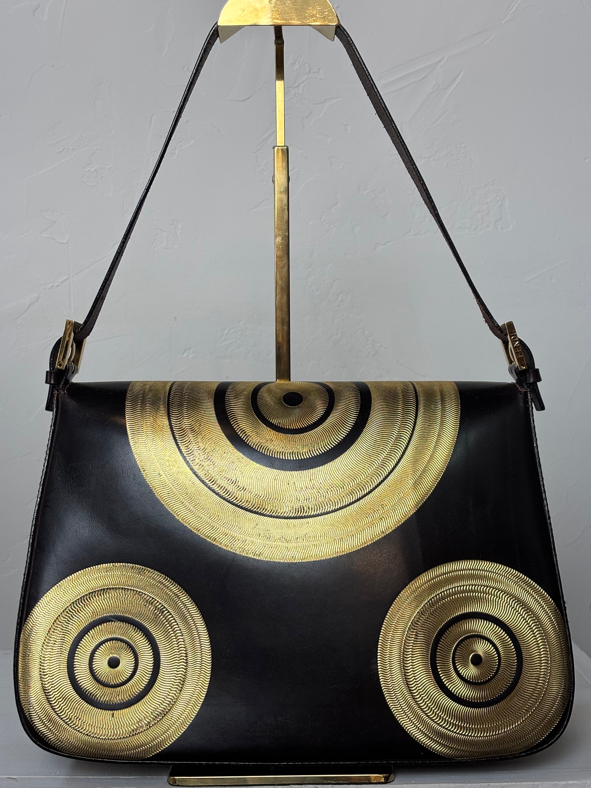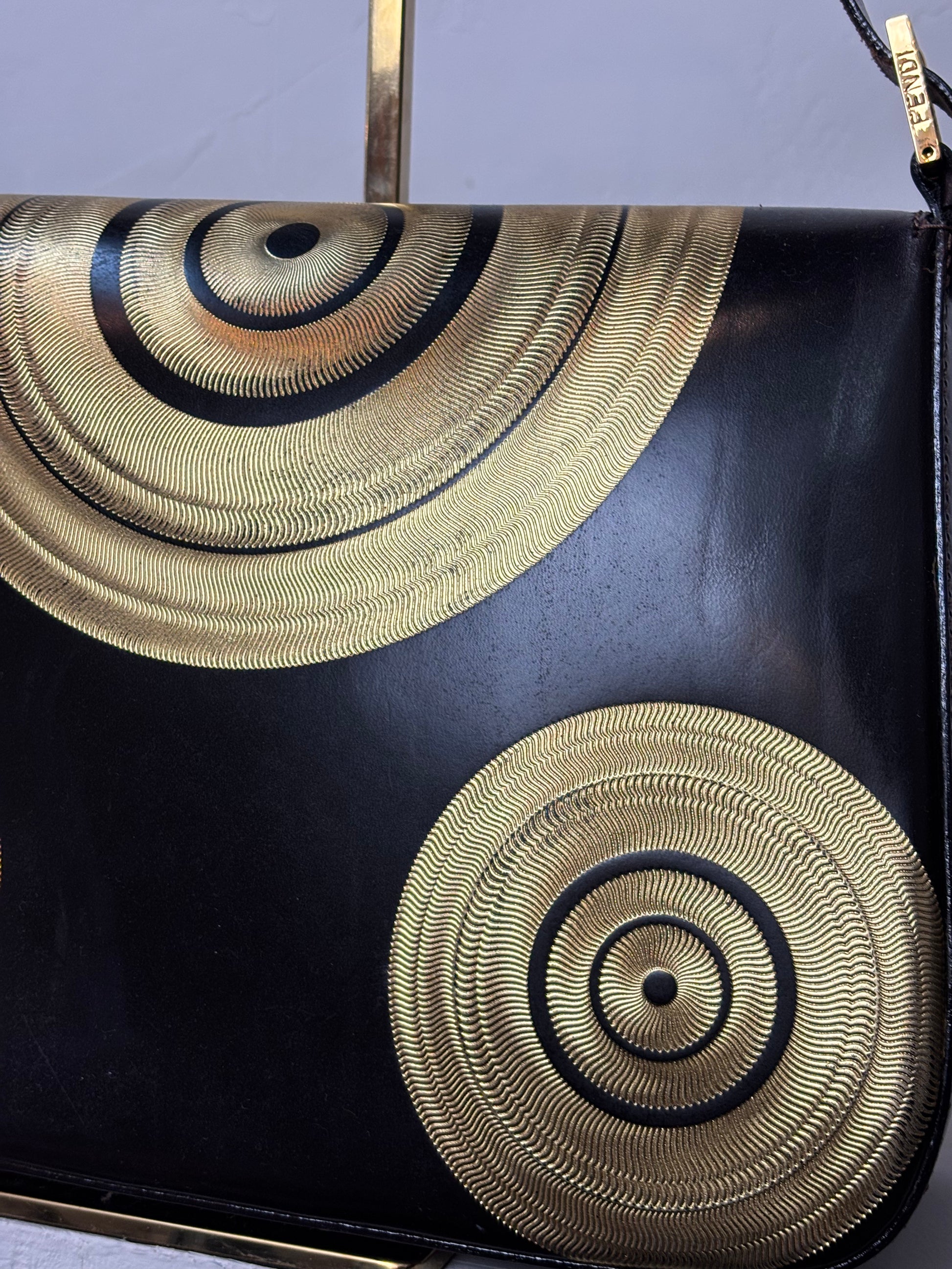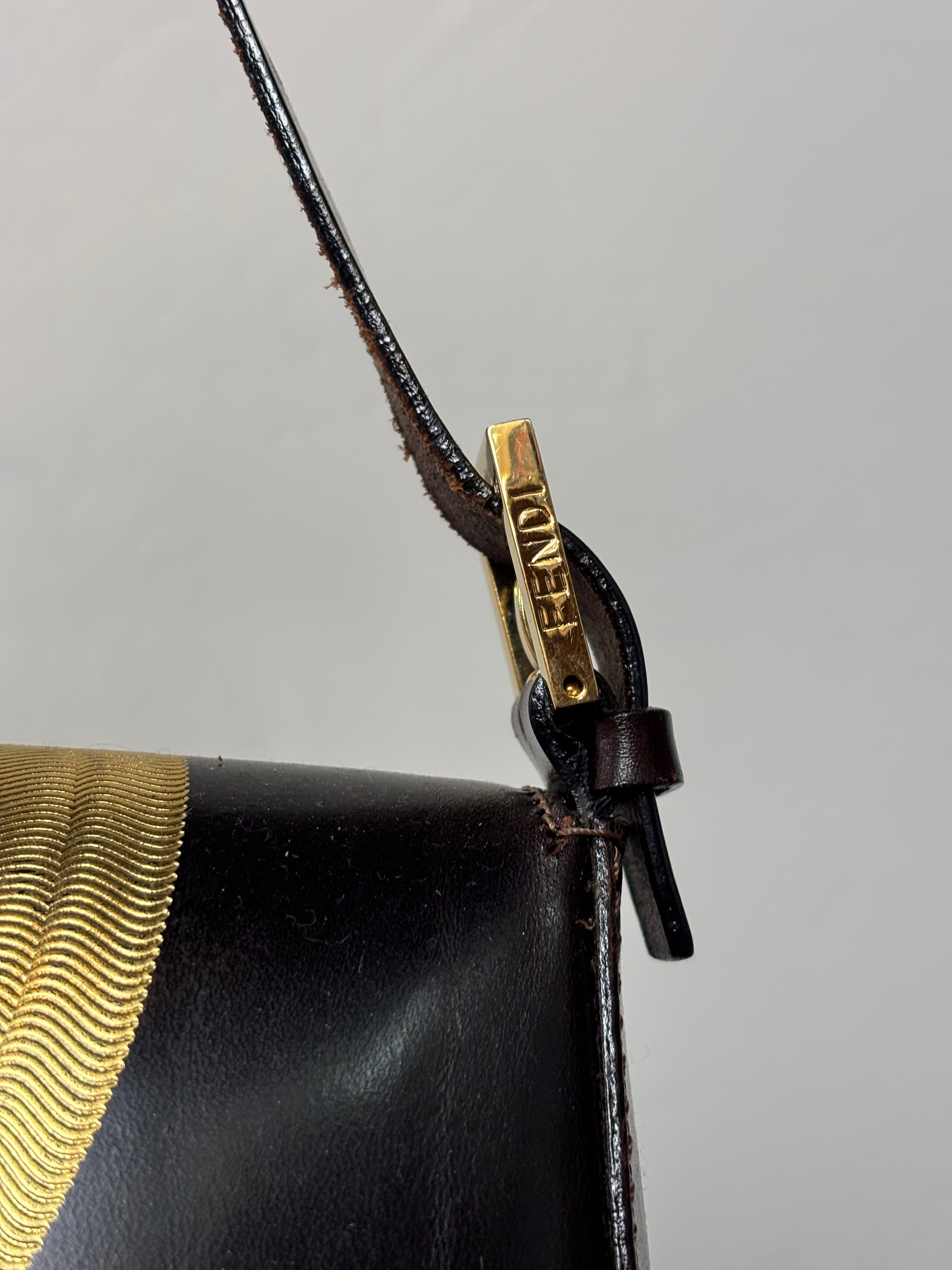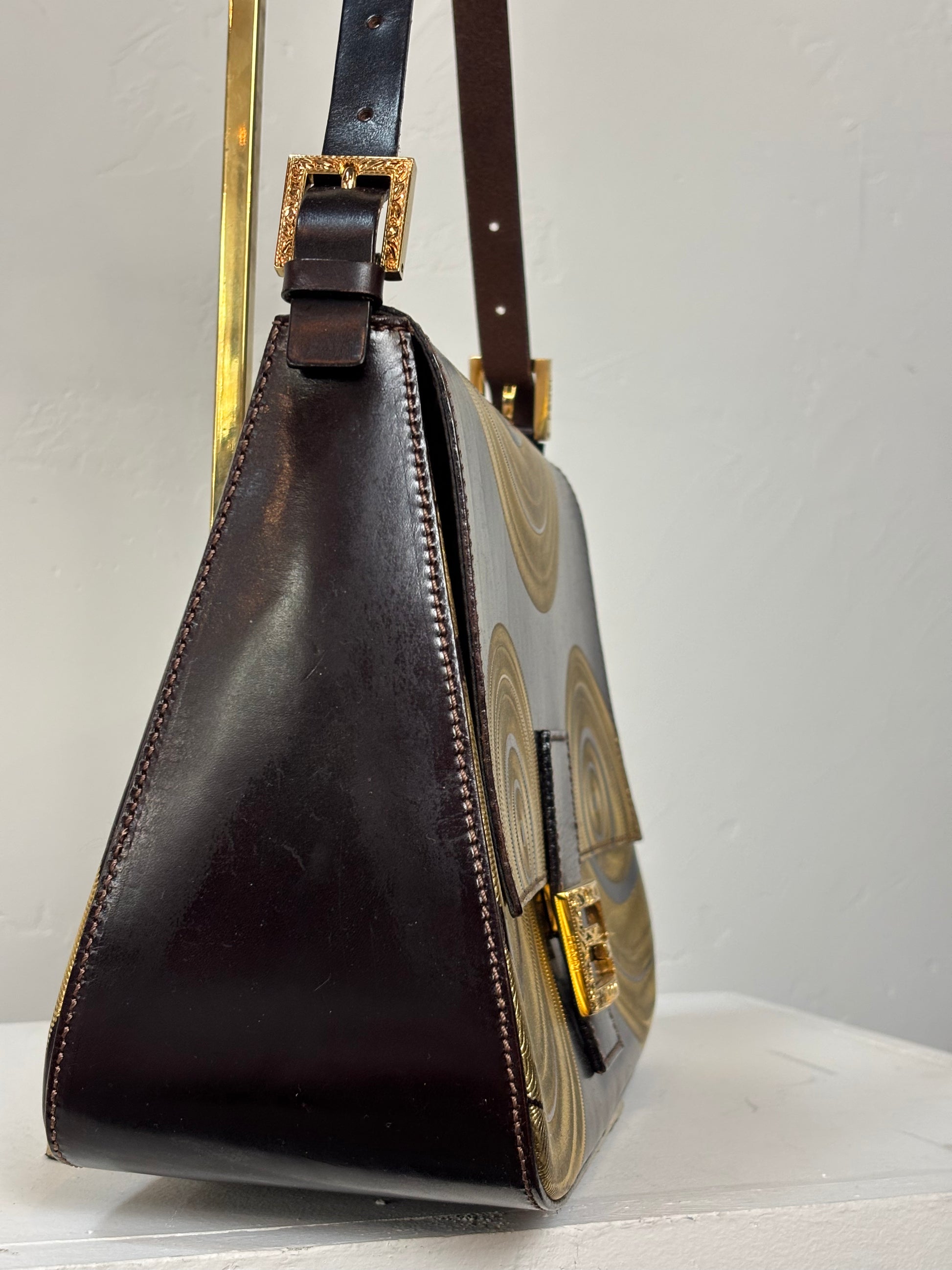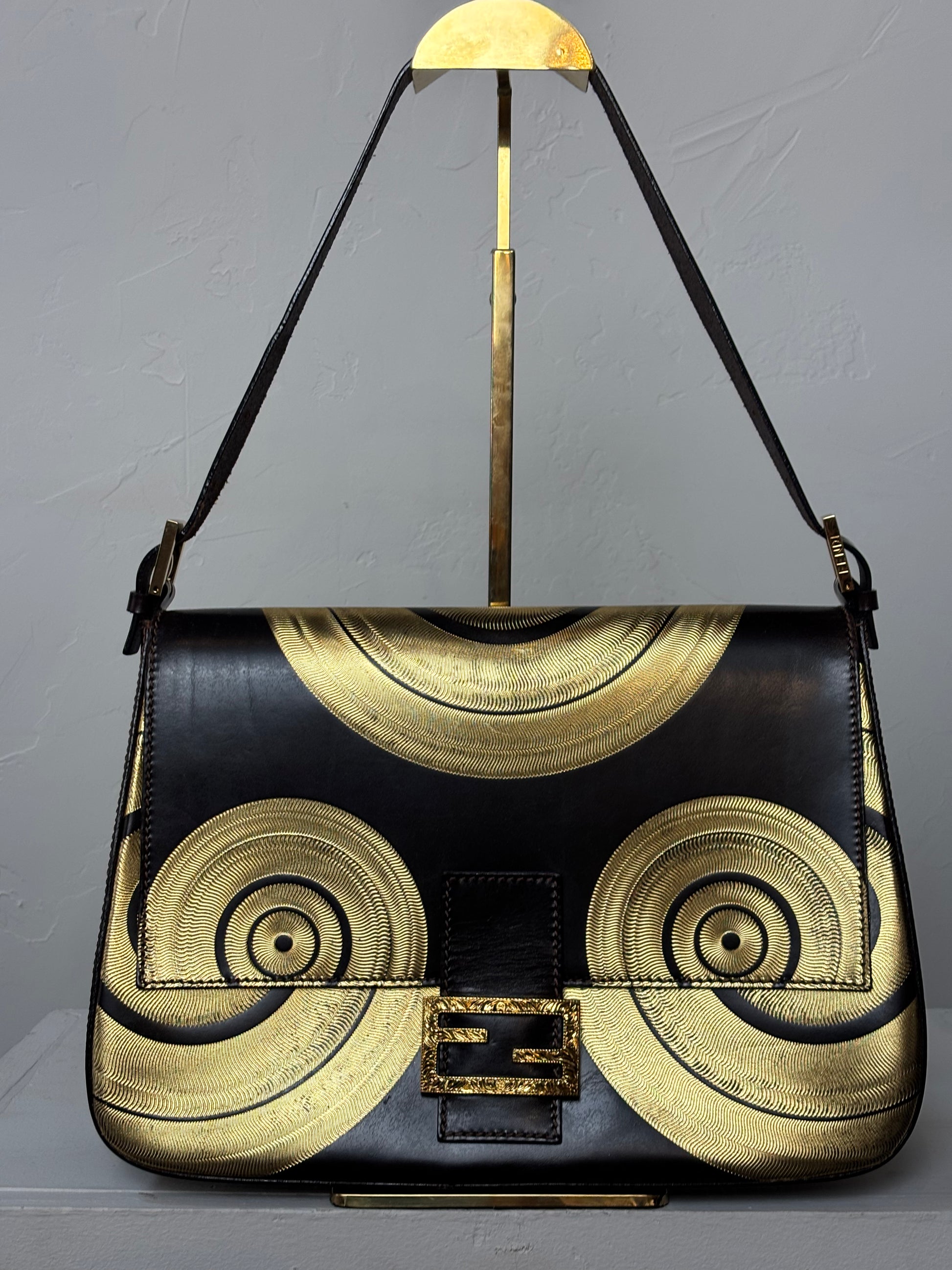 Fendi Brown Leather w/ Gold Metallic Swirls Flap Bag