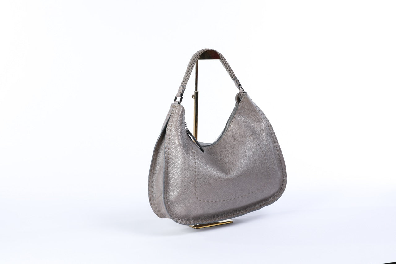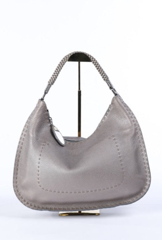 Fendi Metallic Silver Leather Single Strap Shoulder Bag w Woven Handle & Bag Charm