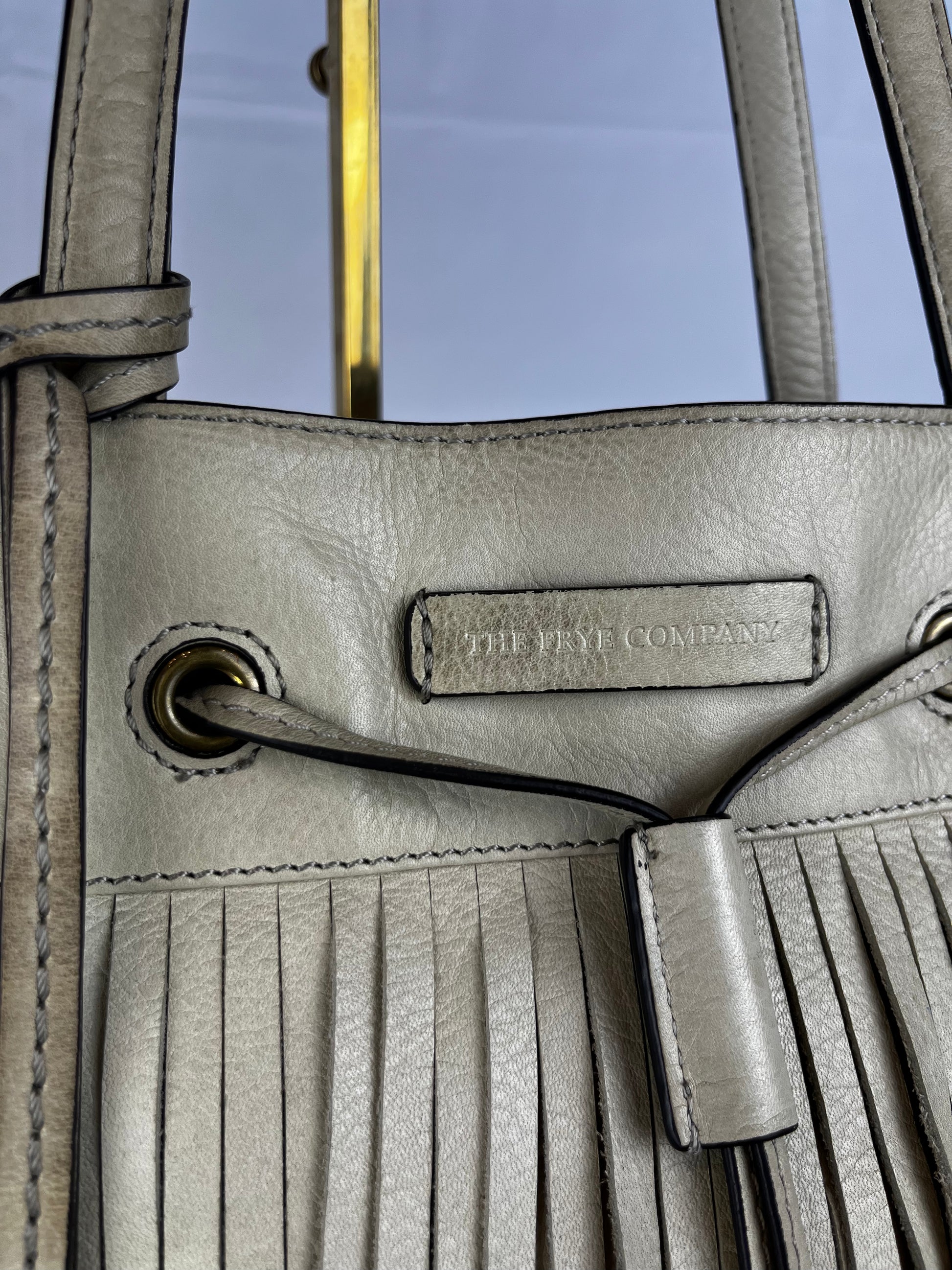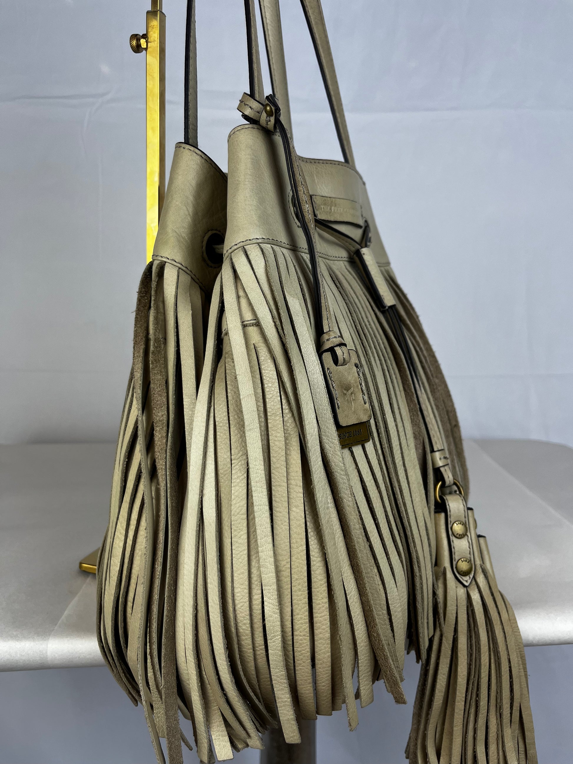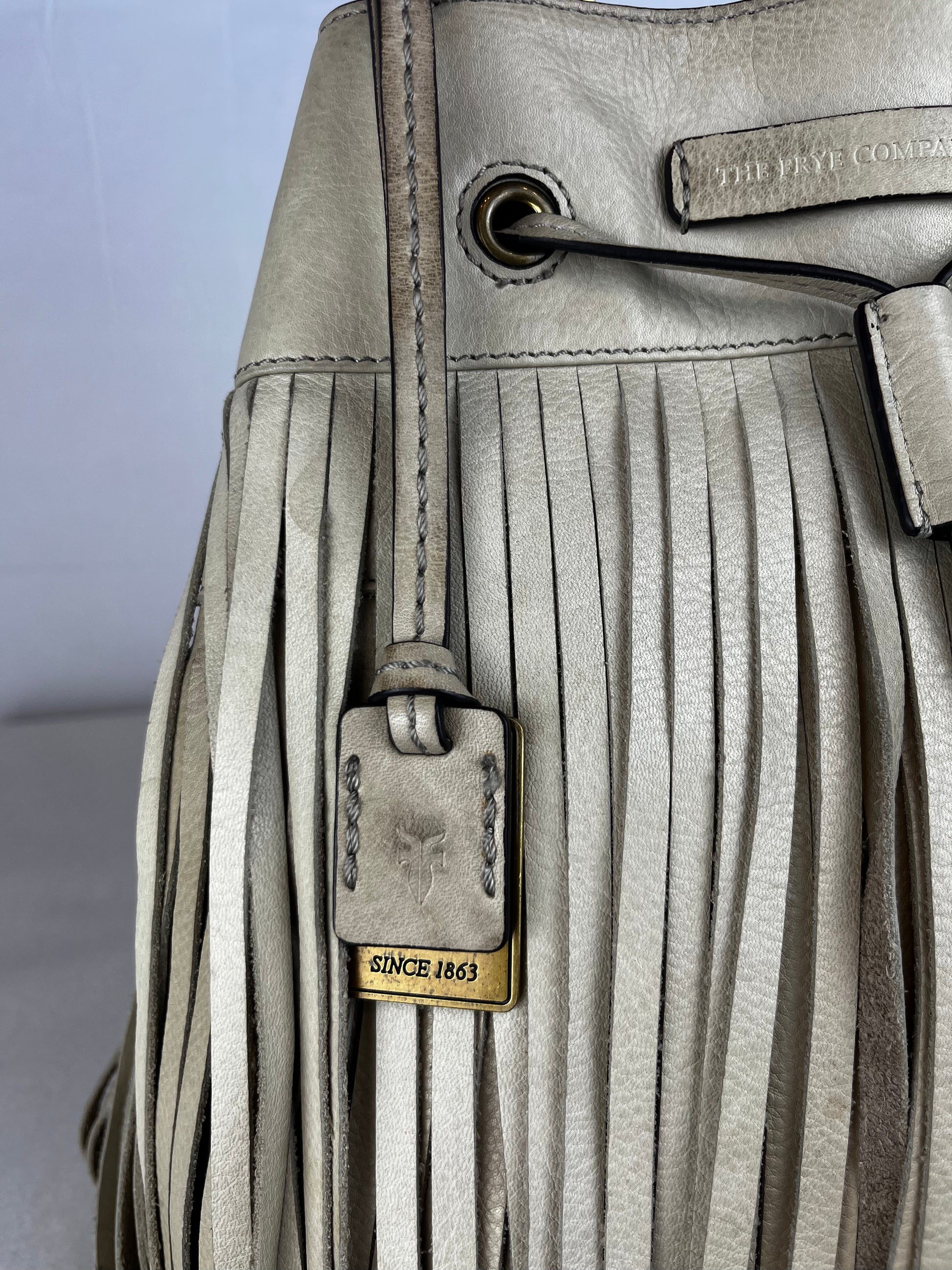Frye Dusty Beige Leather Heidi Bucket Fringe Shoulder Bag w Tassels