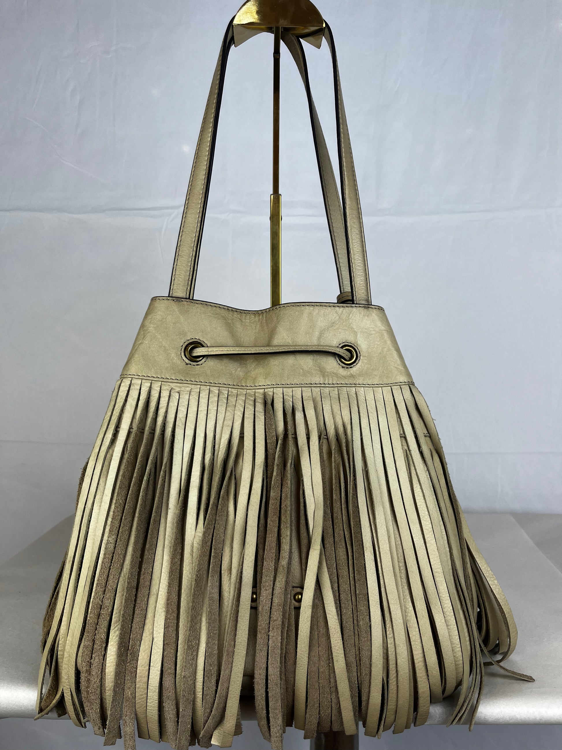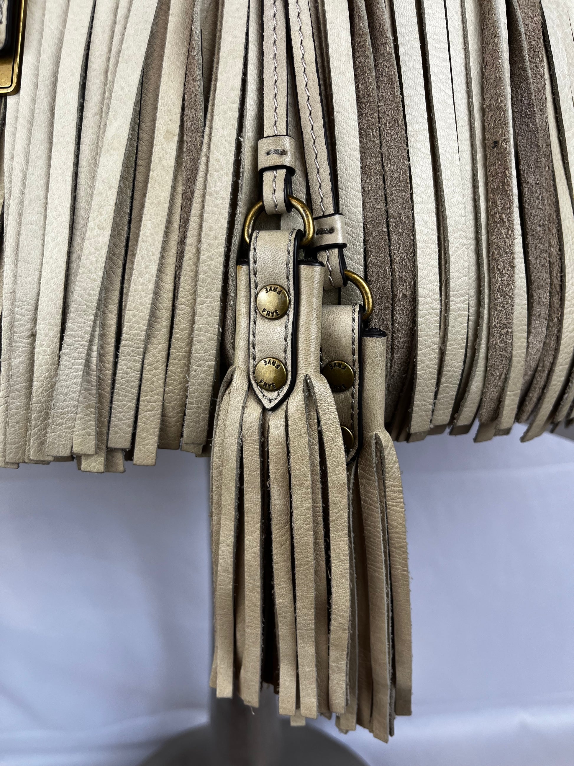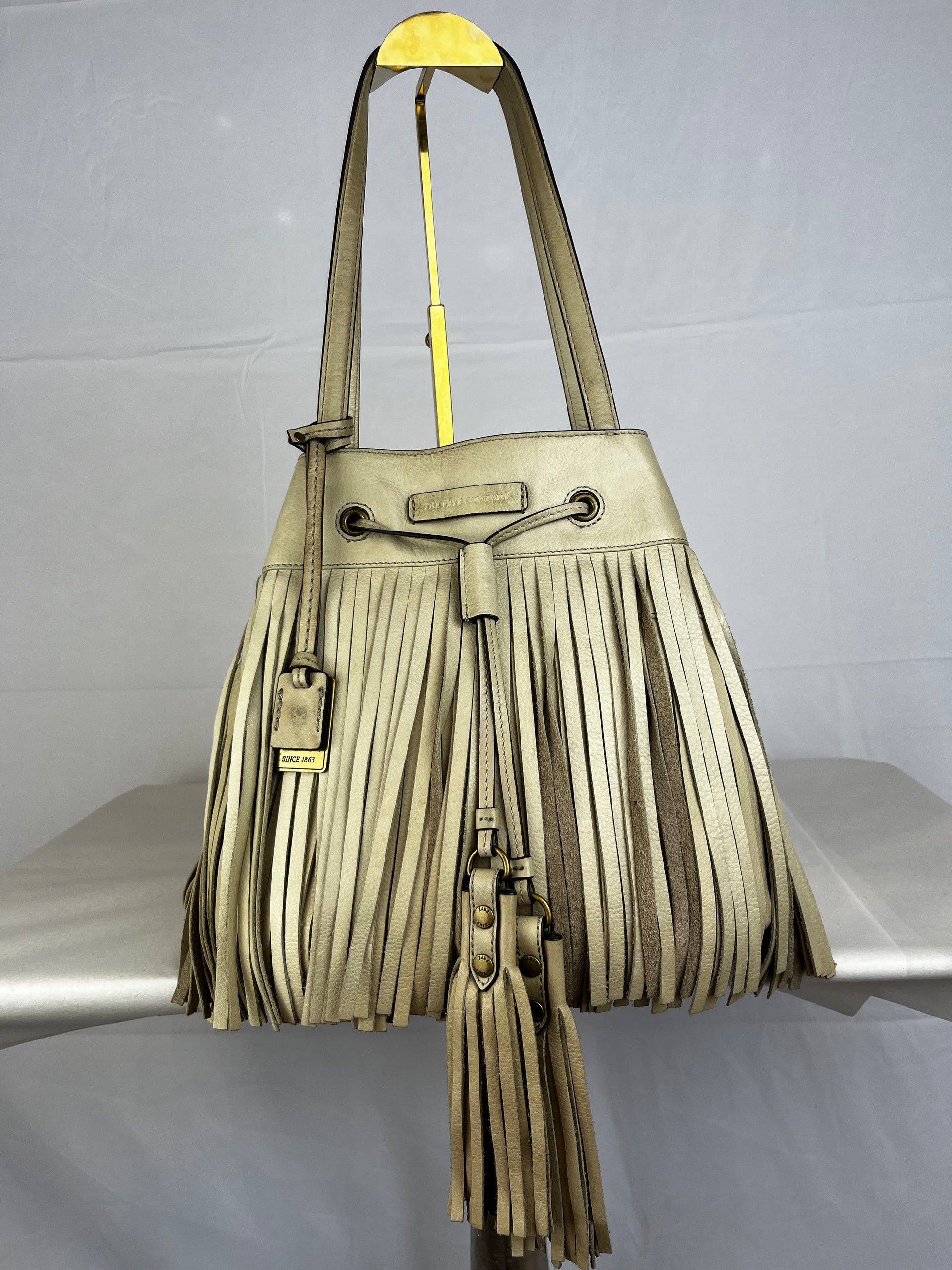 Frye Dusty Beige Leather Heidi Bucket Fringe Shoulder Bag w Tassels