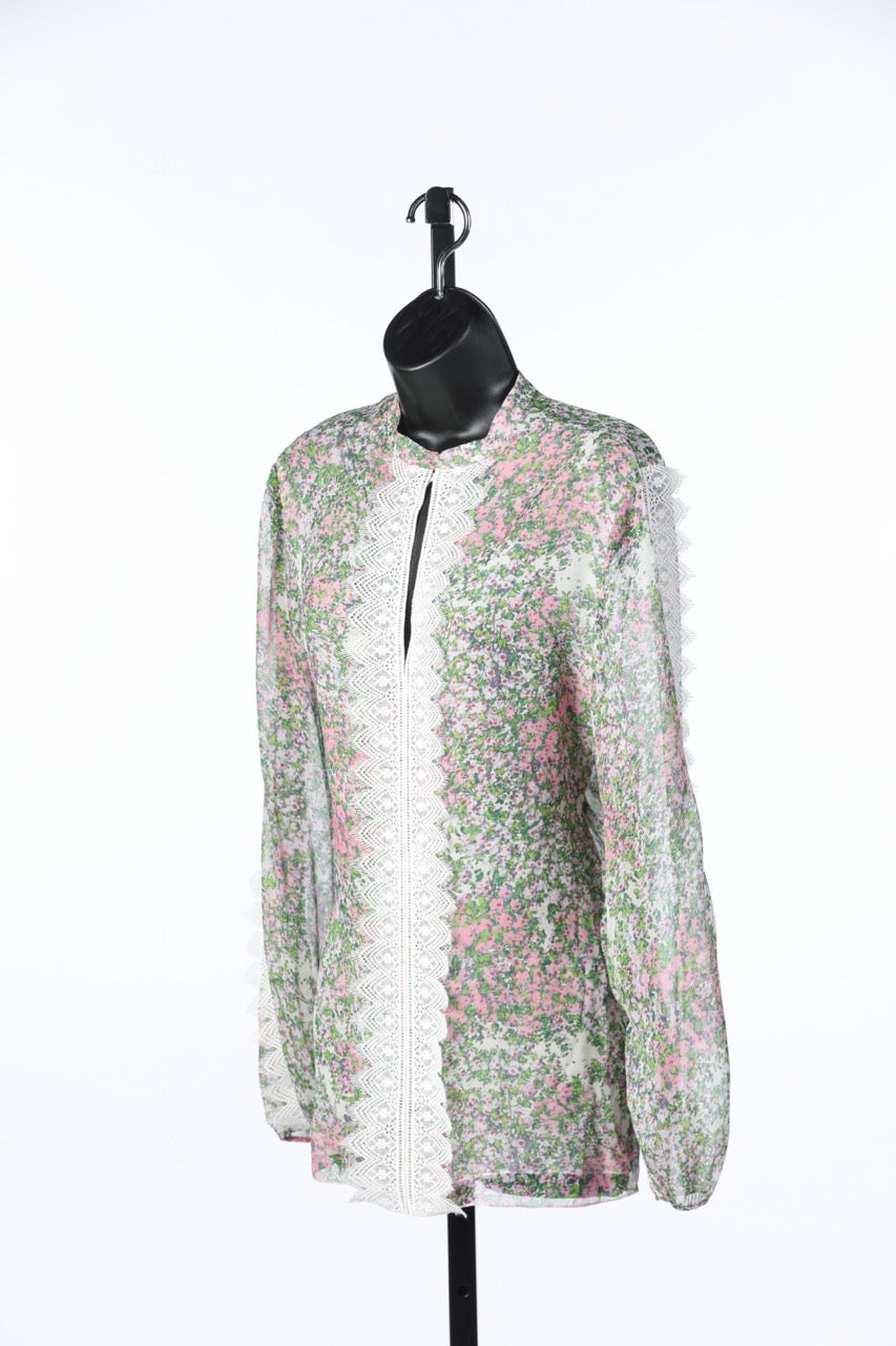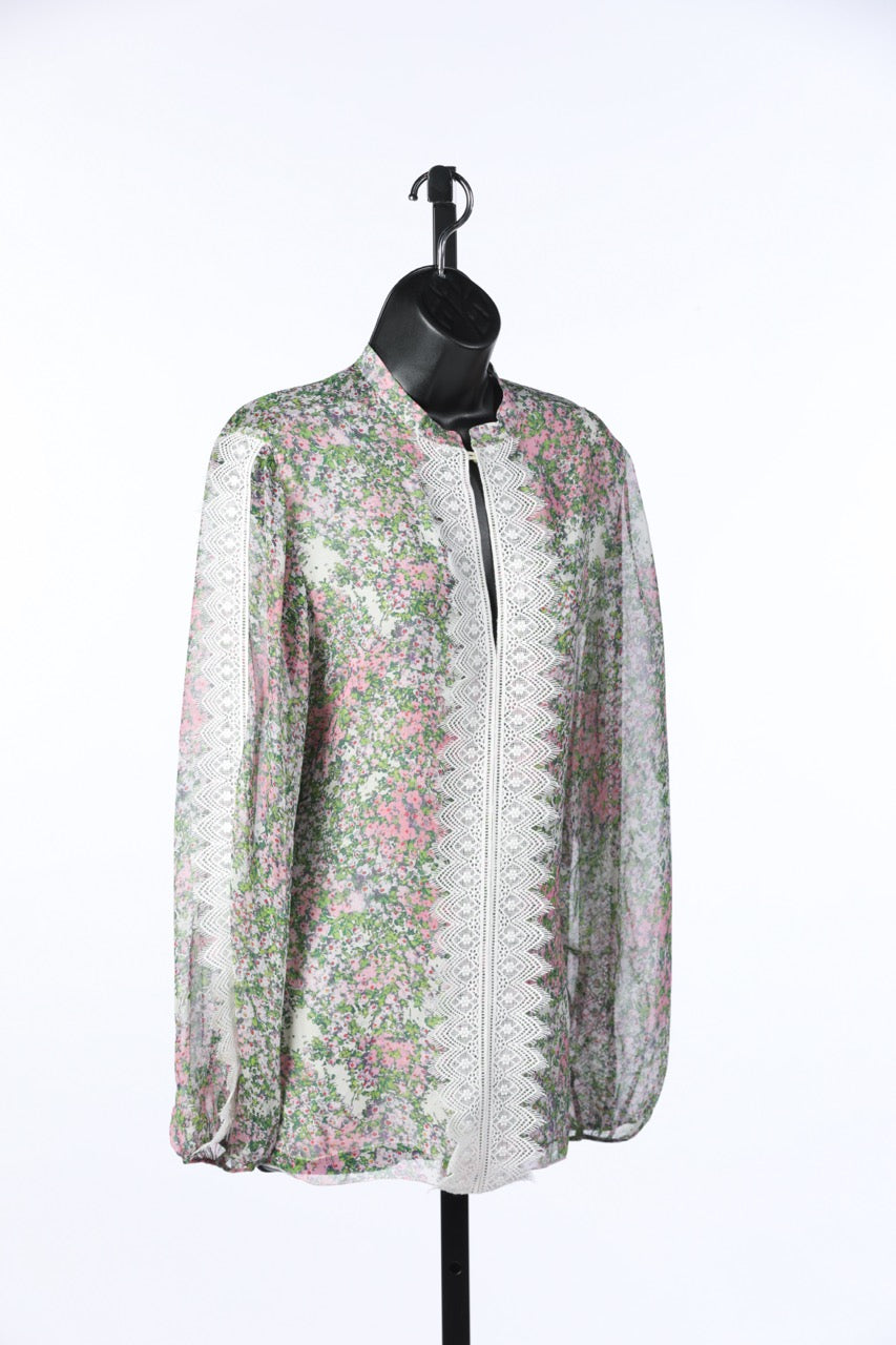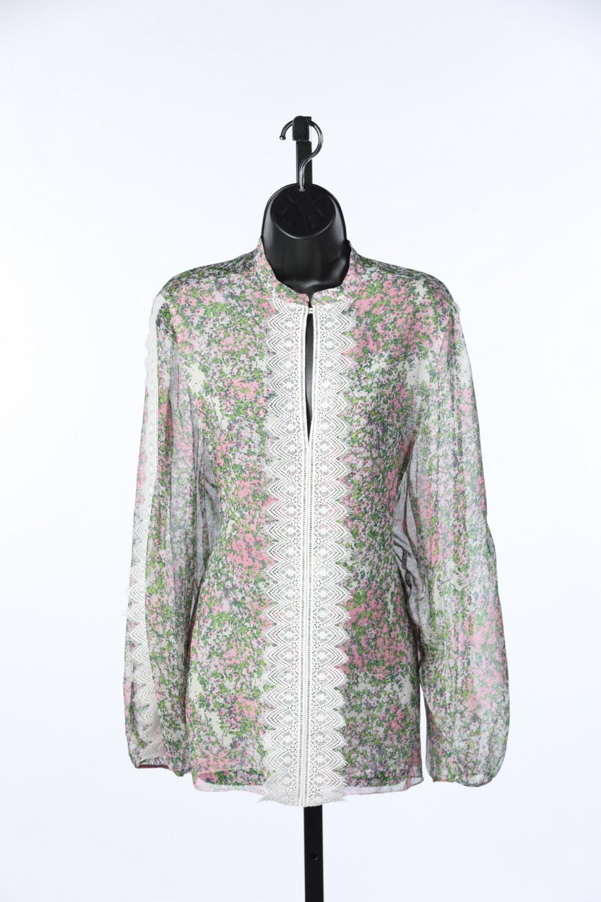 Giambattista Valli Green & Pink Floral Silk Blouse w Lace Detailing