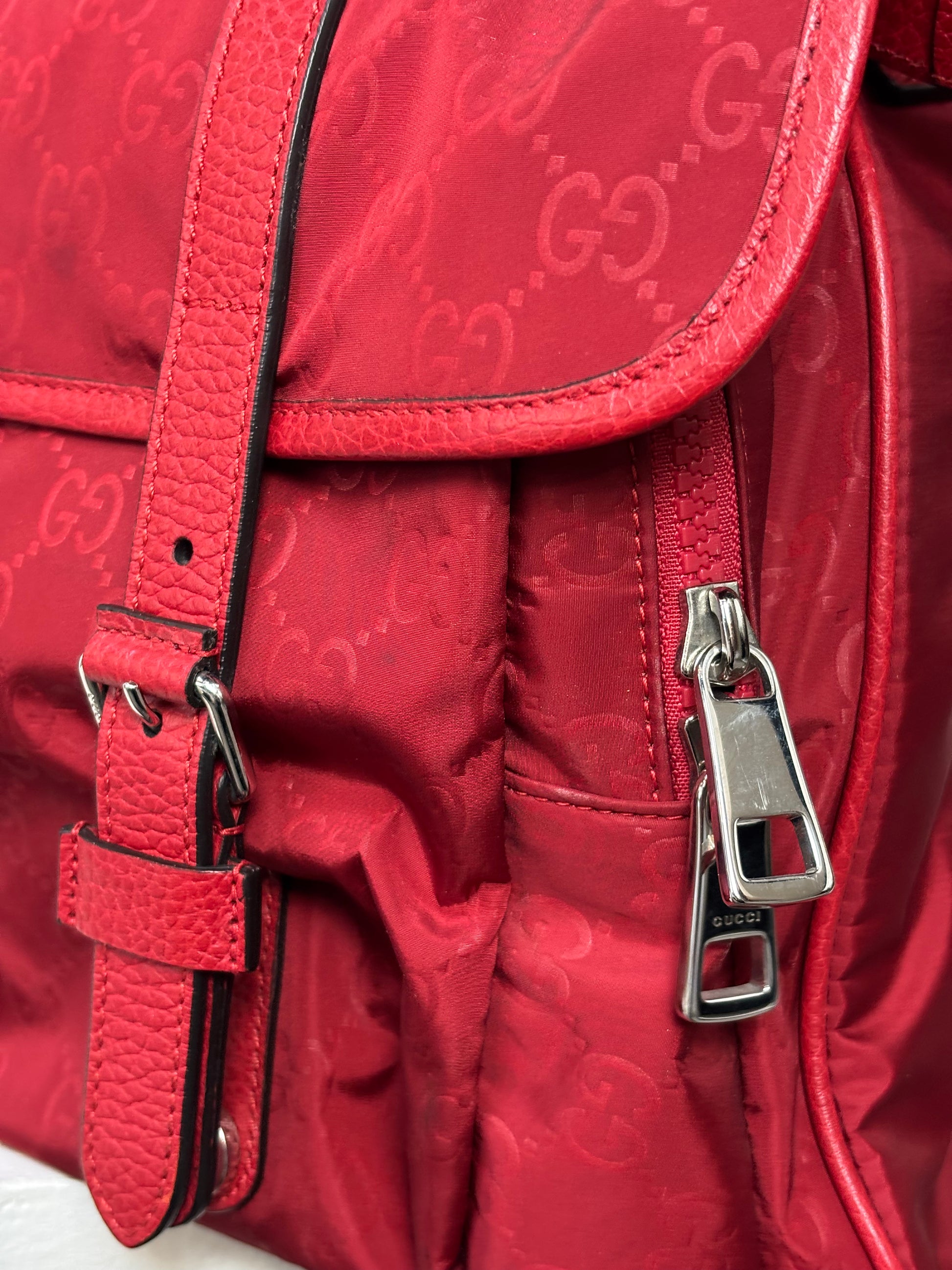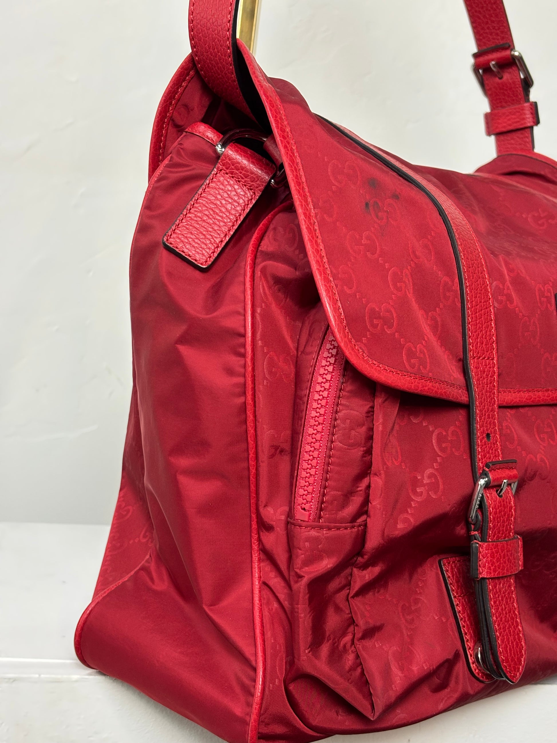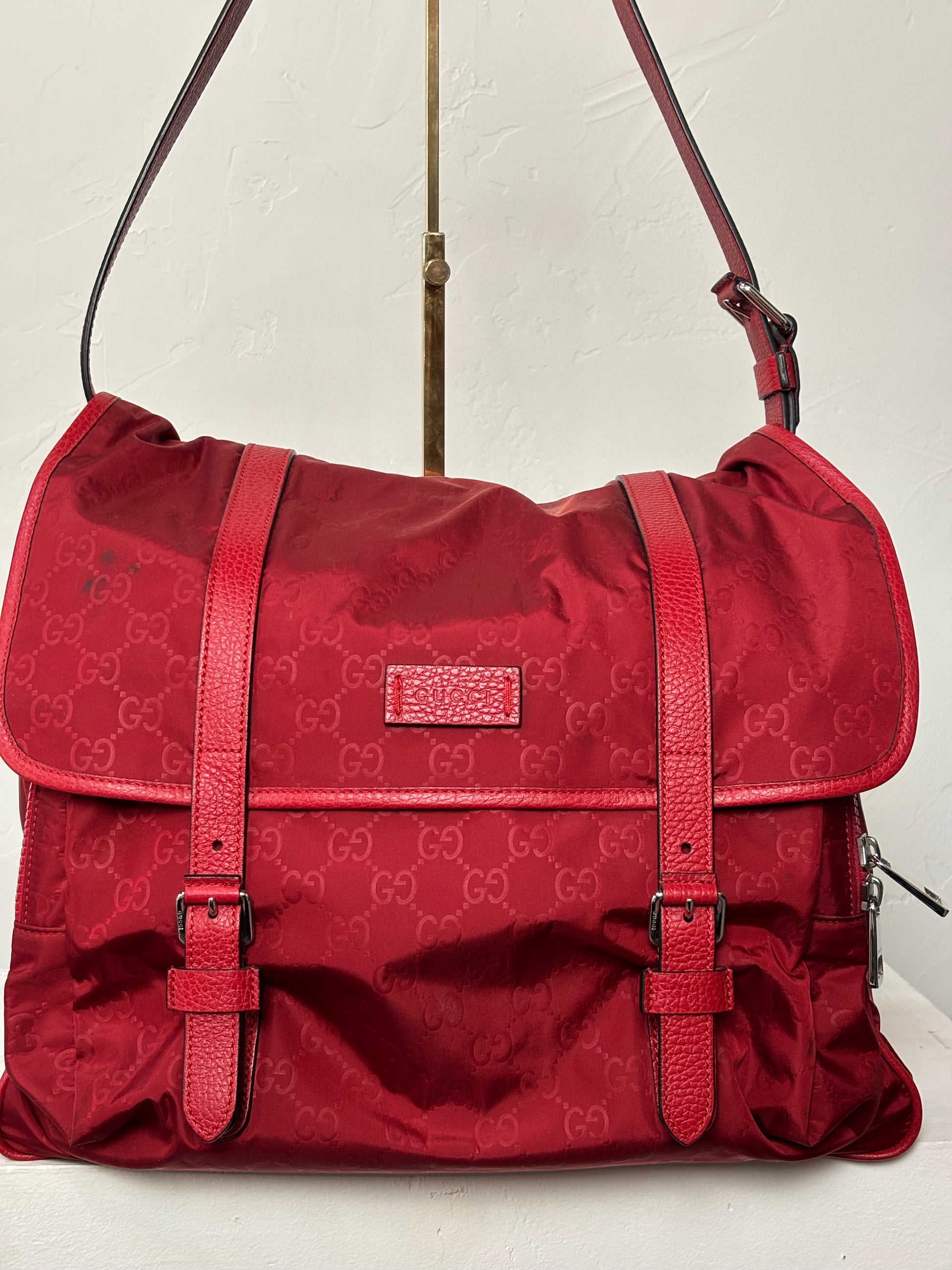 Gucci Red Nylon Monogram Double Buckle Flap Messenger Bag