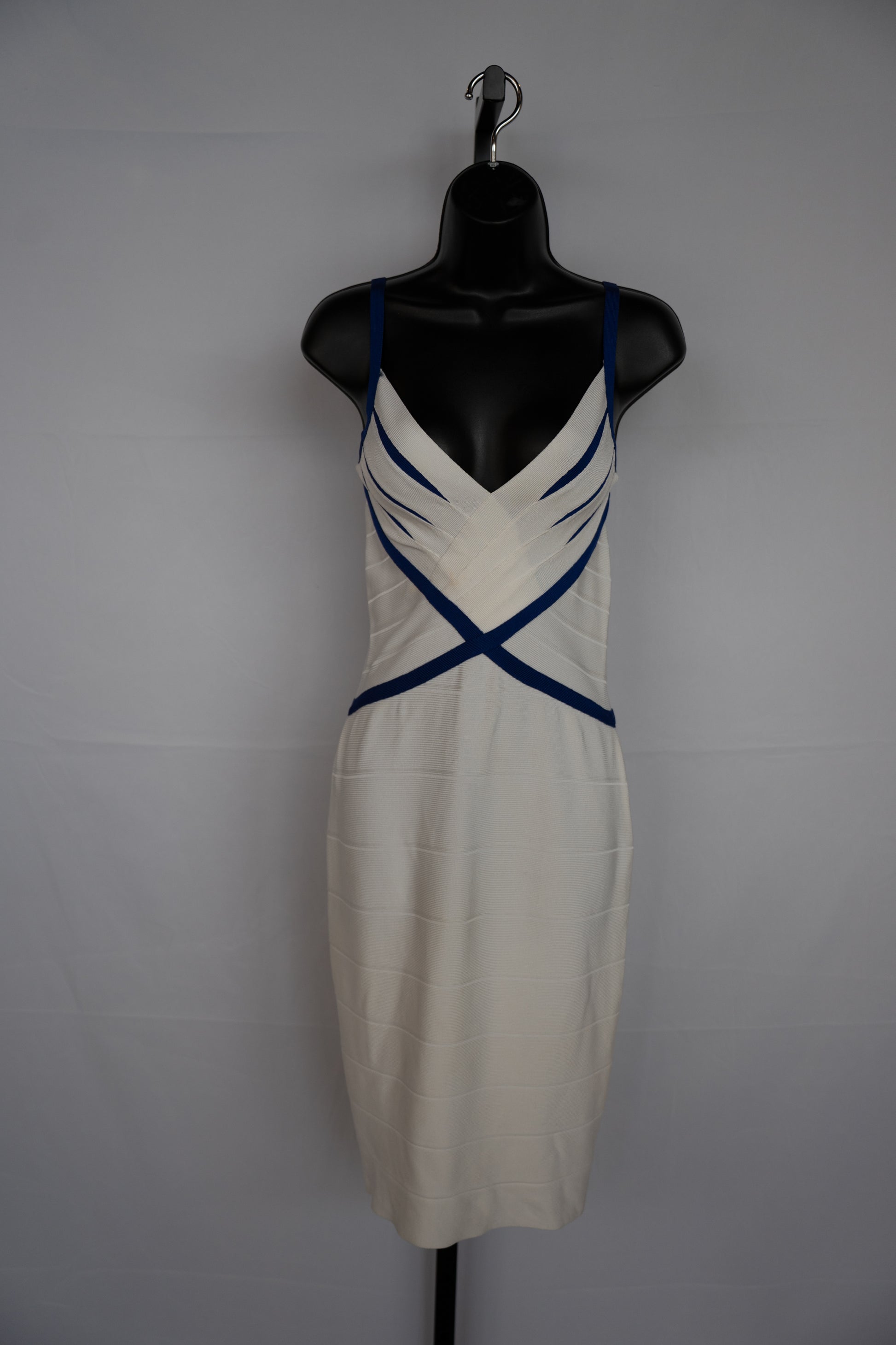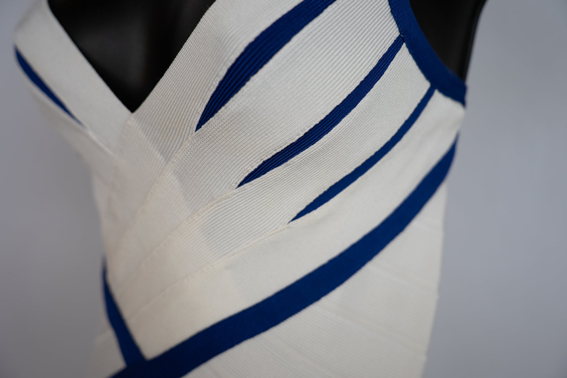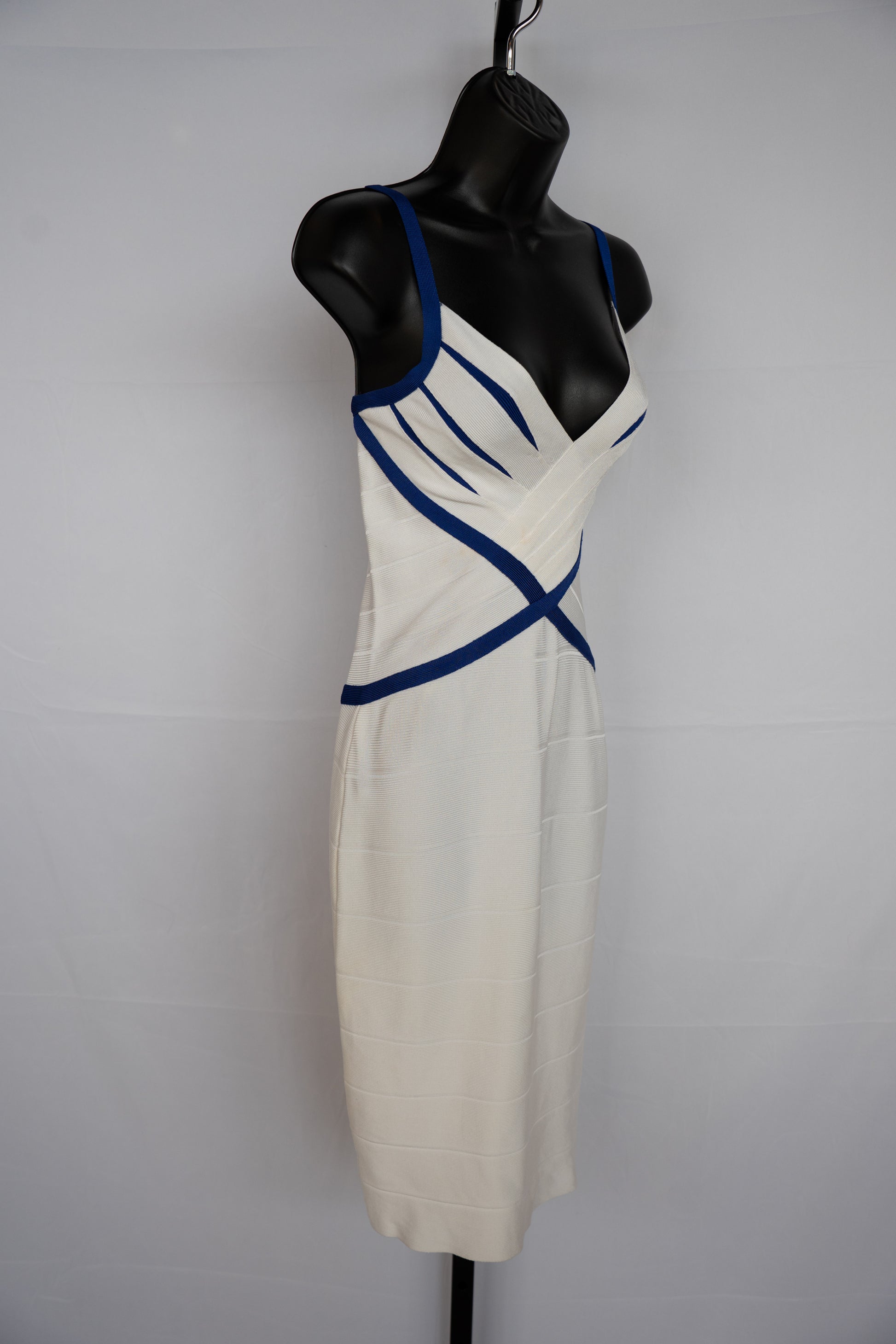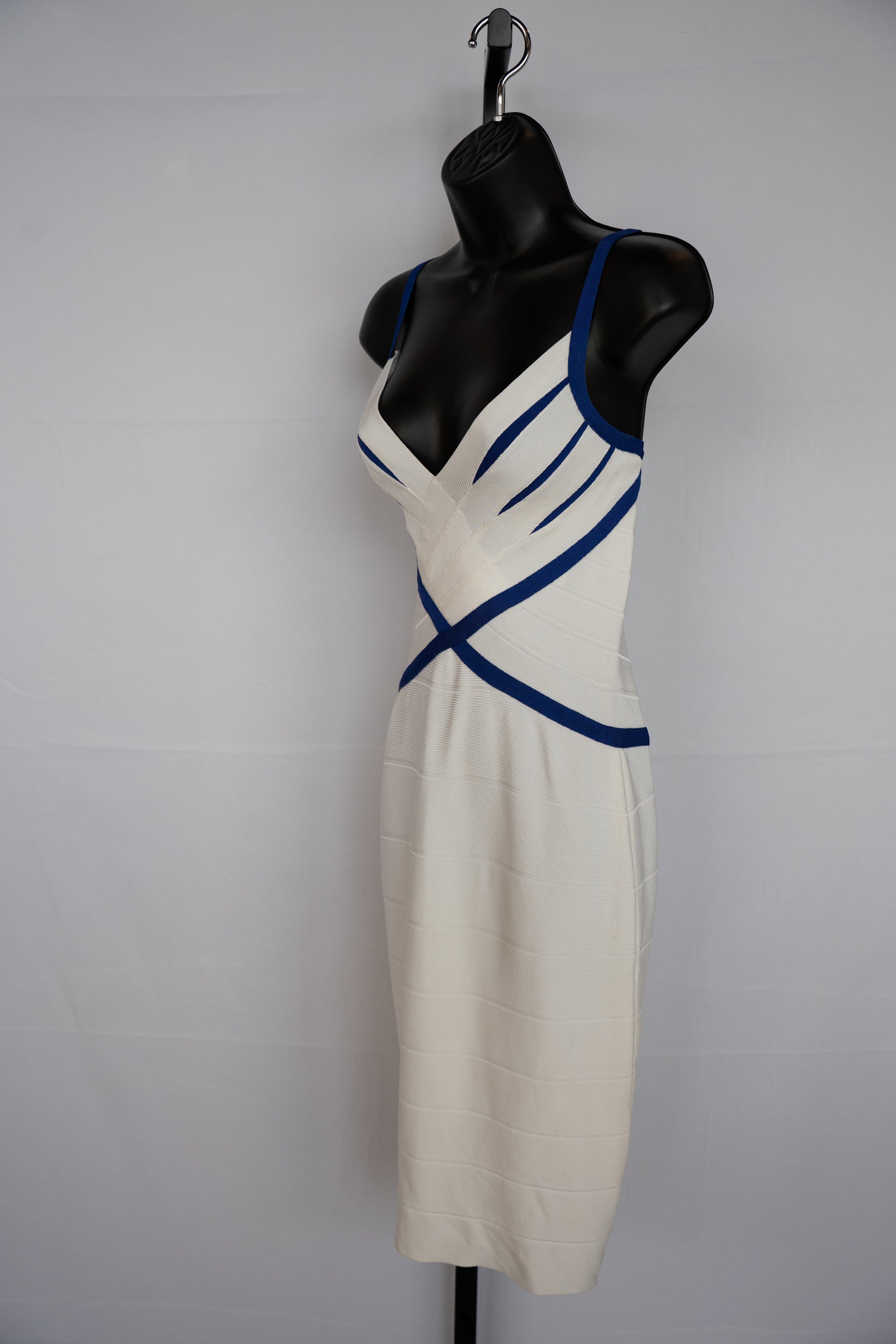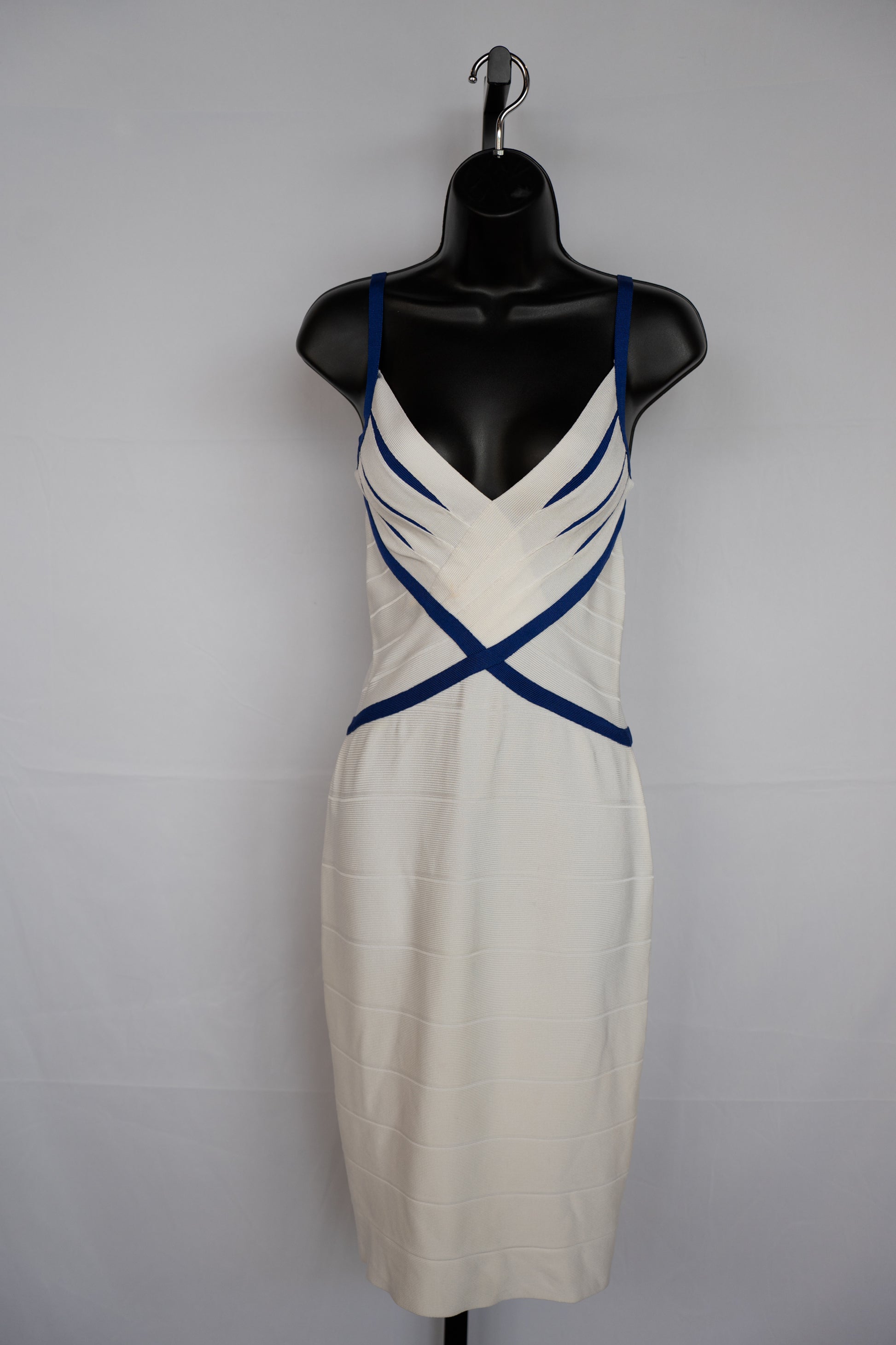 Herve Leger White w Blue Trim Sleeveless Bandage Knee-Length Dress