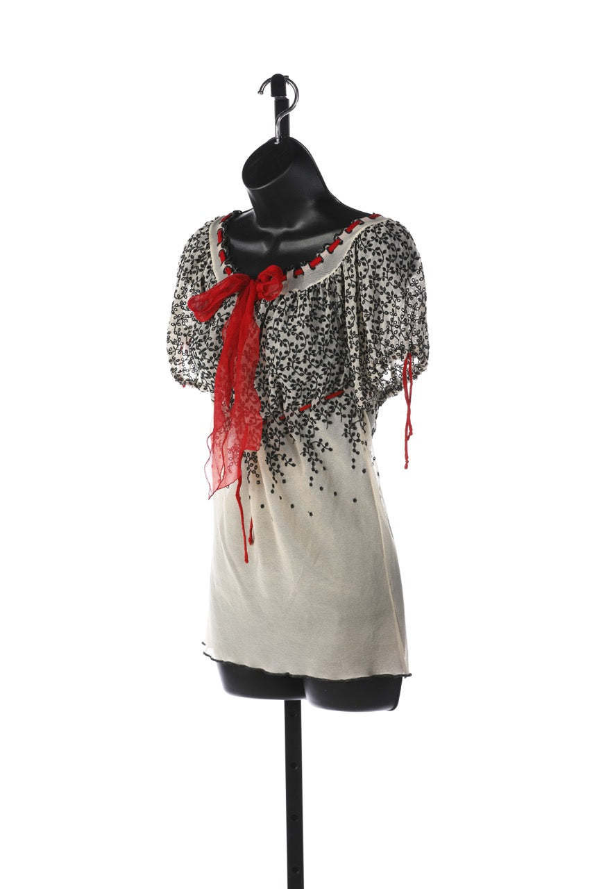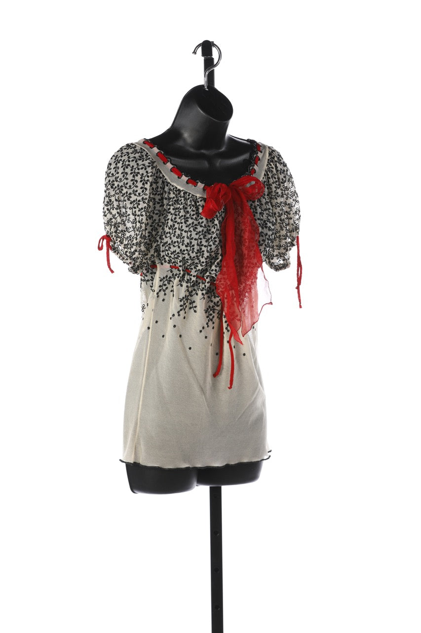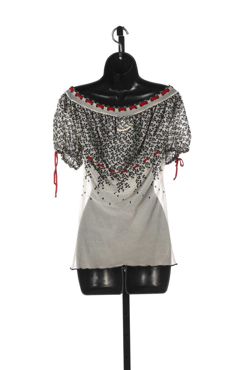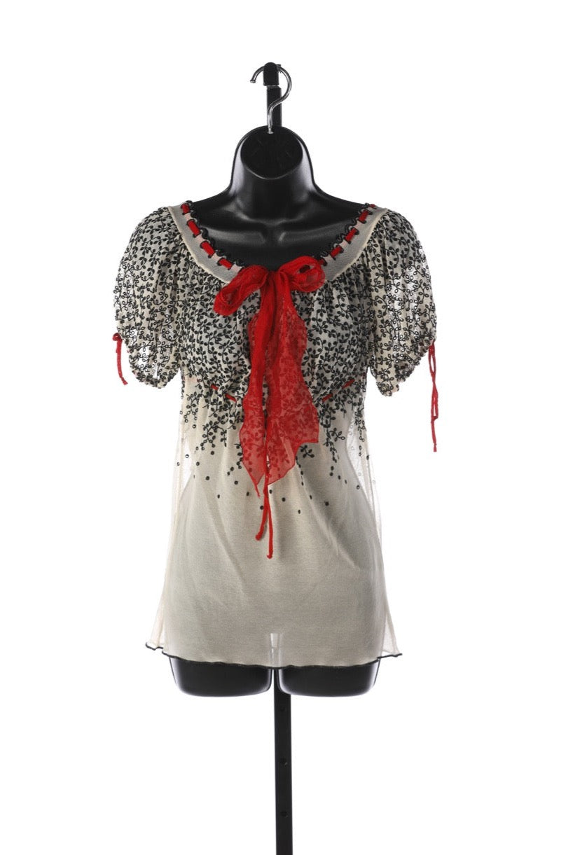 Jean Paul Gaultier White Short-Sleeve Mesh Blouse w/ Red Ribbon & Black Embroidery