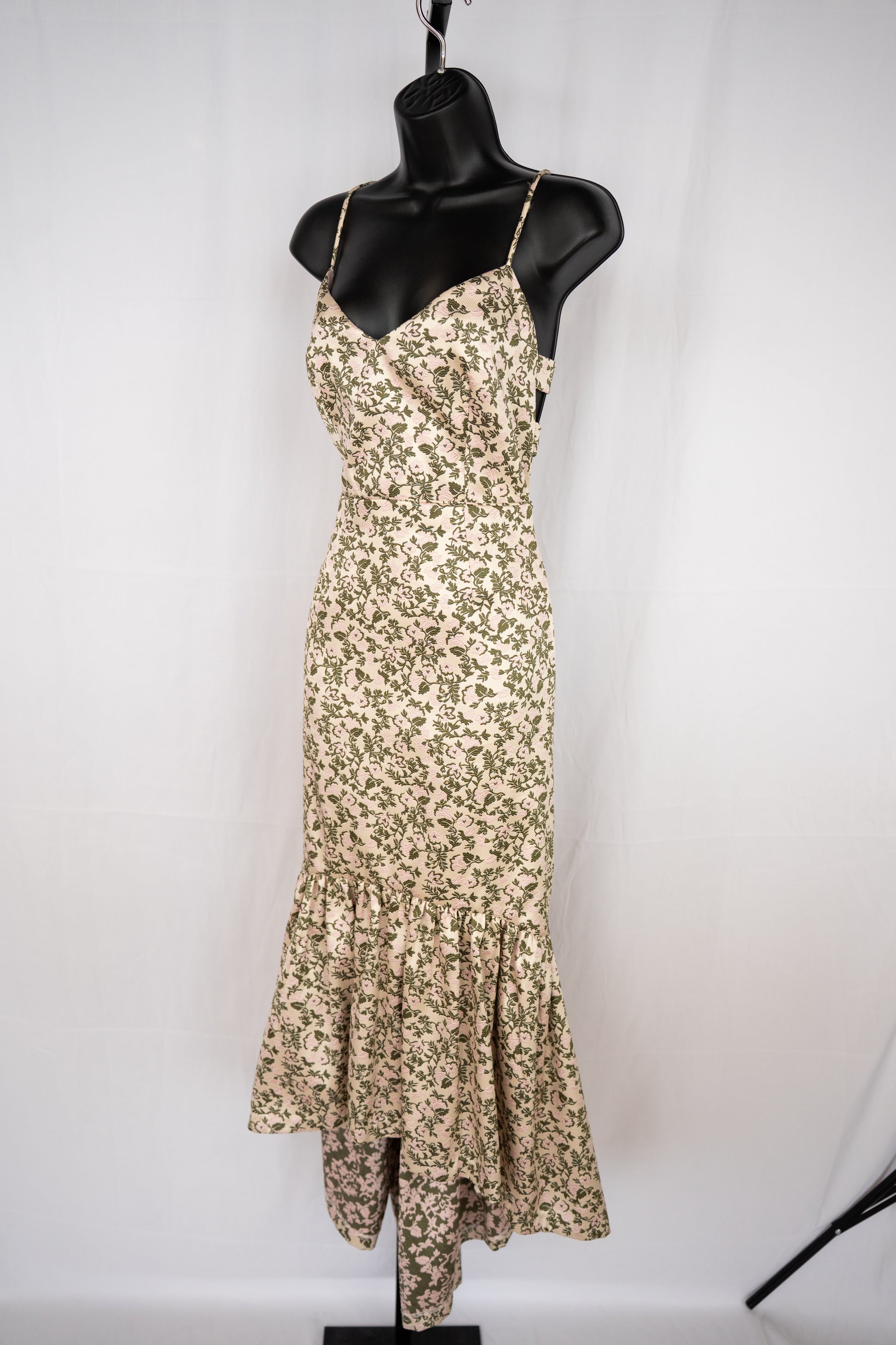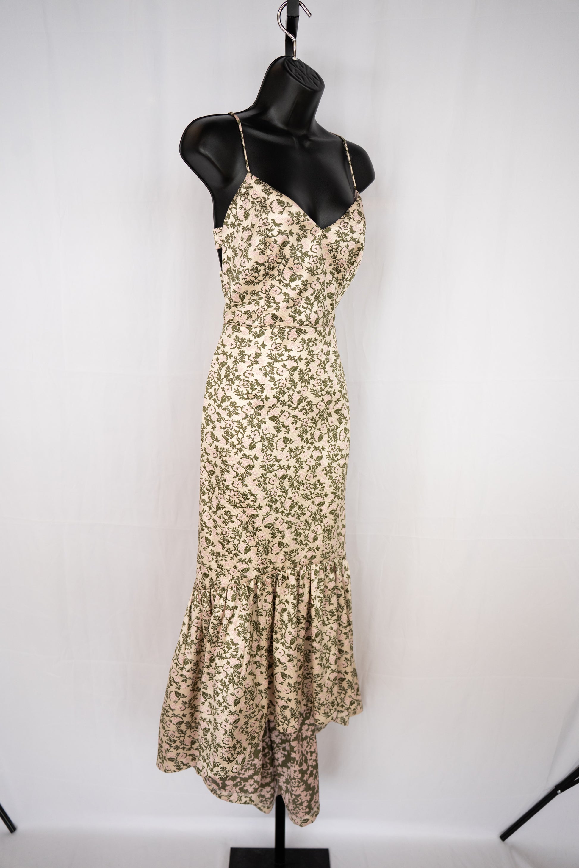 Jill Stuart Cream Green Leaf/Pink Flower Floral Sleeveless V-Neck Ruffle Hem Midi Dress