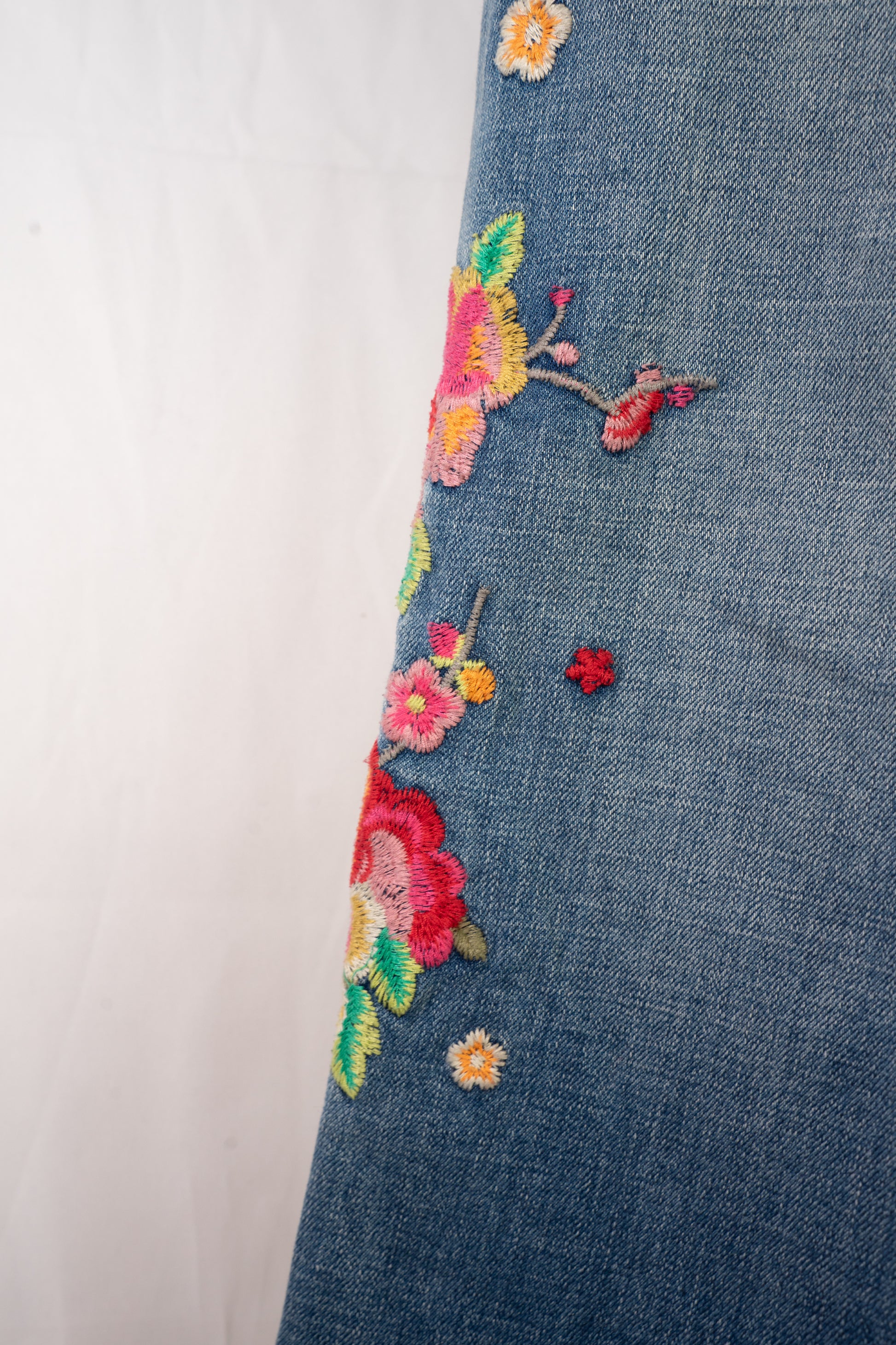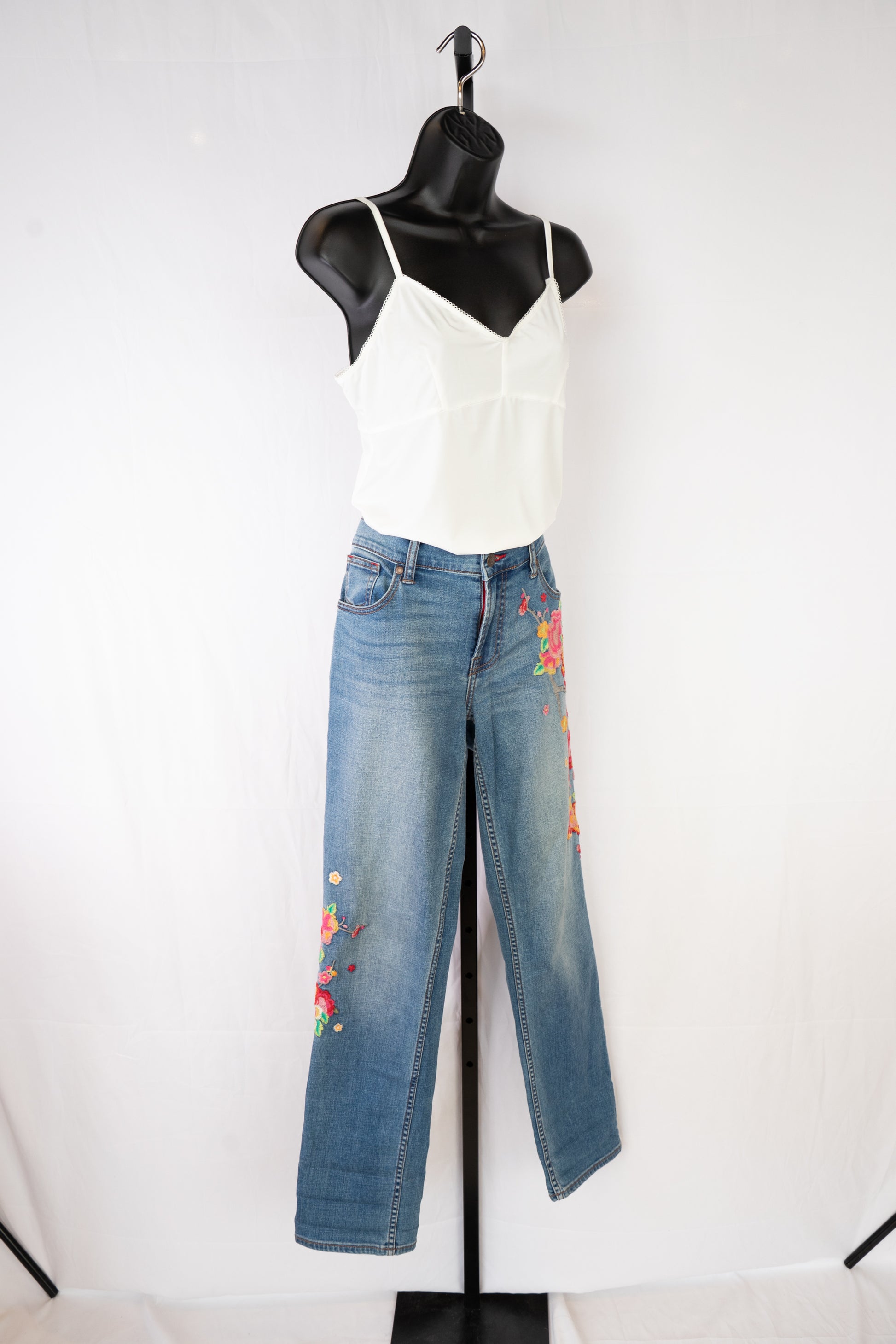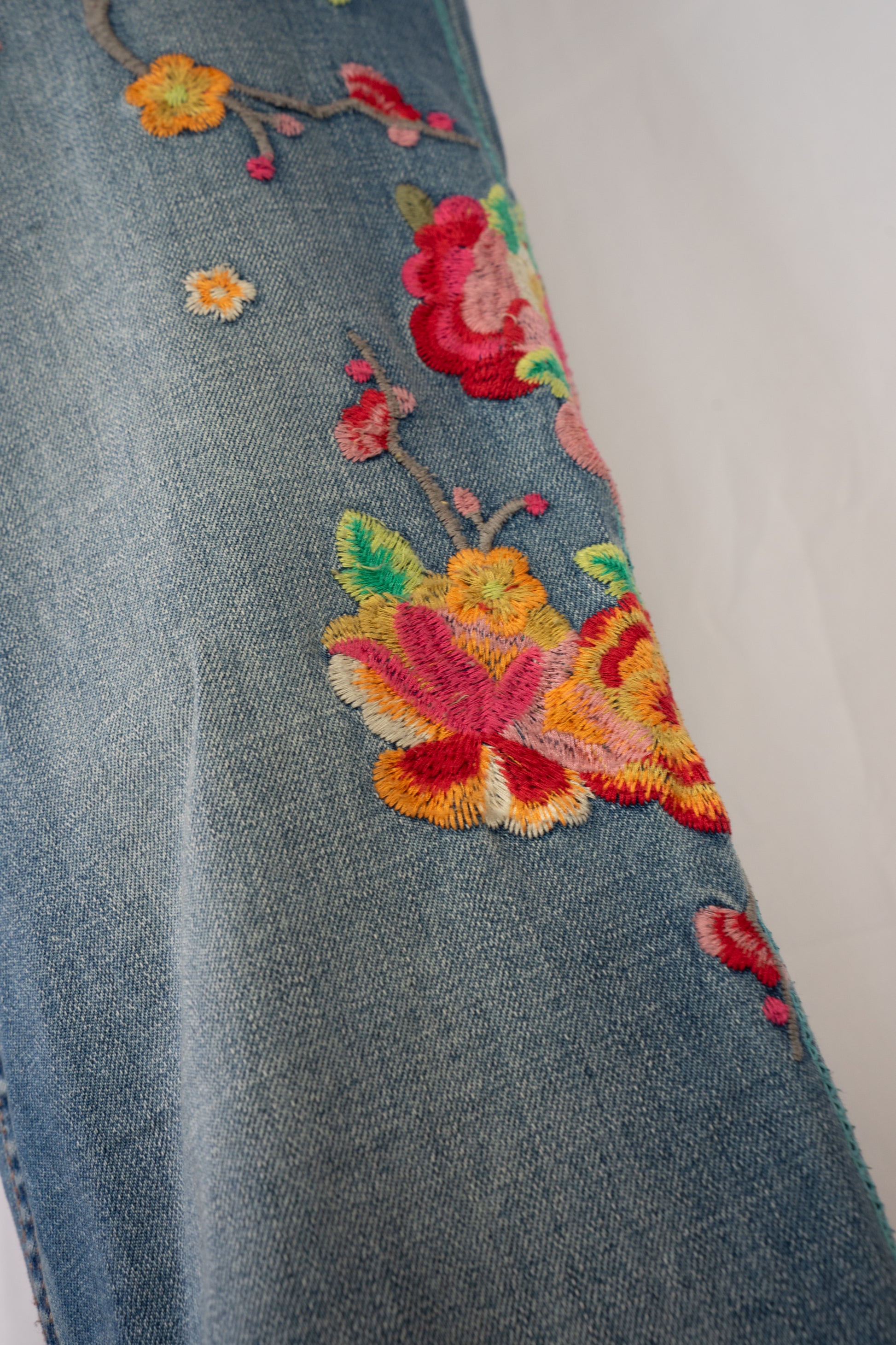 Johnny Was Medium Wash Floral Embroidered Mid-Rise Distressed Raw Boot Cut Jeans