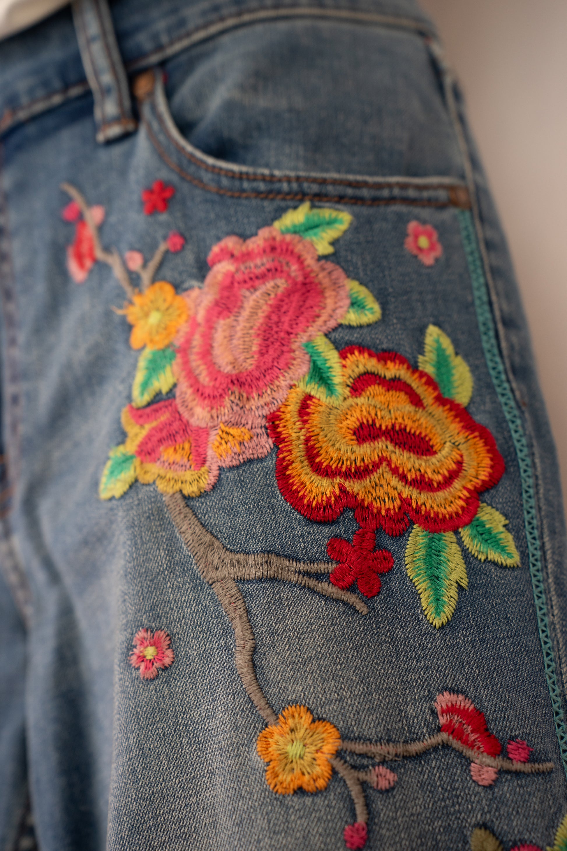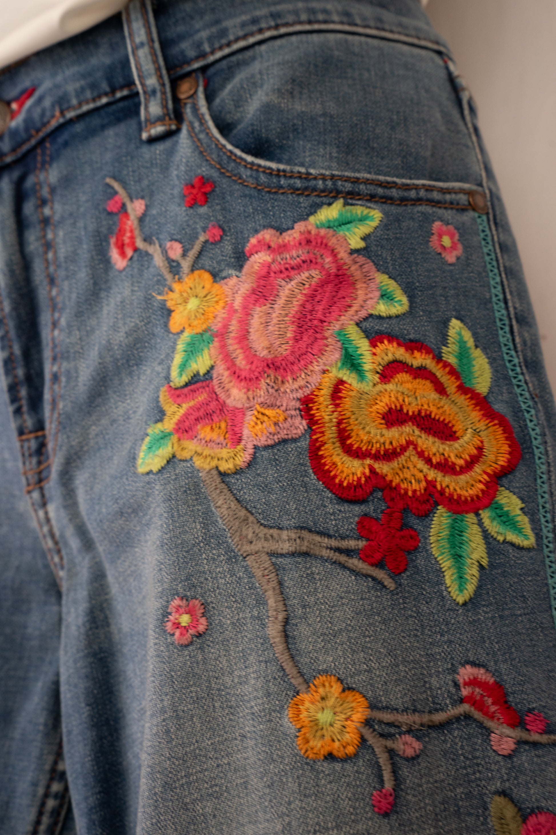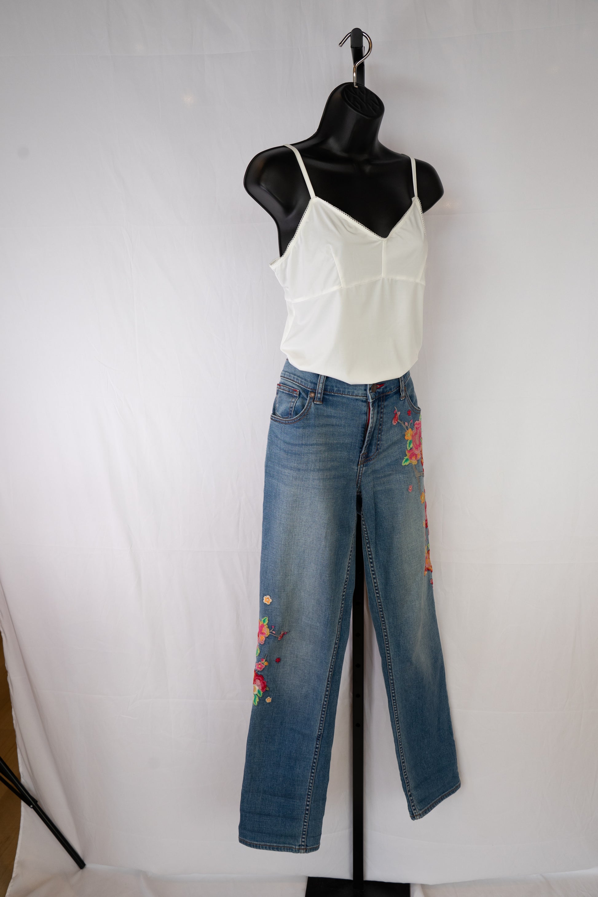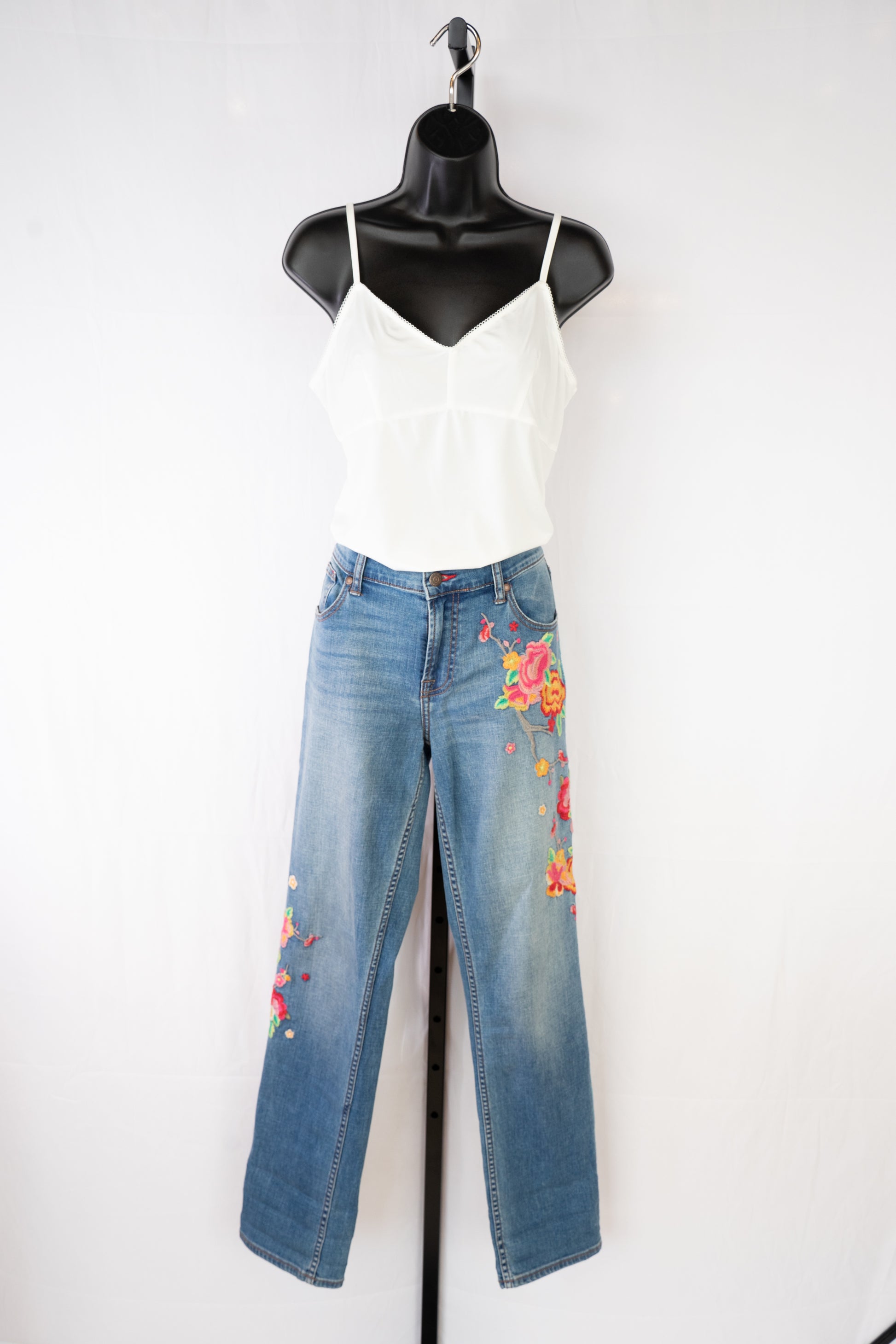 Johnny Was Medium Wash Floral Embroidered Mid-Rise Distressed Raw Boot Cut Jeans