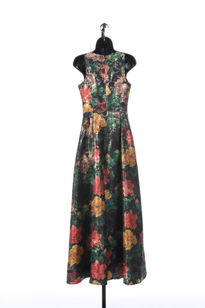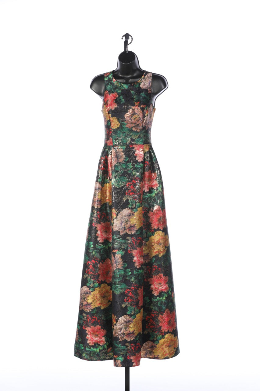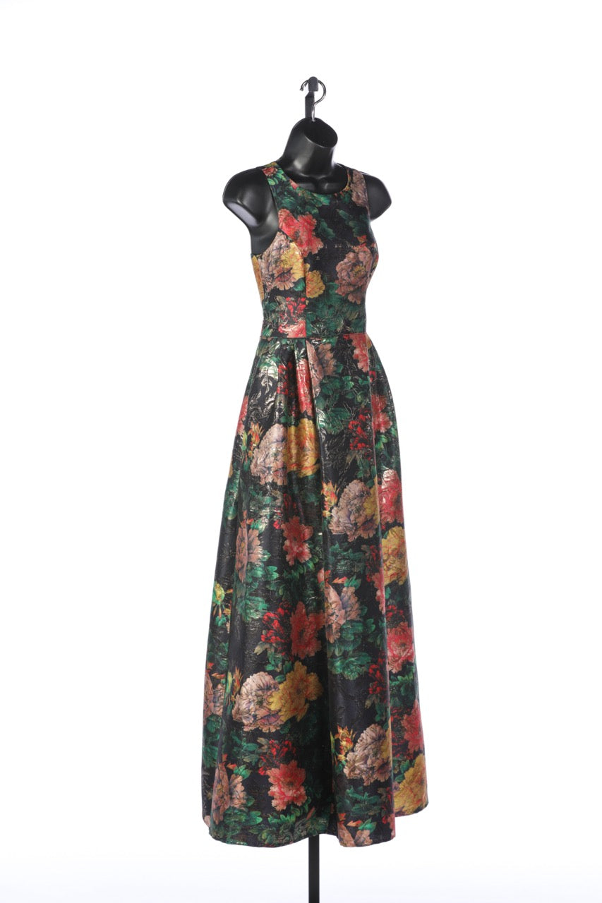 Johnny Was Multicolor Floral with Gold Sparkle Detail Sleeveless Crew Neck Gown