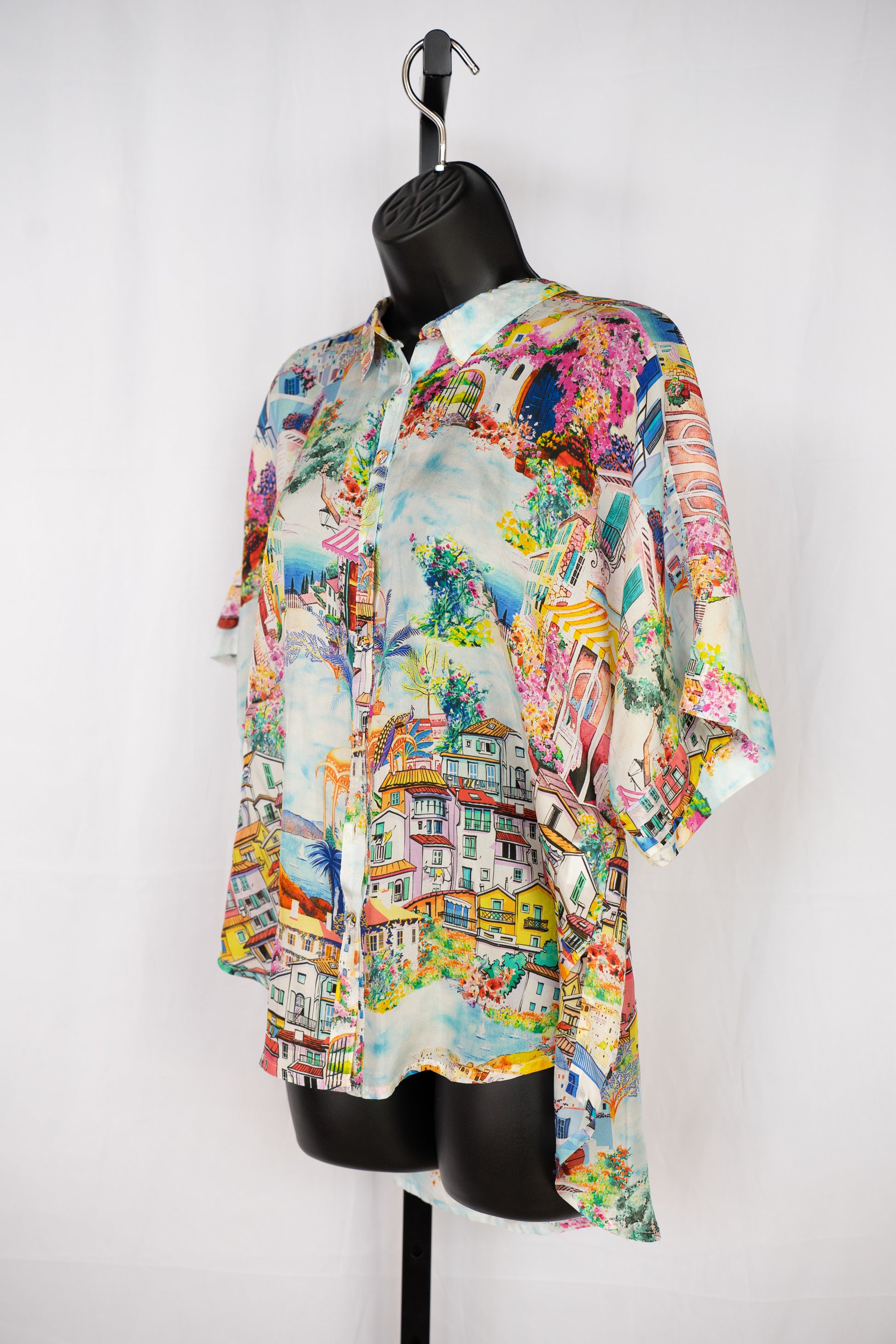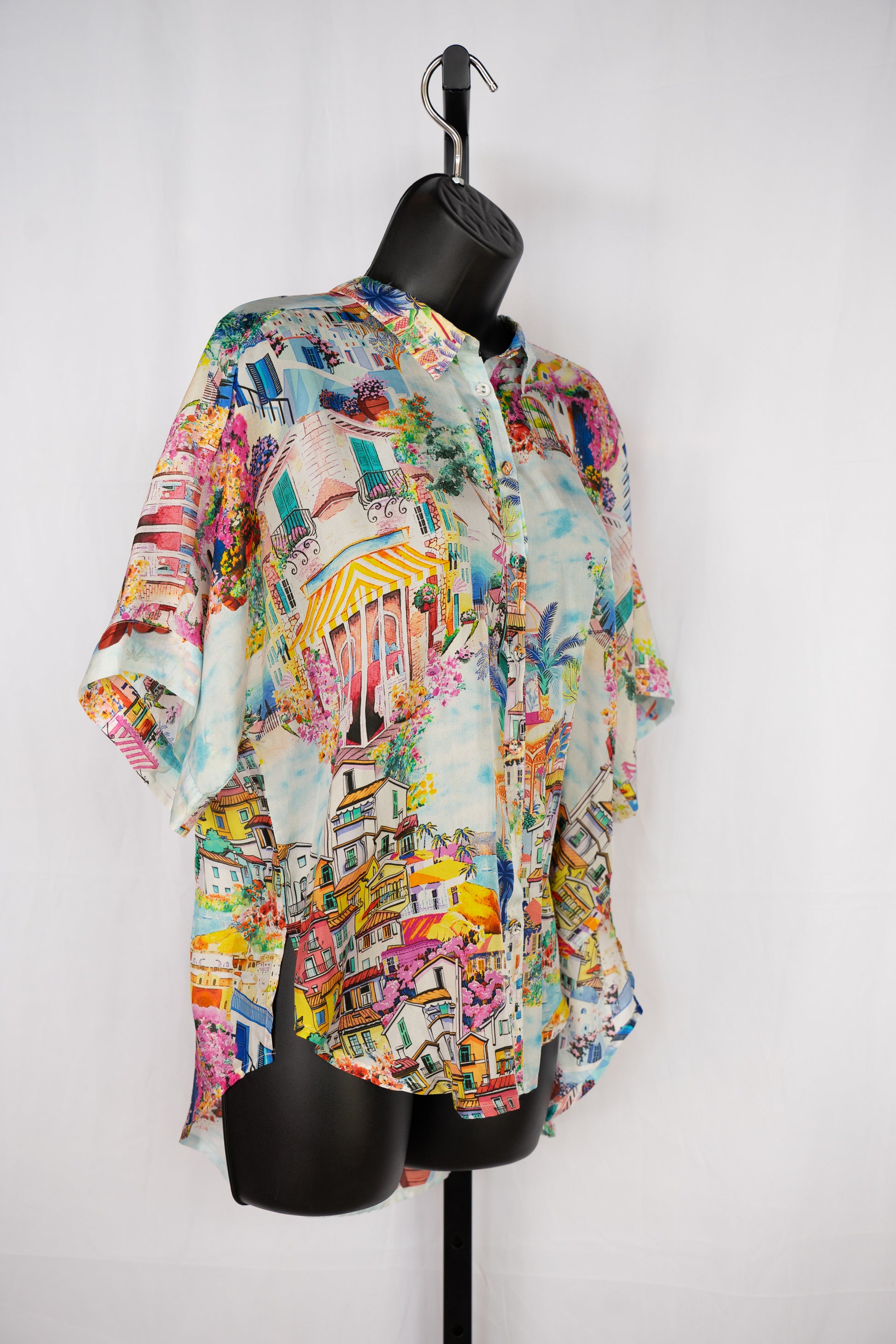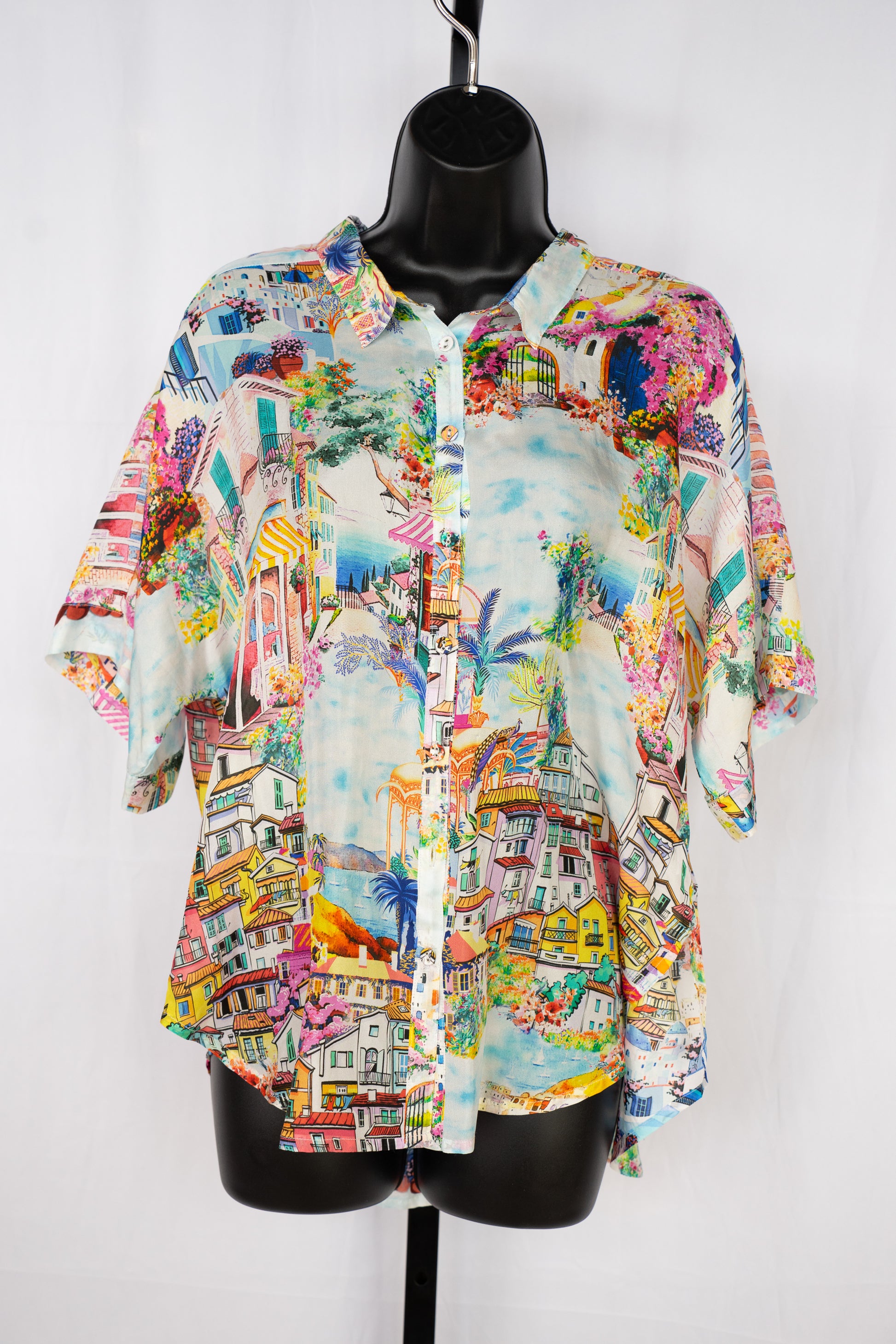 Johnny Was Silk Landscape Print Button Down Short Sleeve Blouse