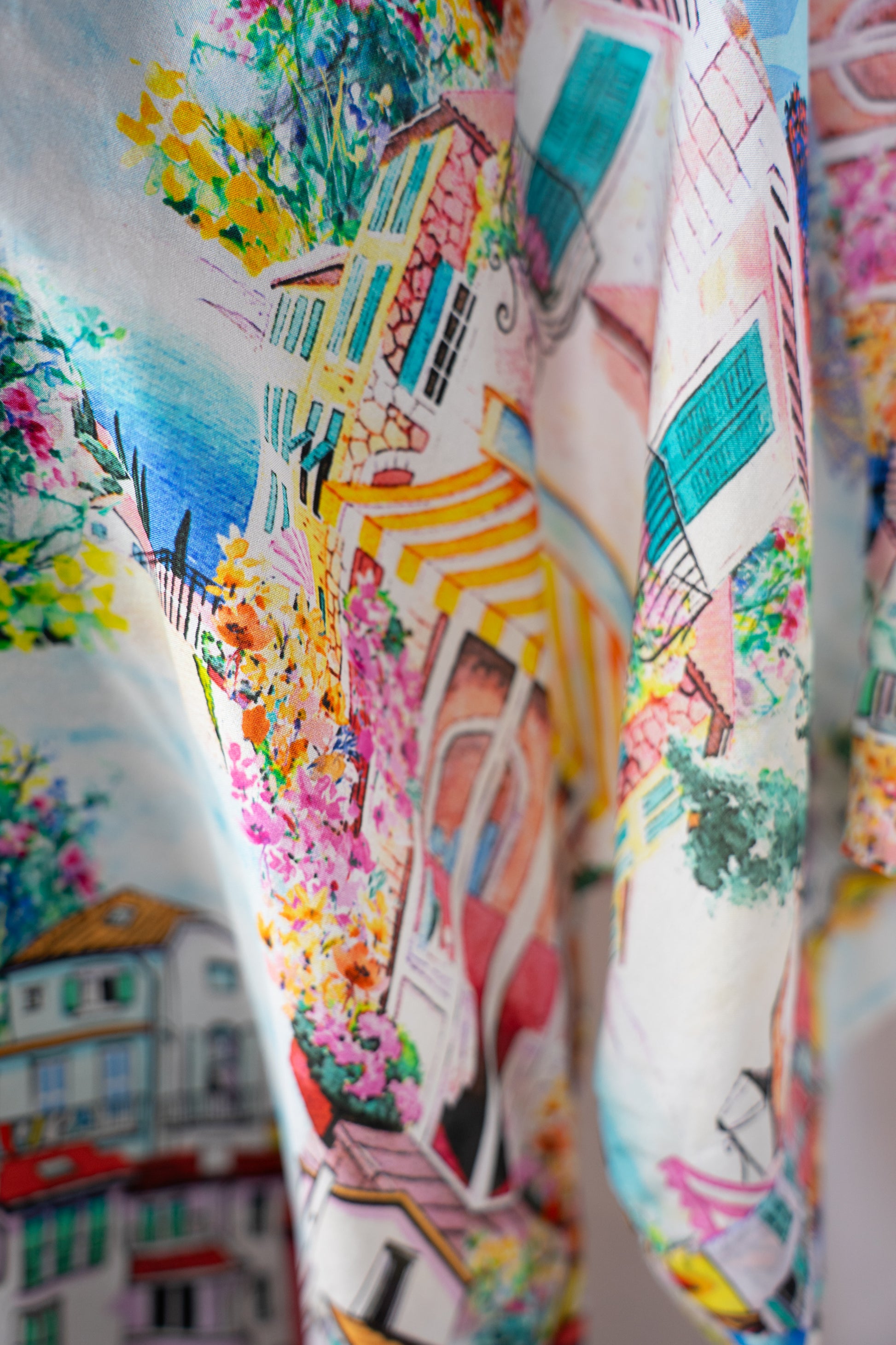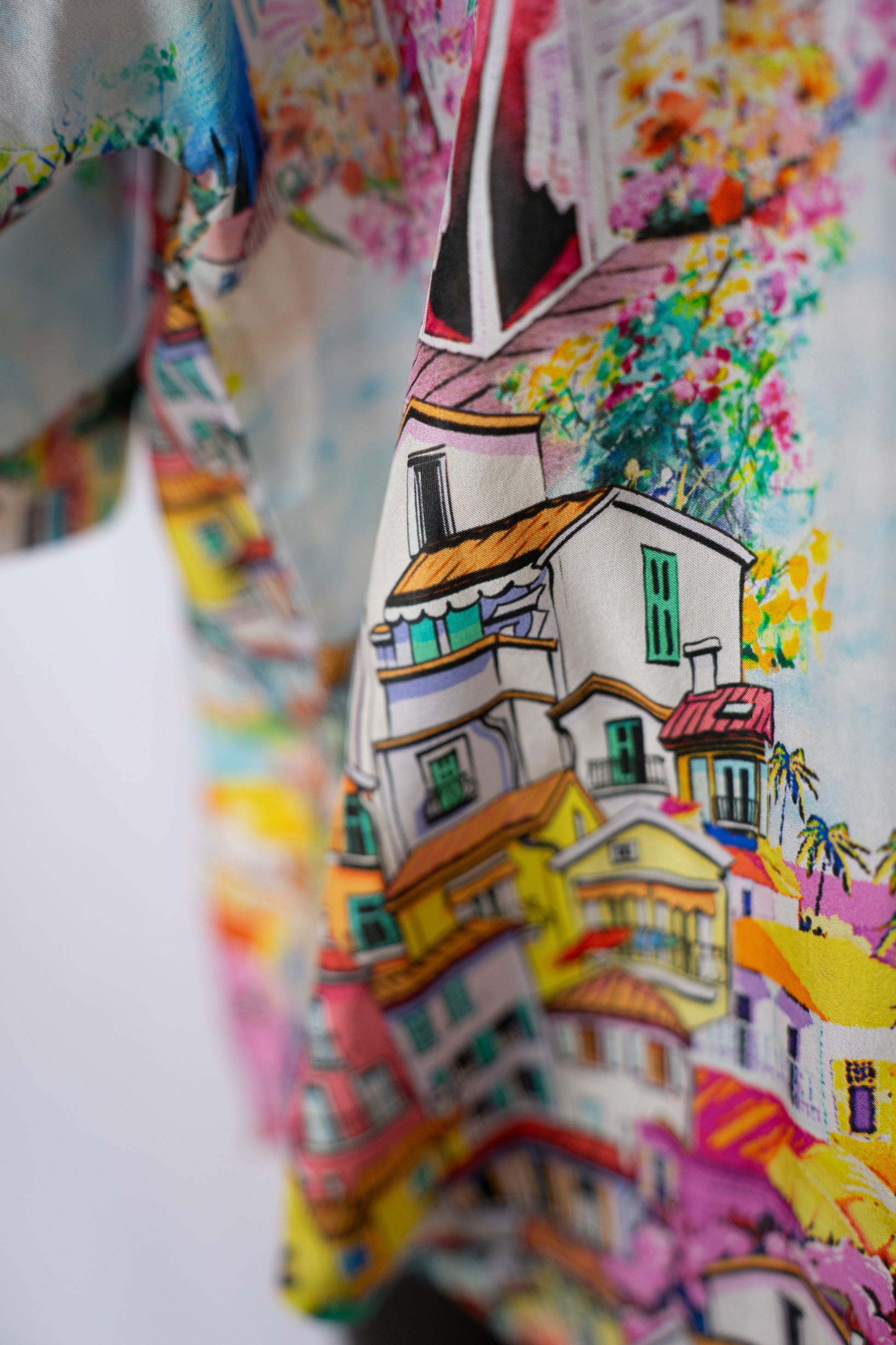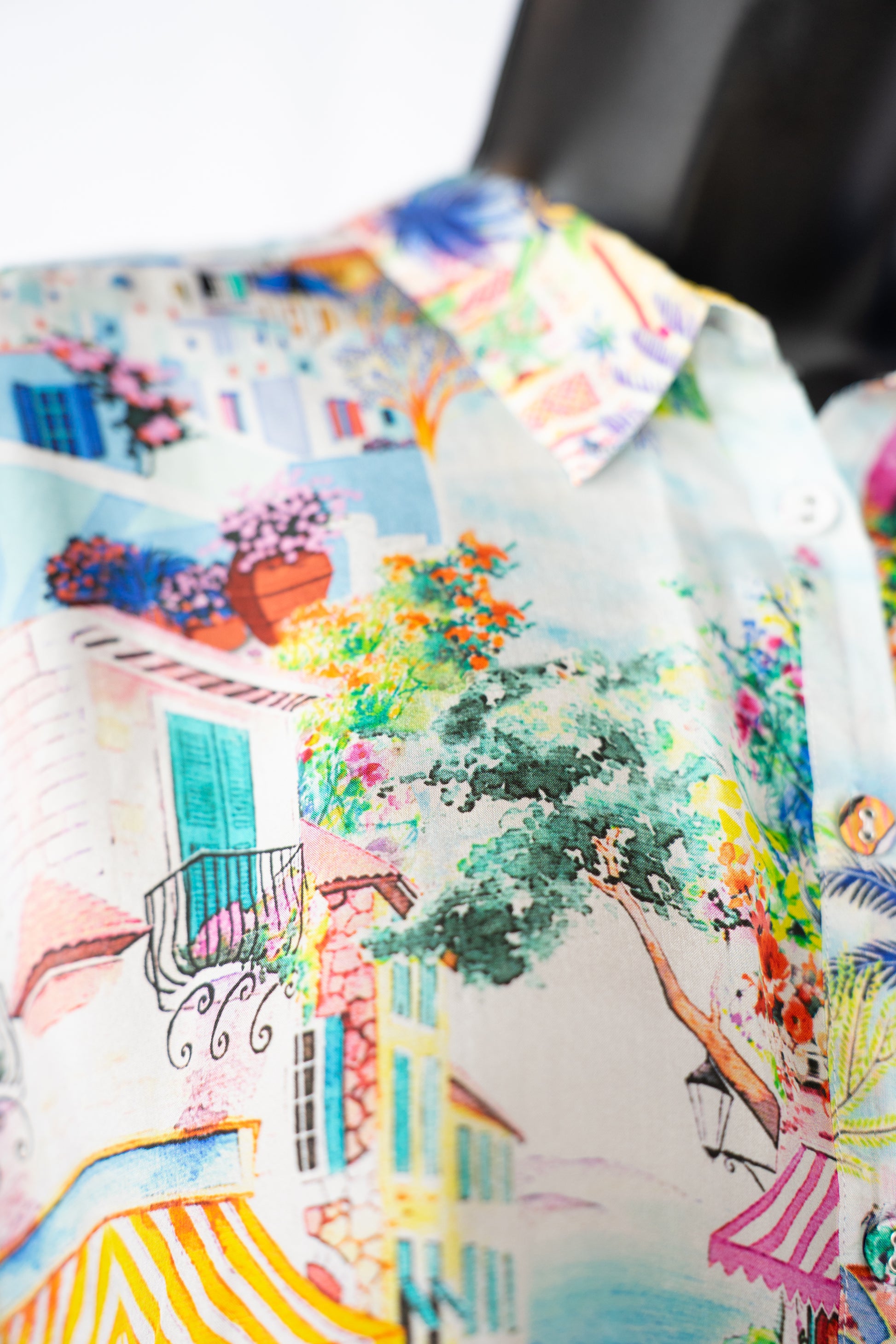 Johnny Was Silk Landscape Print Button Down Short Sleeve Blouse