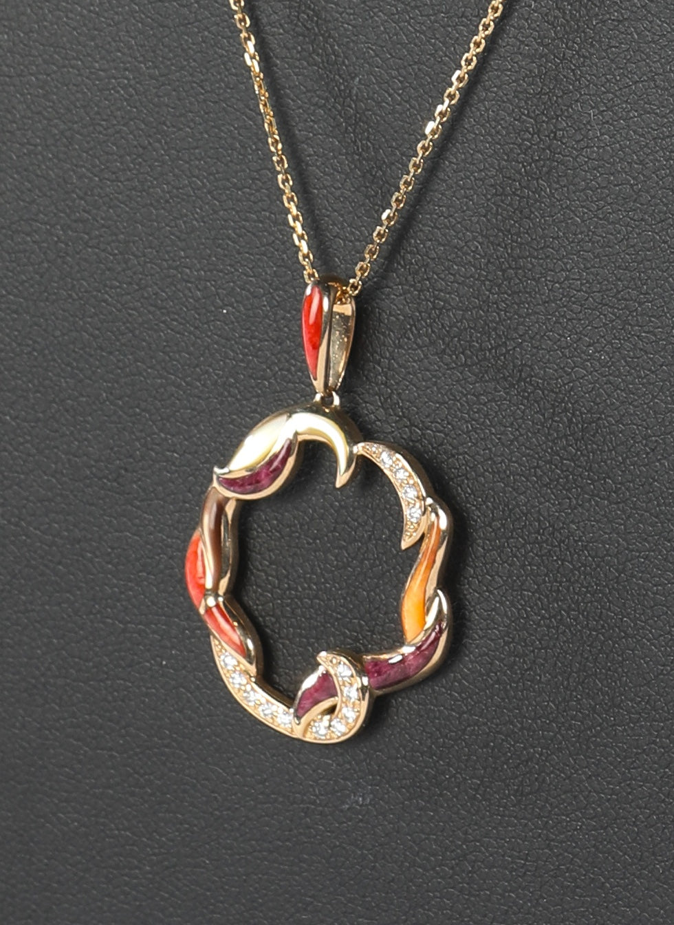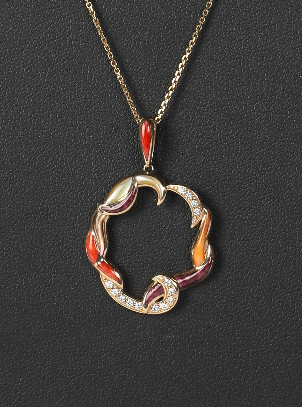 COMES WITH BOX - Kabana 14k Gold Orange, Purple, Mother of Pearl, & Diamond Circle Pendant with Unbranded Chain