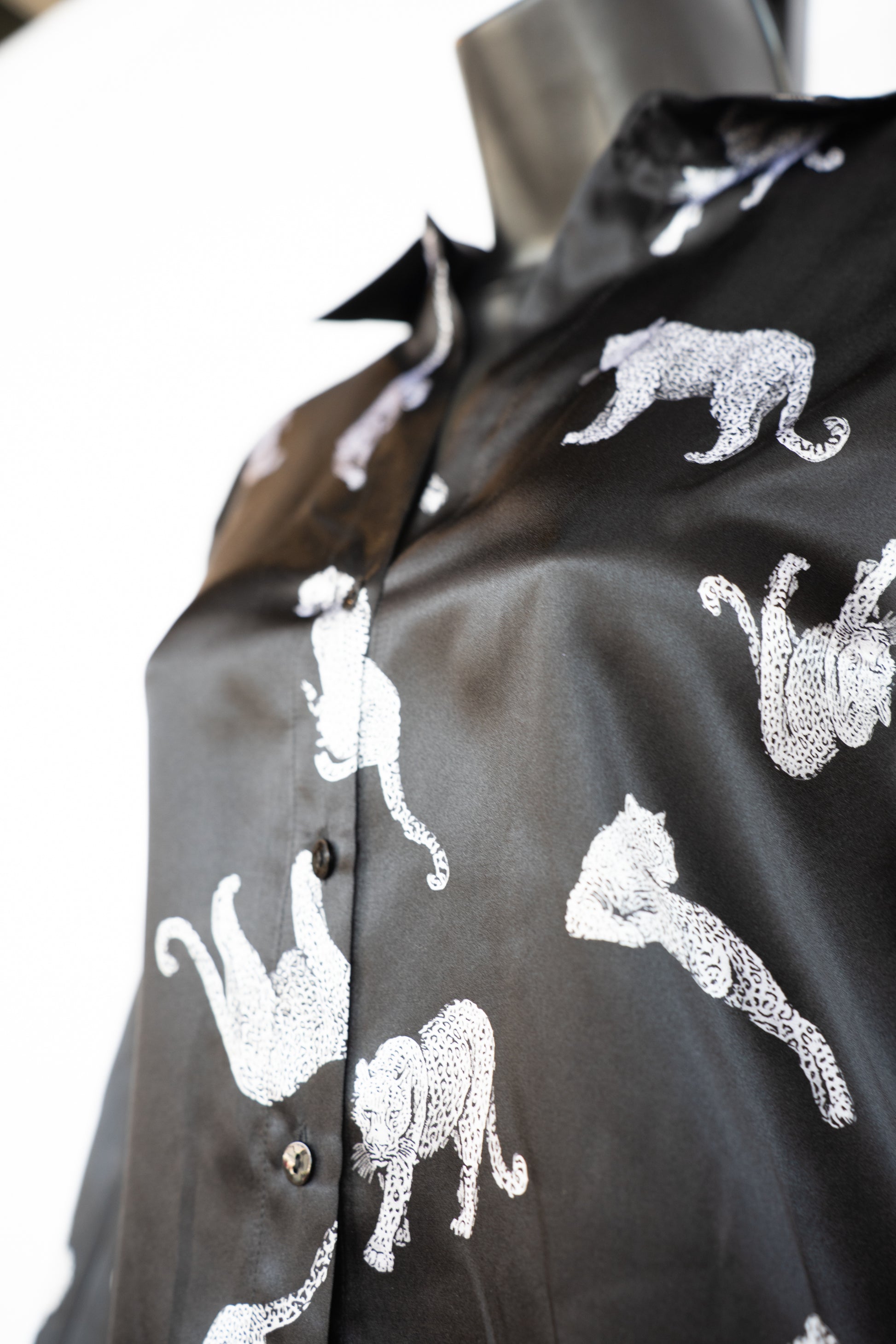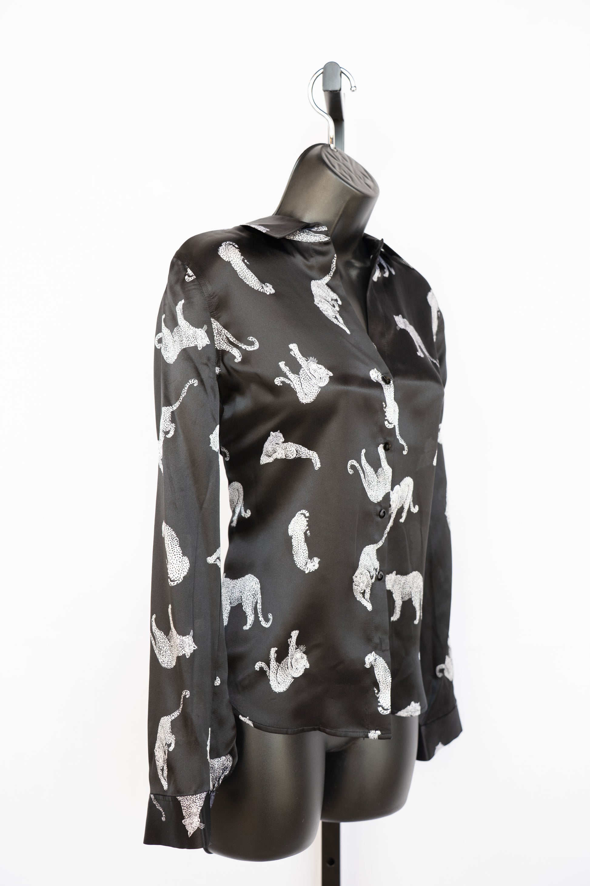 L'Agence Black Silk Long Sleeve Button Down Blouse w/ Leopards NWT