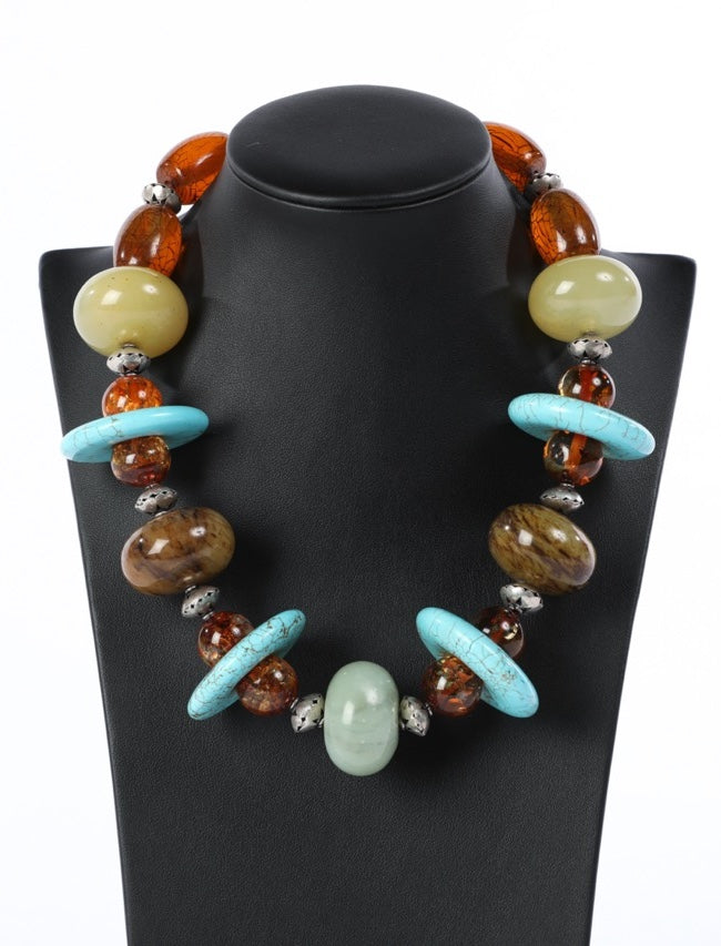 Large Beaded Necklace - Sterling Silver - Turquoise, Amber, & Other Gemstone